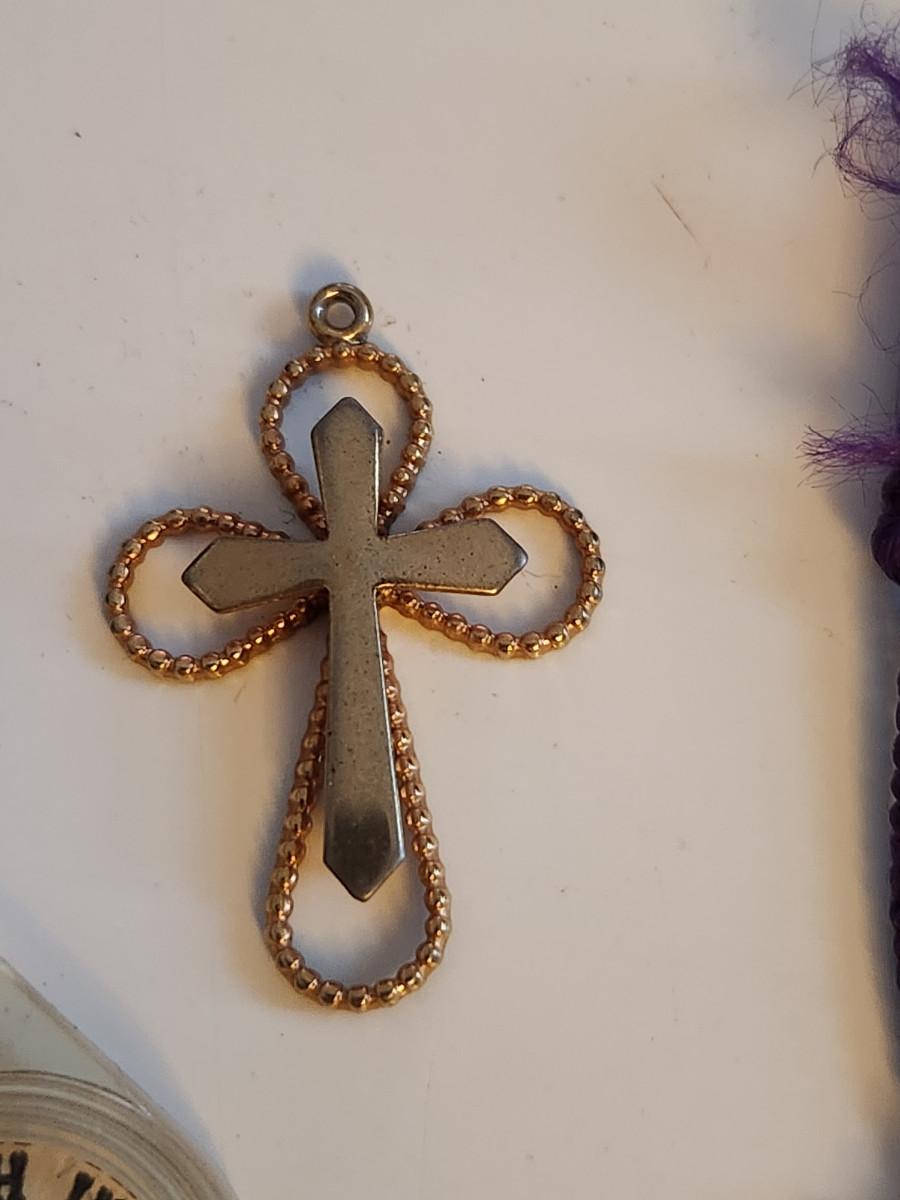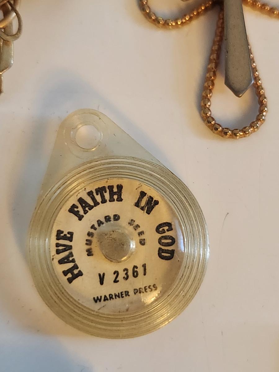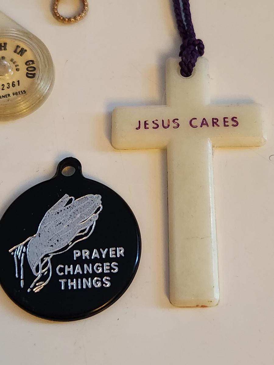 This lot is for a gathering of Vintage Religious Items. Includes crosses, praying hand and a mustard seed, plus a sweet Mary pin and a Madonna and Child necklace.