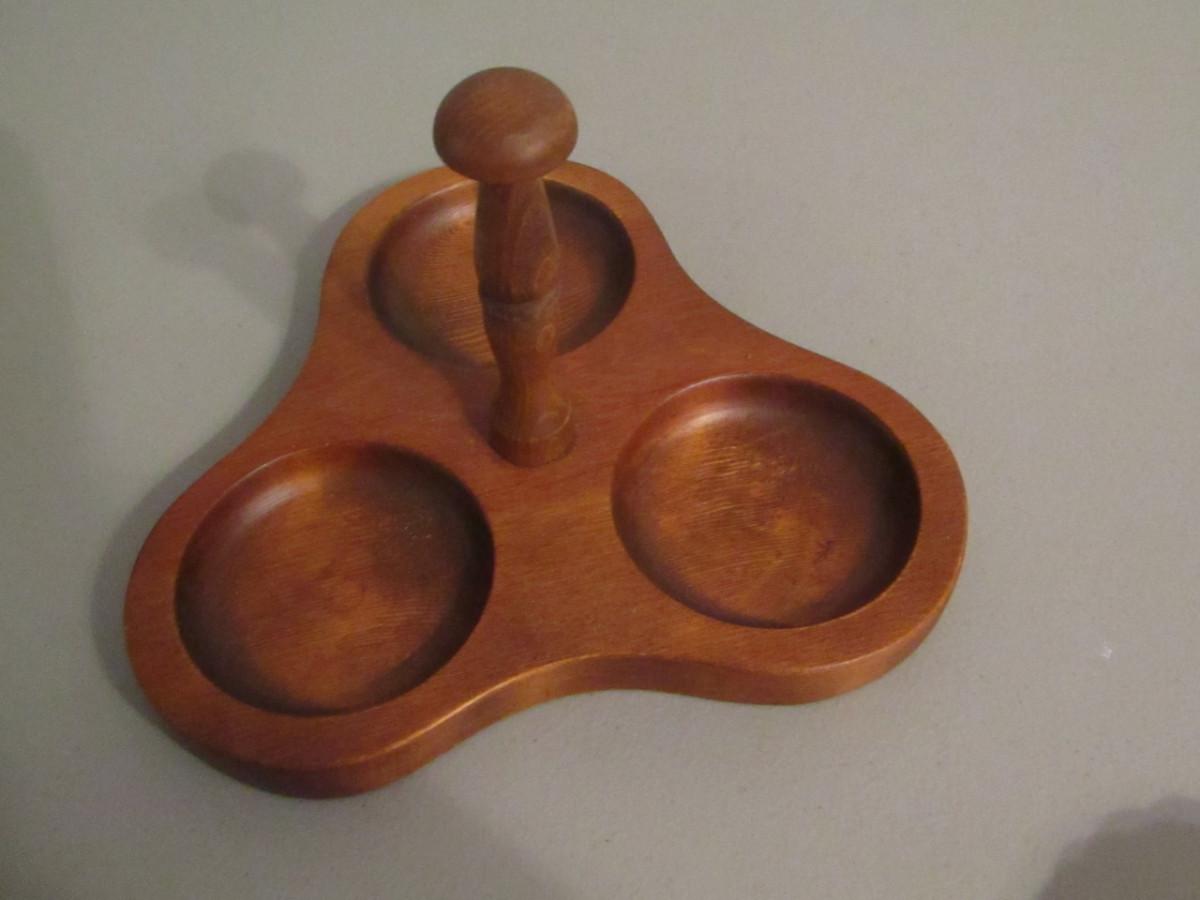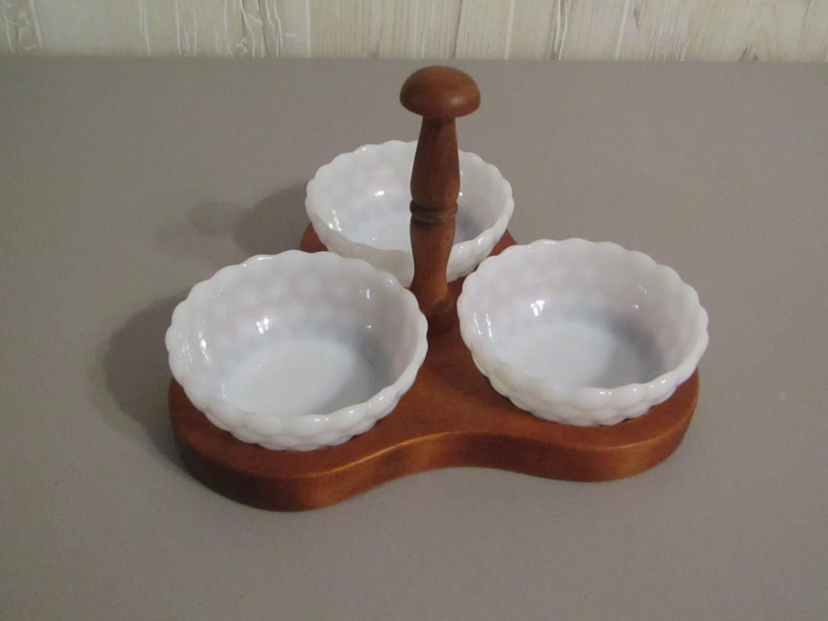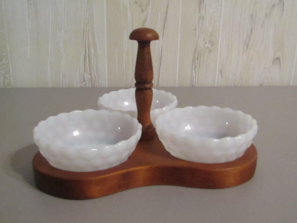 Vintage Relish Tray- Milk Glass Bowls with Wooden Caddy