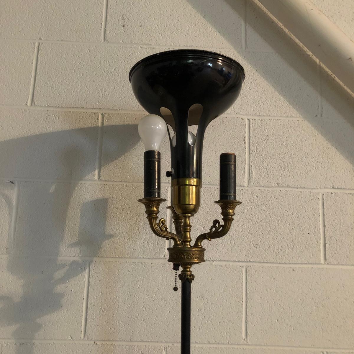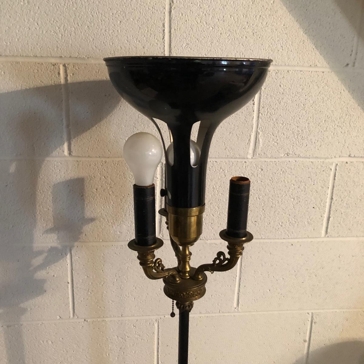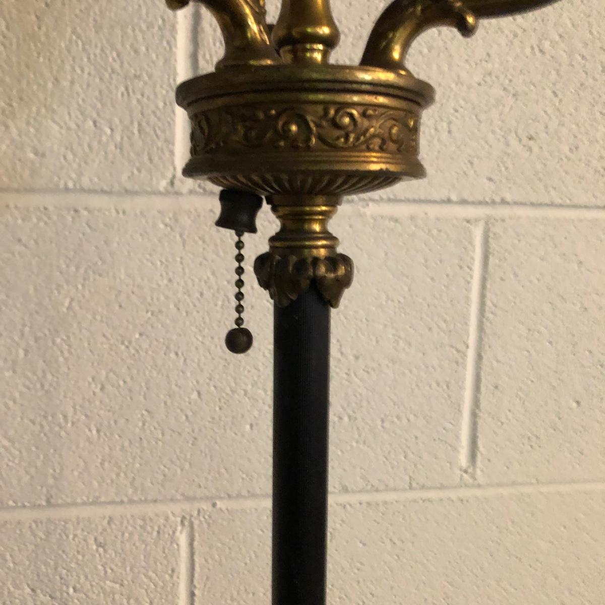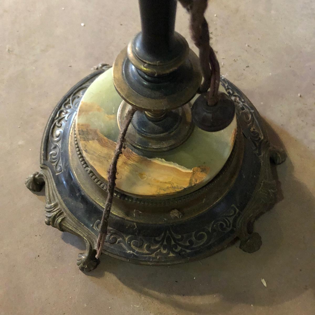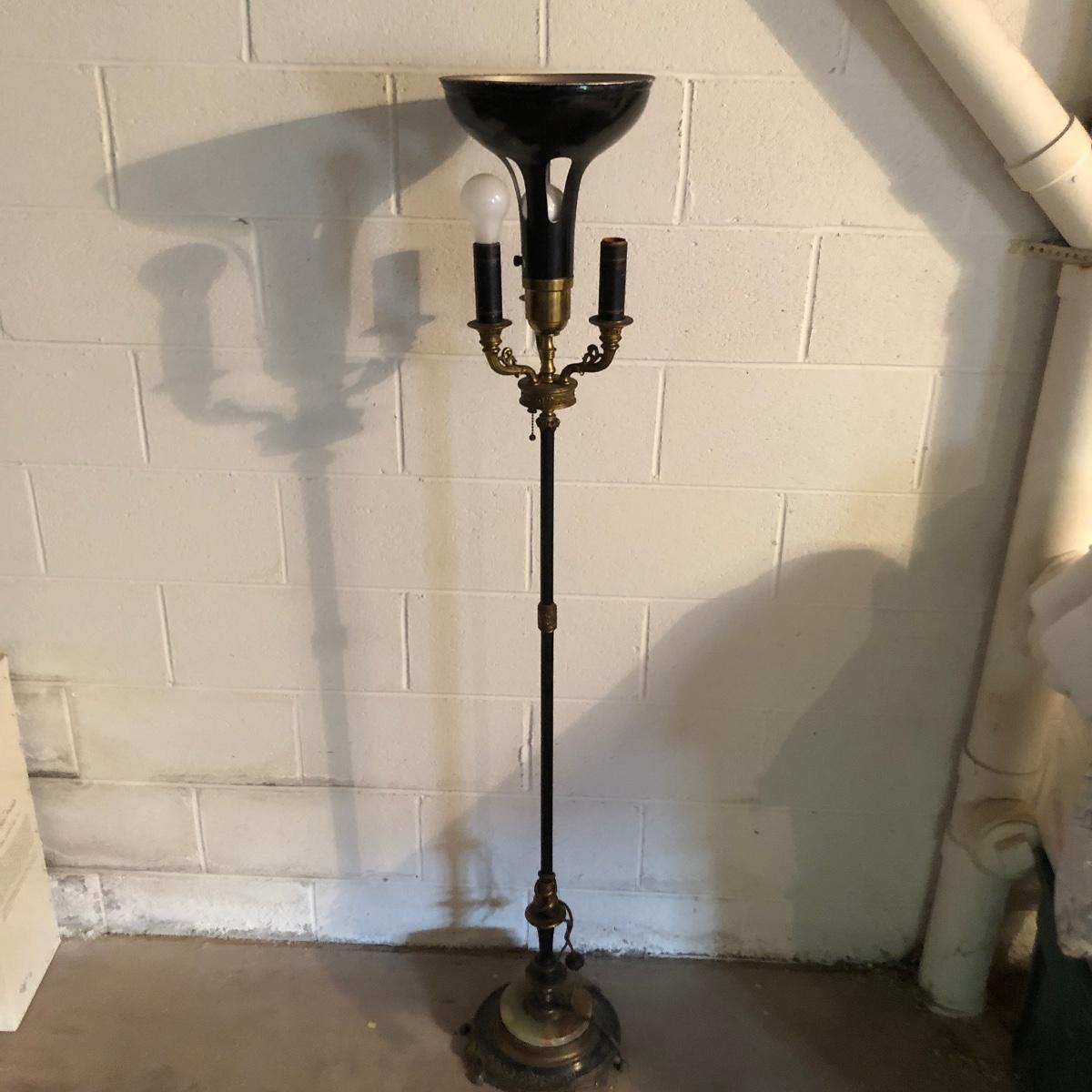 Lot includes a vintage Rembrandt brass and stone floor lamp. Lamp has the light sockets surrounding a center bulb with a closable shade. Light worked when tested. Lamp measures 11”D base x 62” tall.
