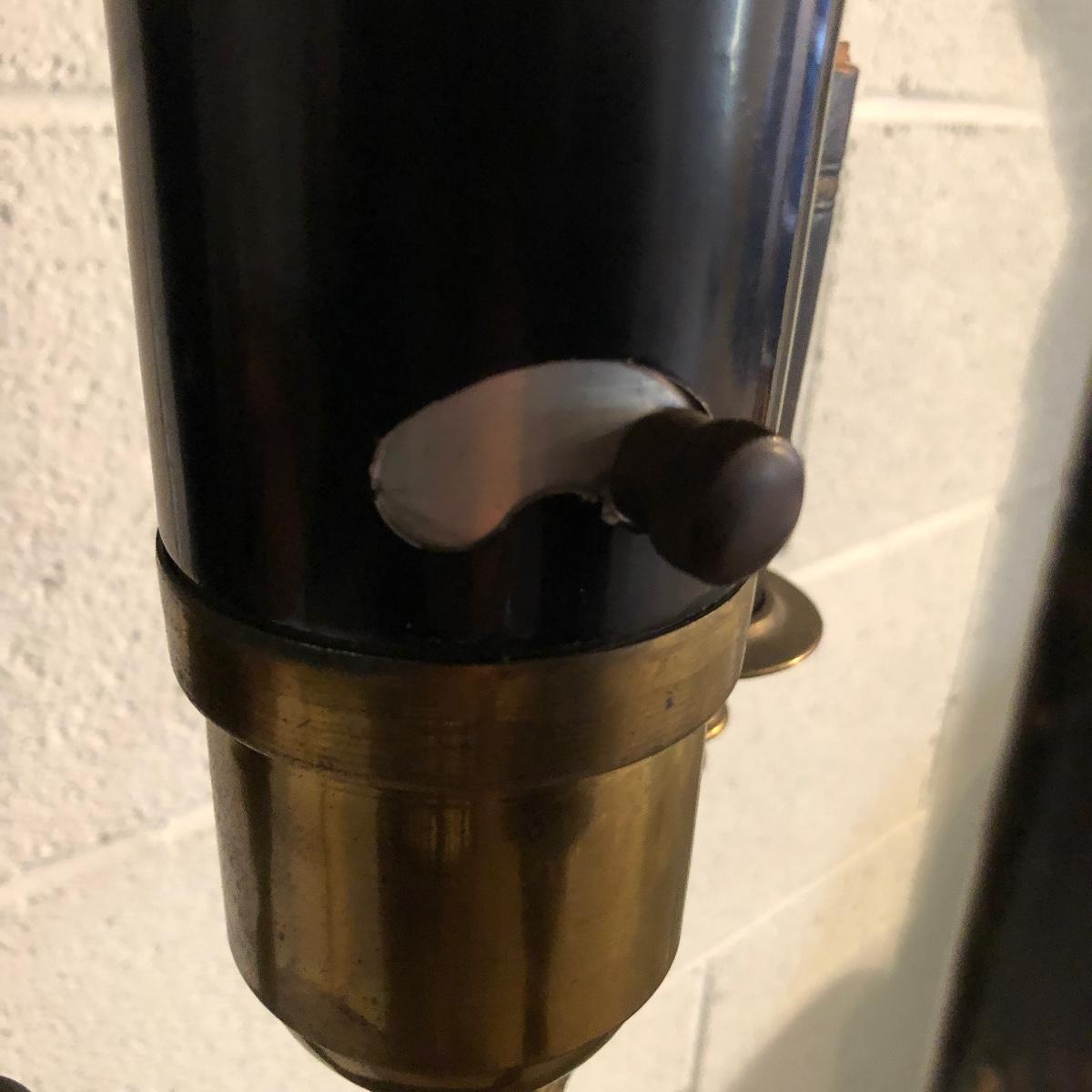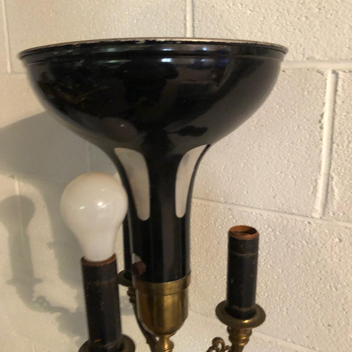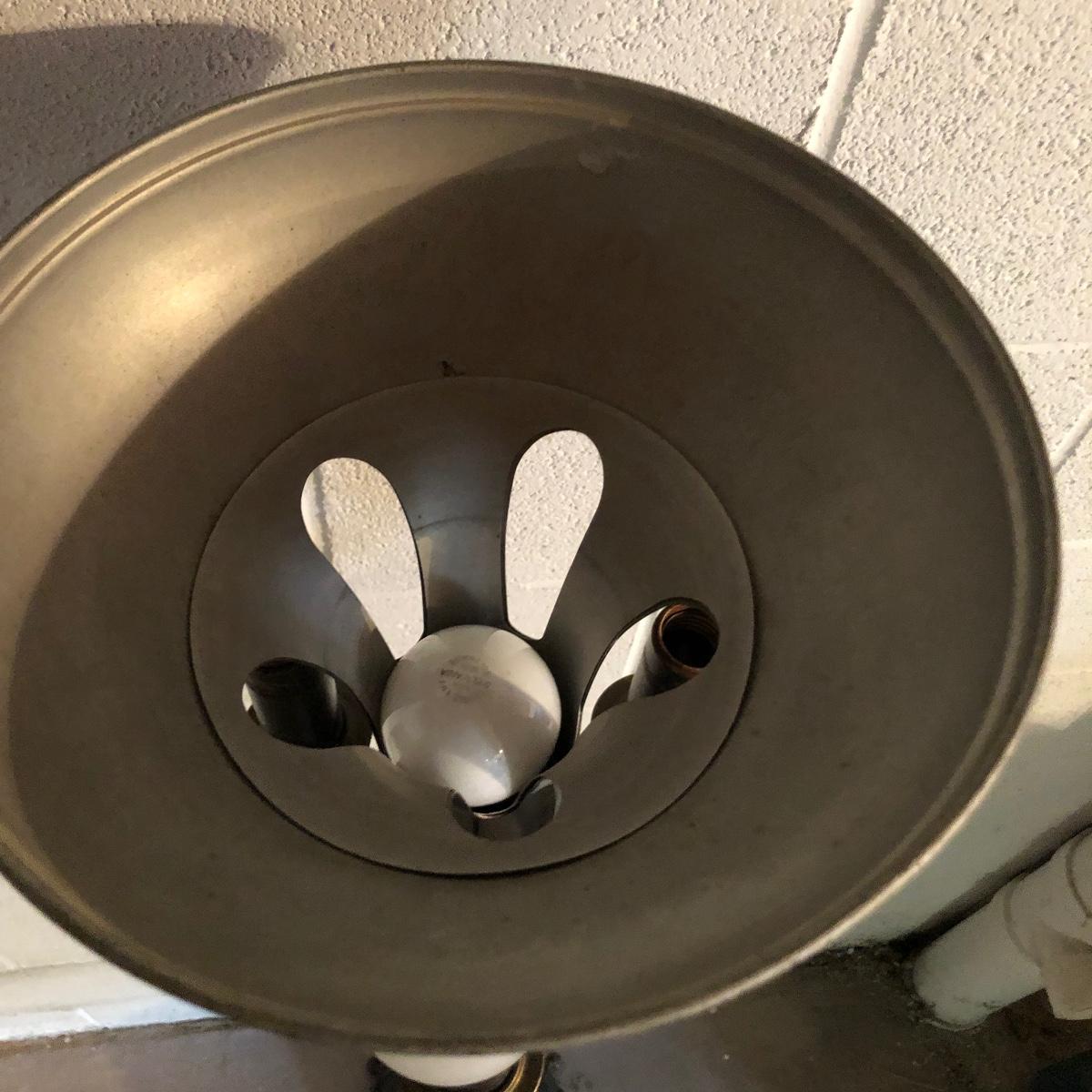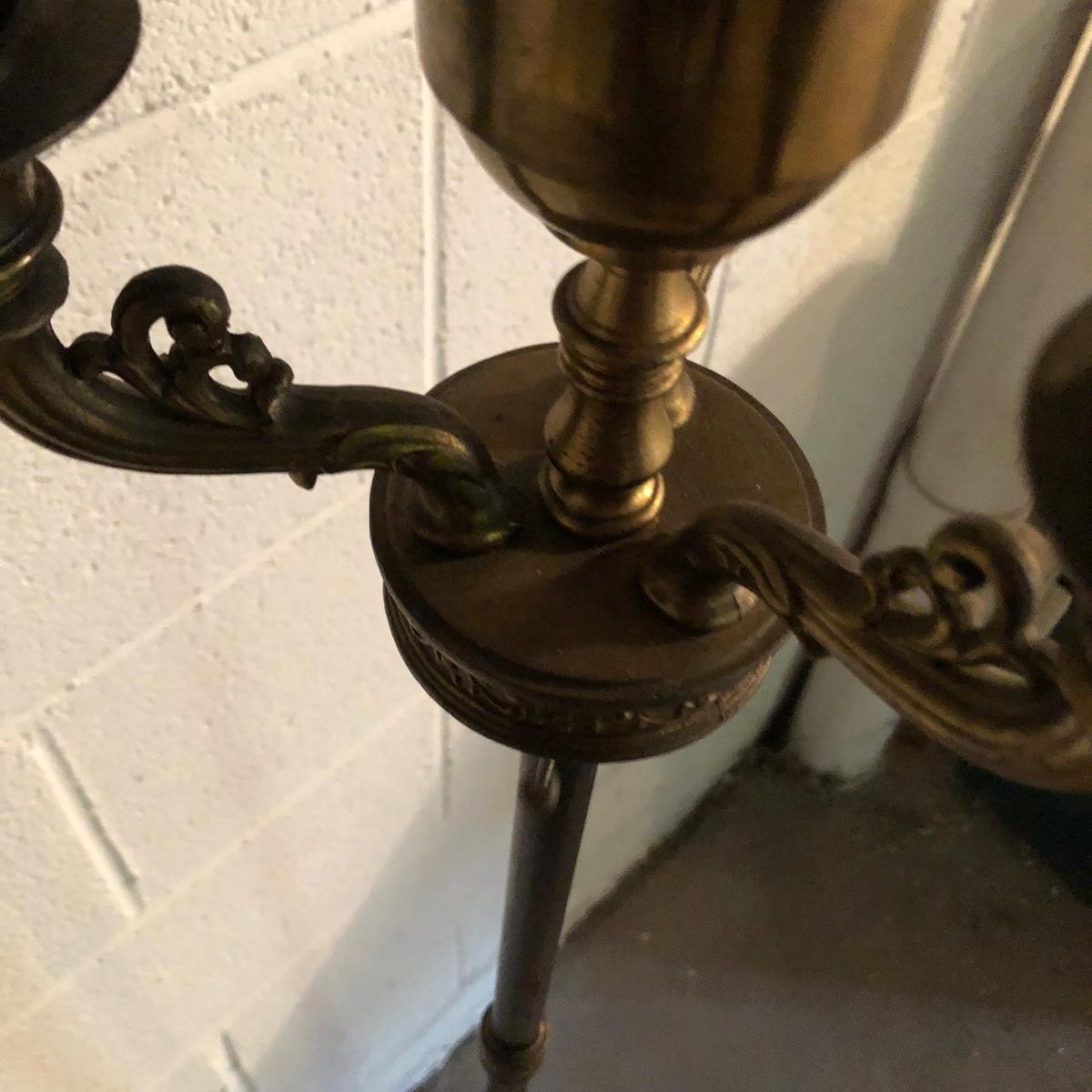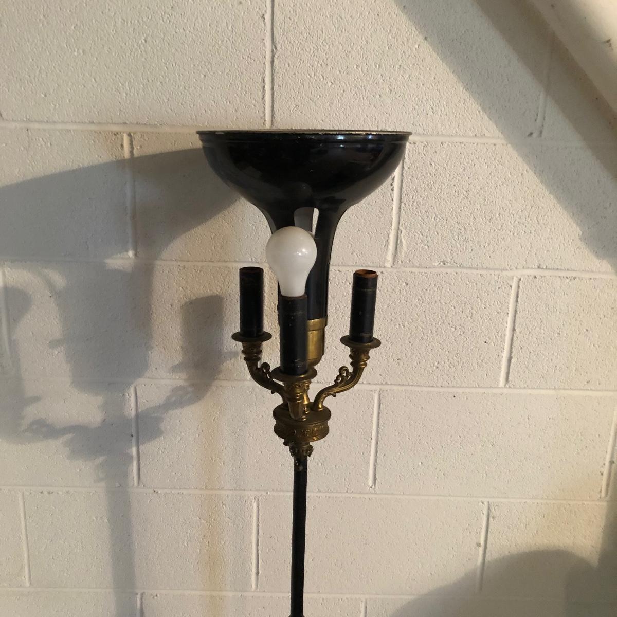 Lot includes a vintage Rembrandt brass and stone floor lamp. Lamp has the light sockets surrounding a center bulb with a closable shade. Light worked when tested. Lamp measures 11”D base x 62” tall.