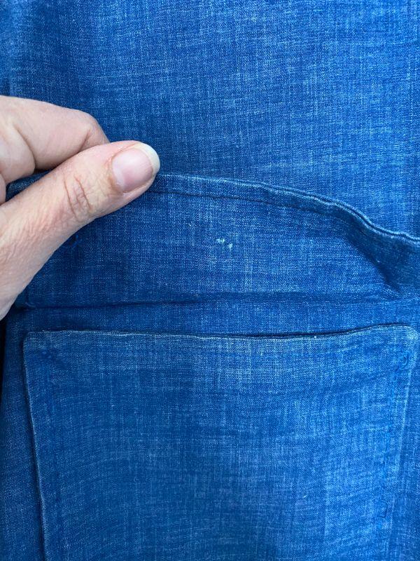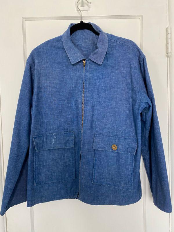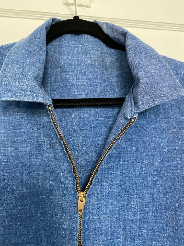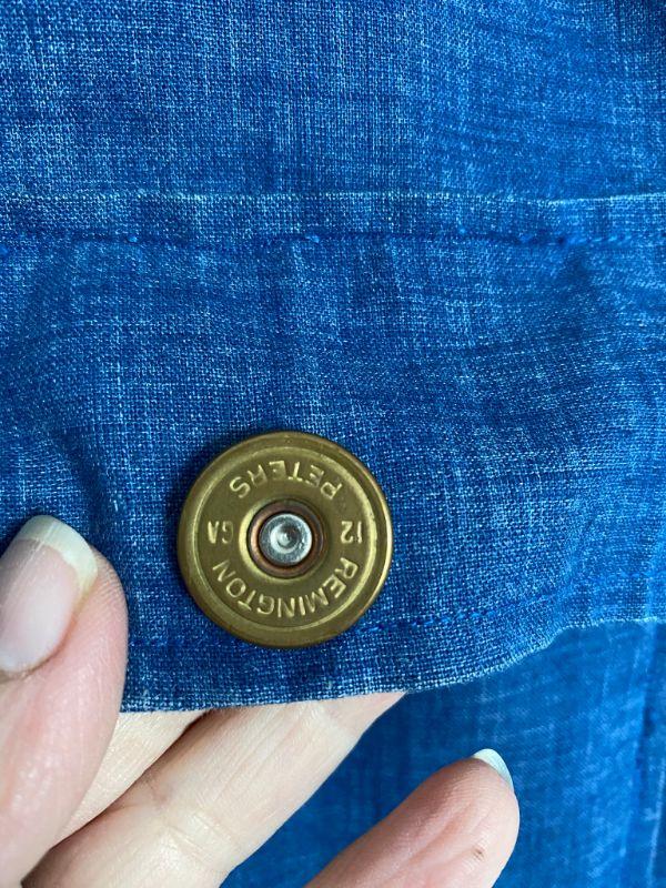 Vintage blue denim twill zipper jacket. No tags but the button on pocket flap is a Remington 12 GA bullet replica end. Not sure if this is an actual shooting jacket or homemade. In good vintage condition, other pocket is missing the button.