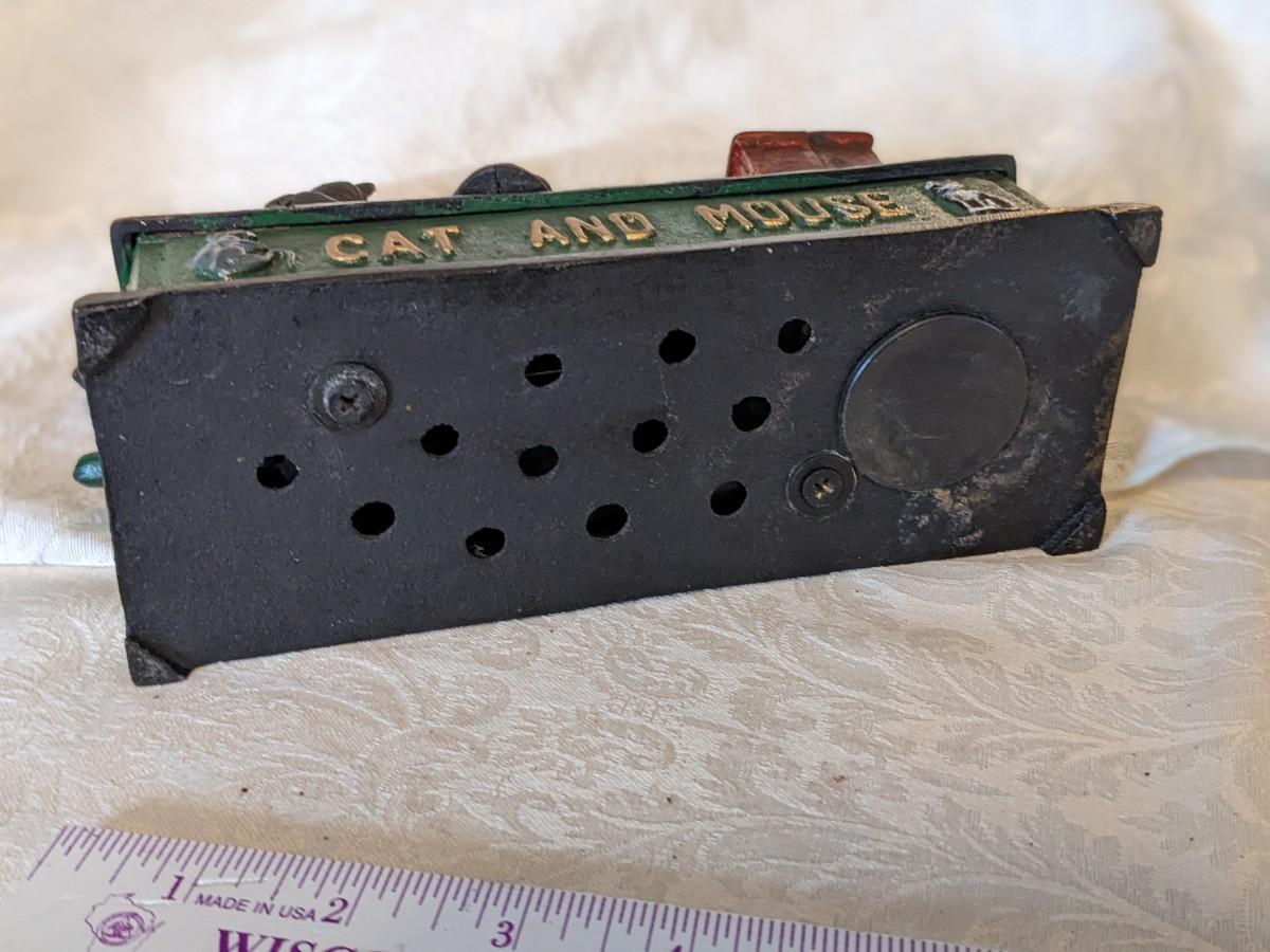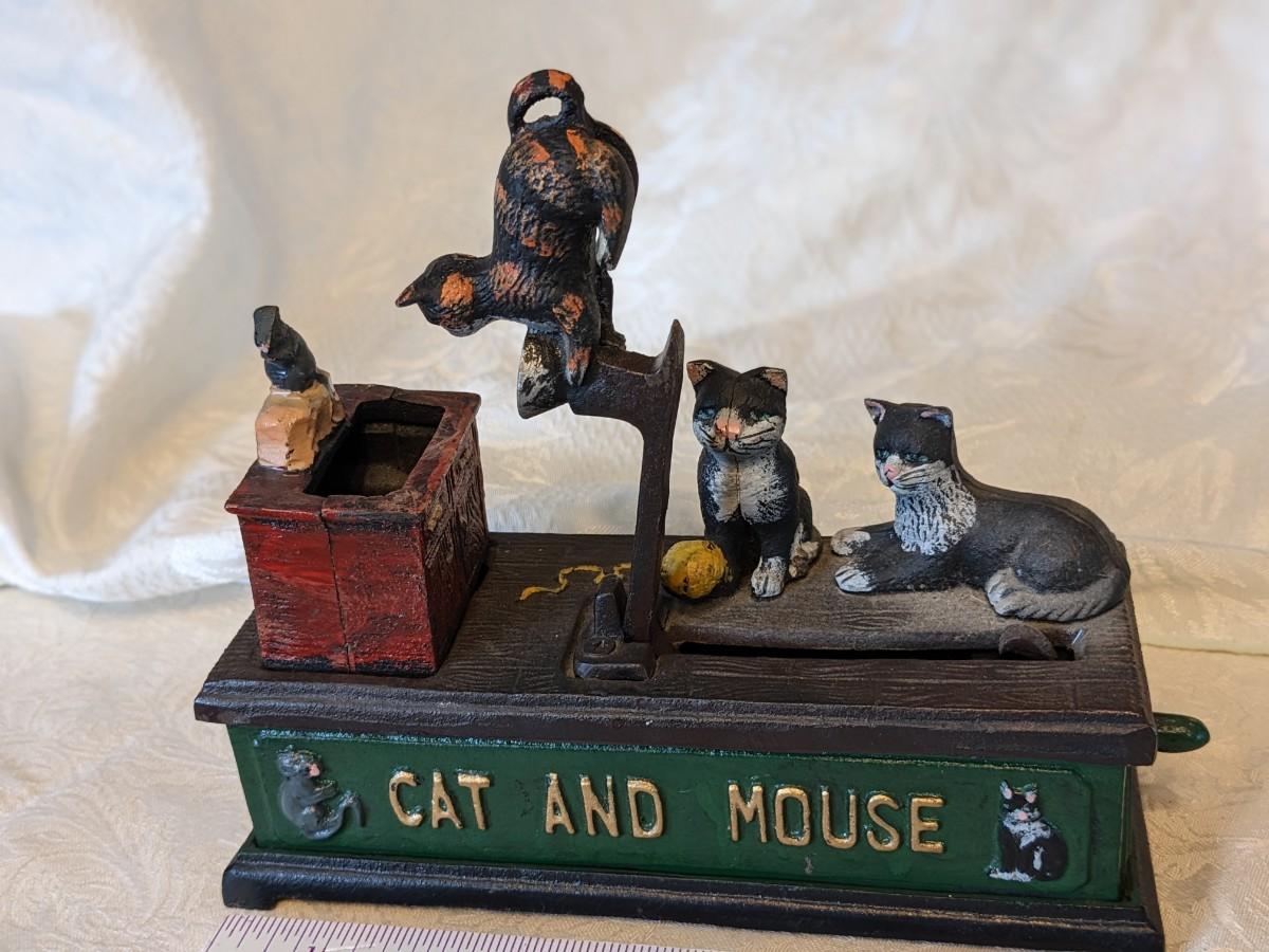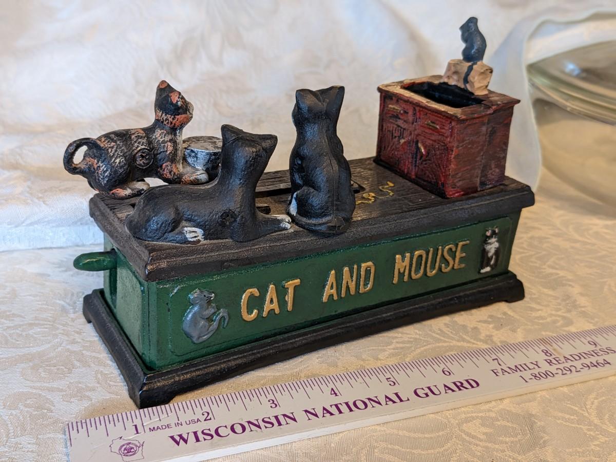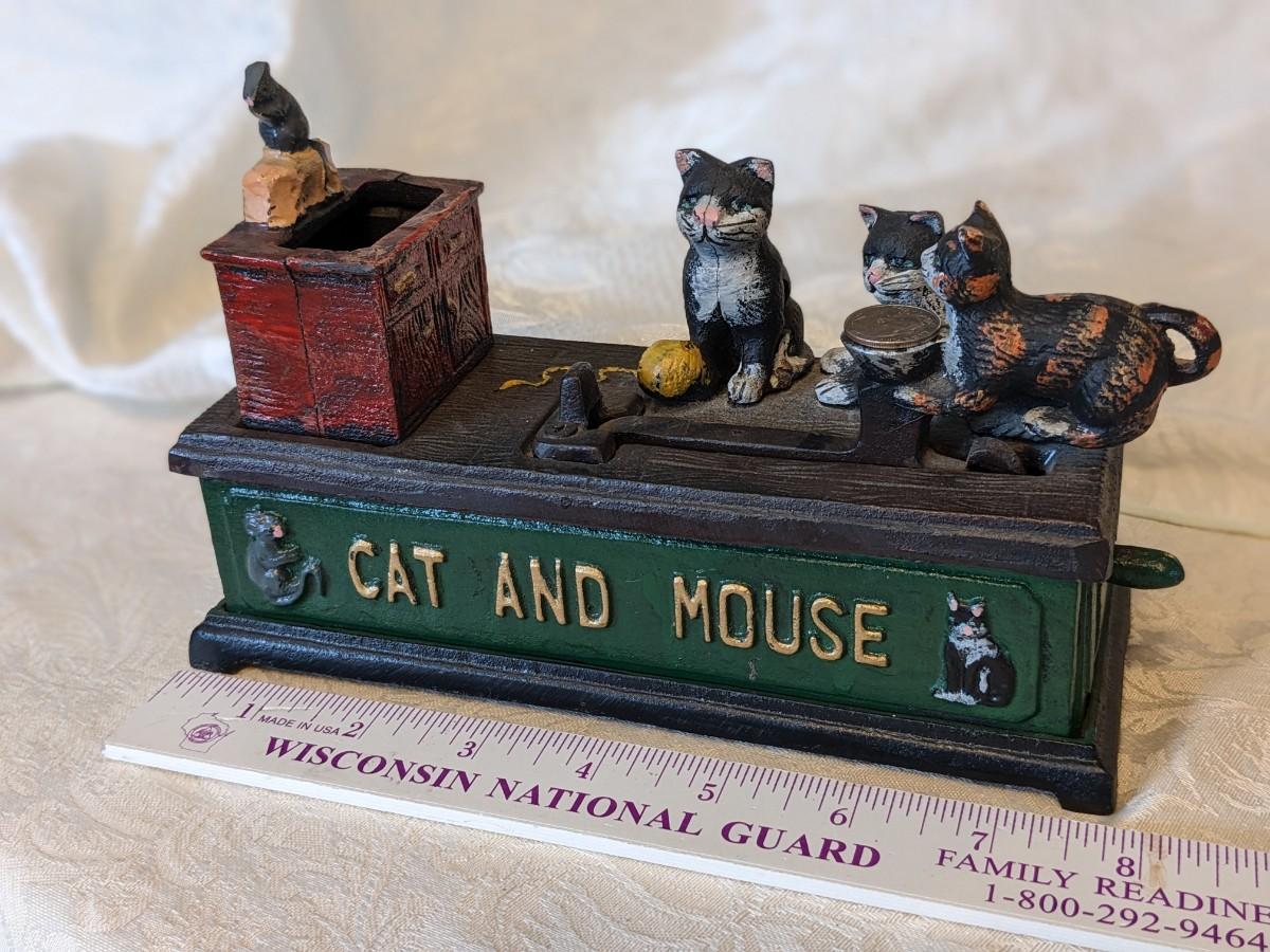 Vintage Reproduction Cast Iron Cat and Mouse Mechanical Coin Bank