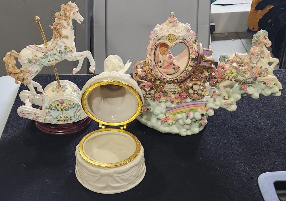 Vintage Resin Rocking Carousel Horse Music Box Sound of Music & Carousel Horse & Carriage Music Box Frank Sinatra. Plus Vintage Angel Jewelry box.