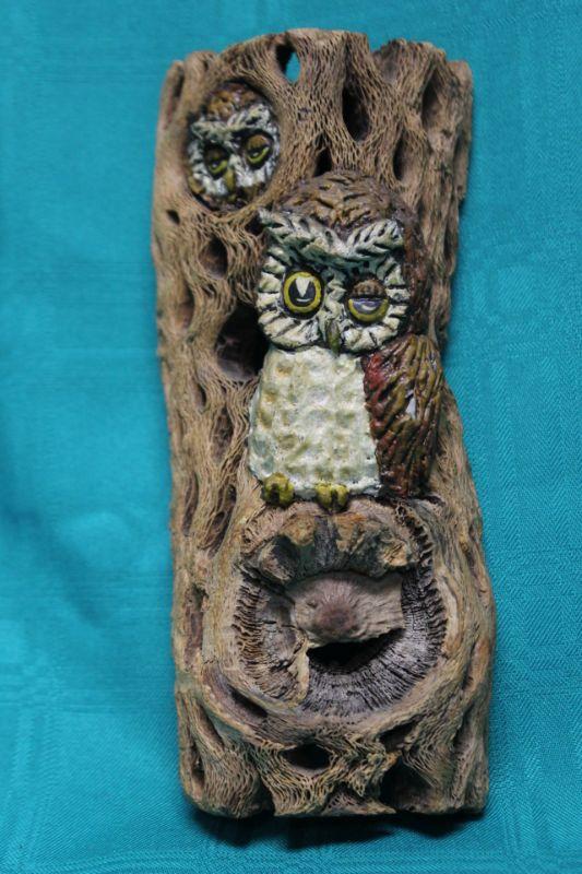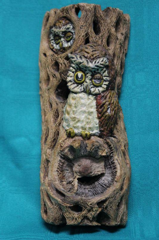 Vintage Owl Wall Art. Owls seem to be a painted resin set into real wood. Partial original tag on the back.