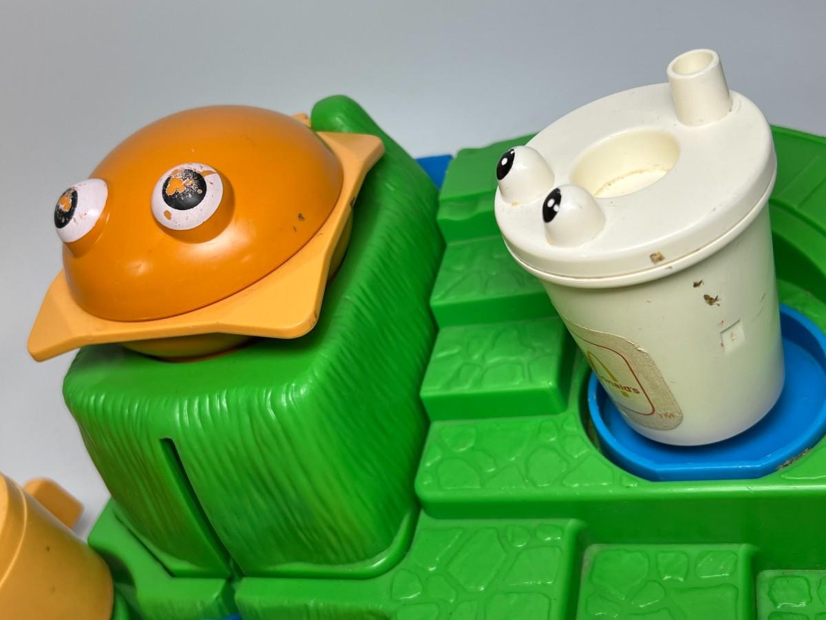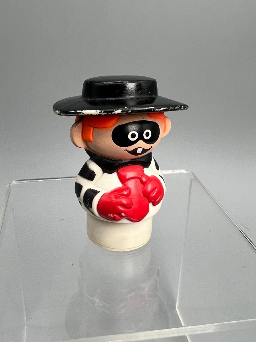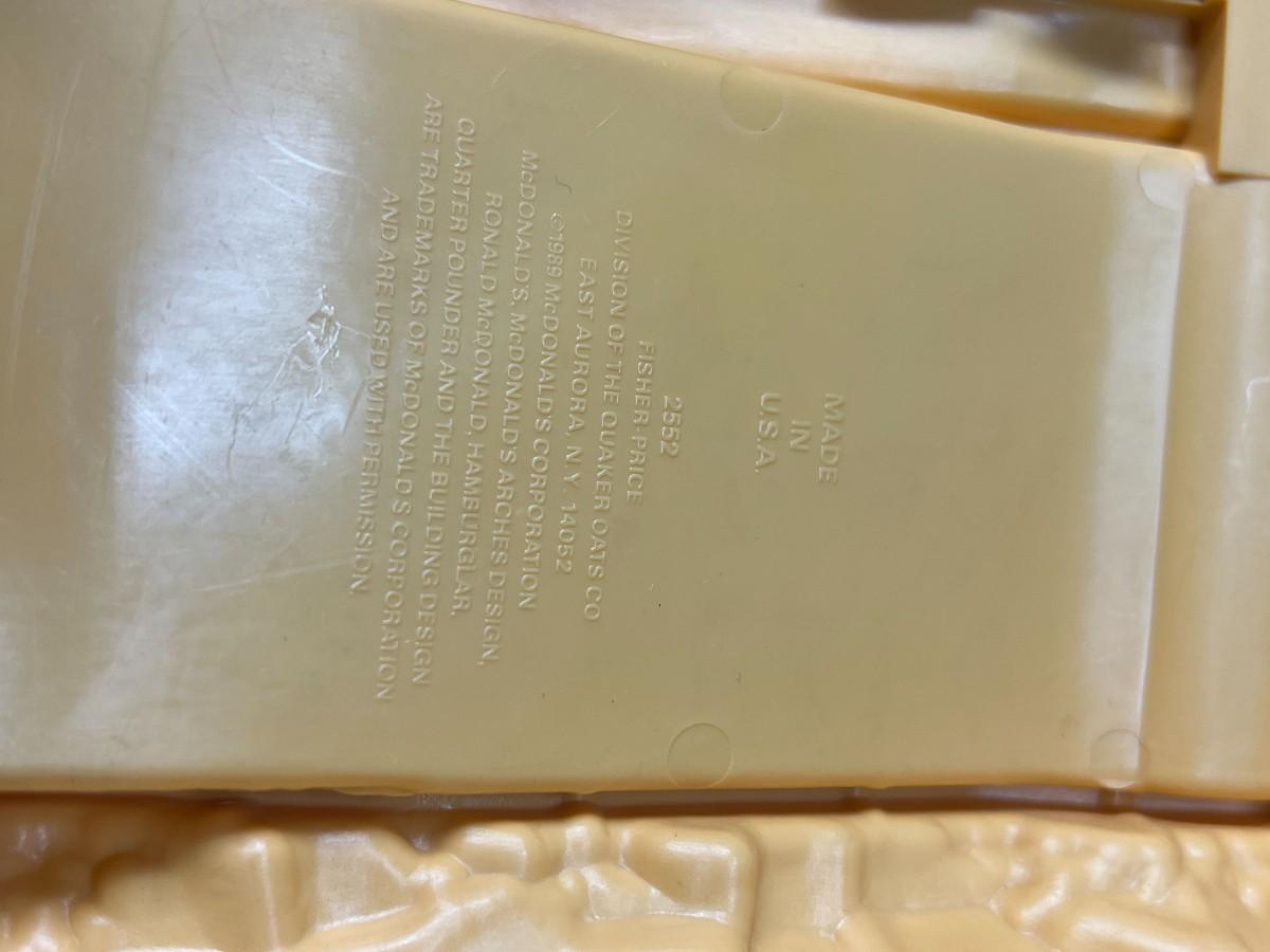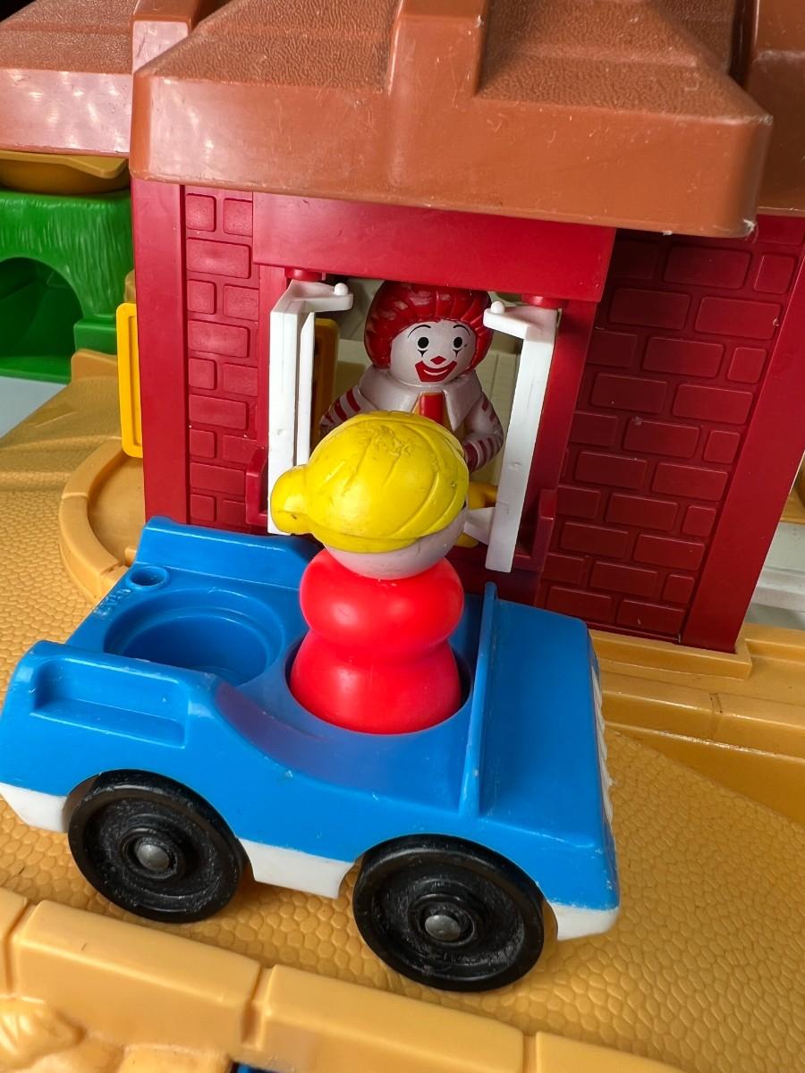 Retro 1990 Fisher Price Little People playset #2552 McDonald's Restaurant. Officially licensed set looks to be complete. Included with the base is the following Little People - Ronald McDonald, the Hamburgler, Light red mom with fancy eyes and blonde bun, a Yellow boy with black molded plastic hair, and an Orange girl with a light brown sculpted bob. Set came with a blue and white car, the Fry coaster, a Golden arches sign, and a trash bin. In good condition, has been played with. Little to no fade, stickers and decals are still good. Does not come with original box.