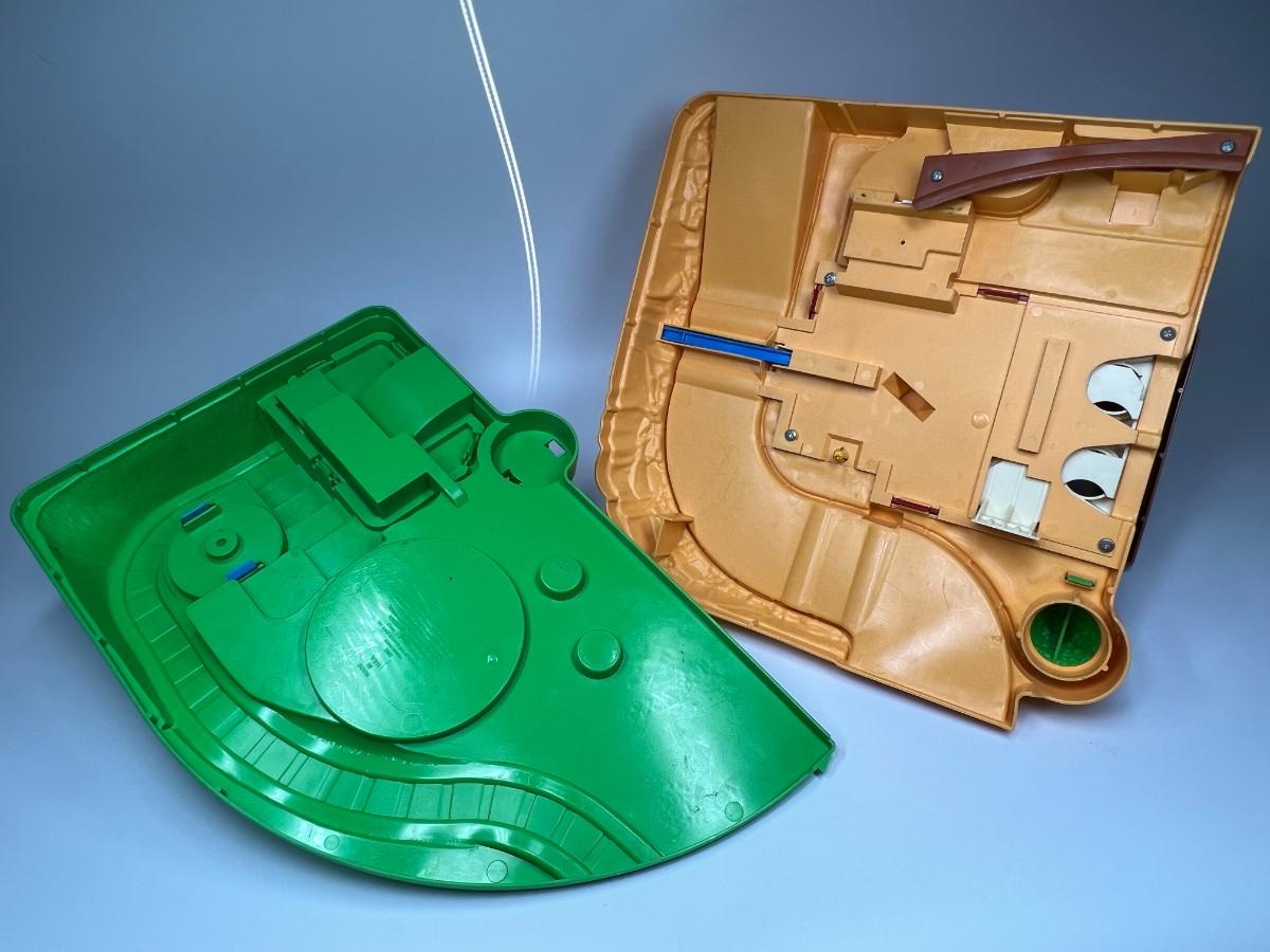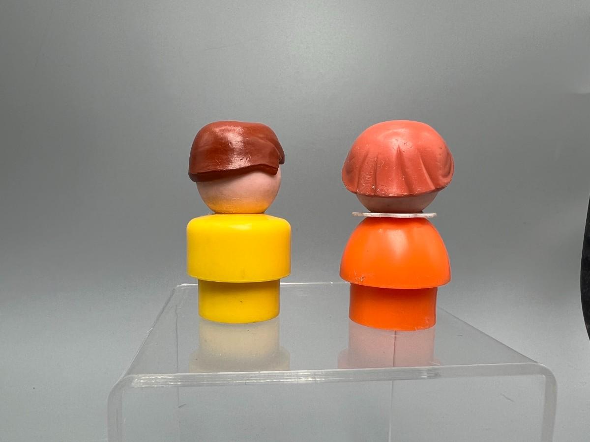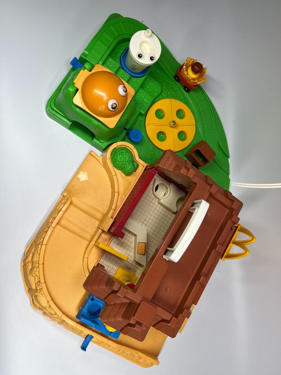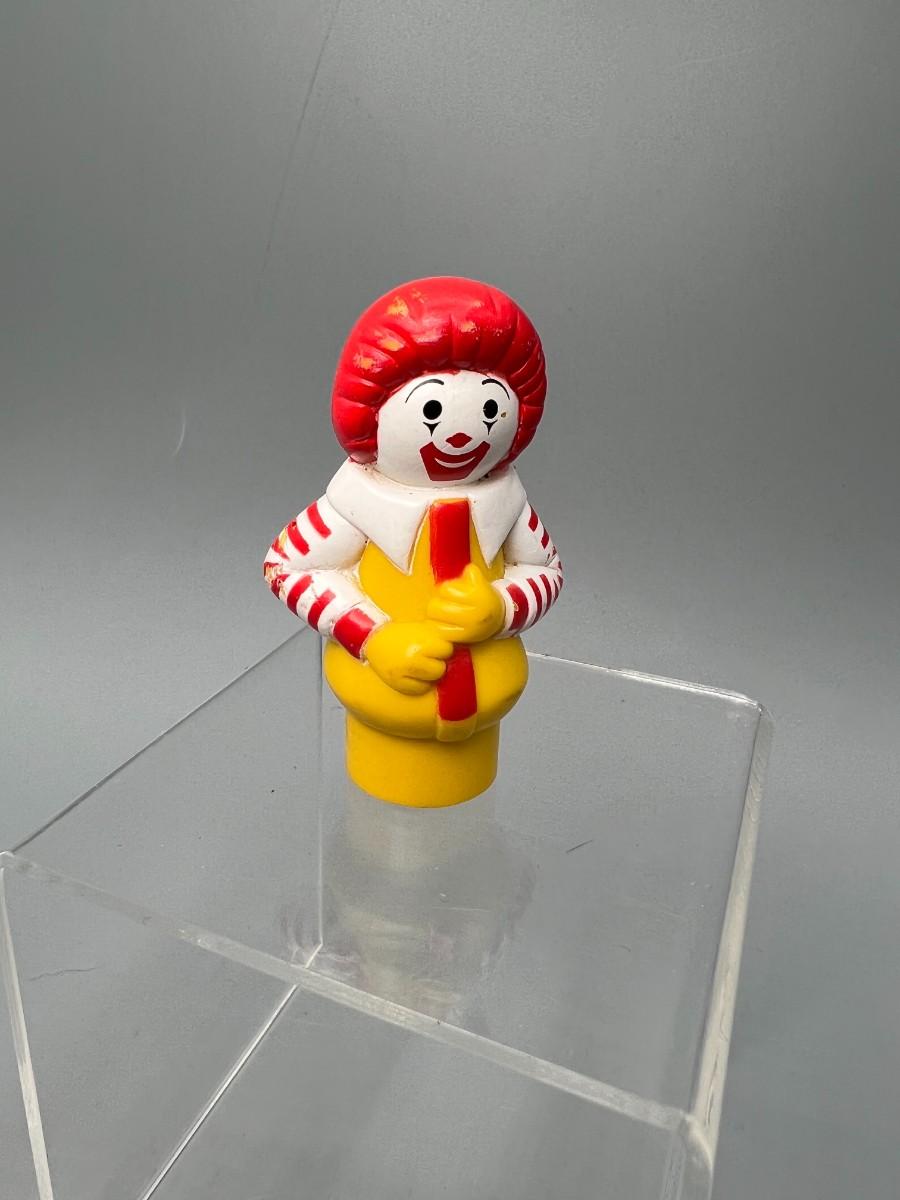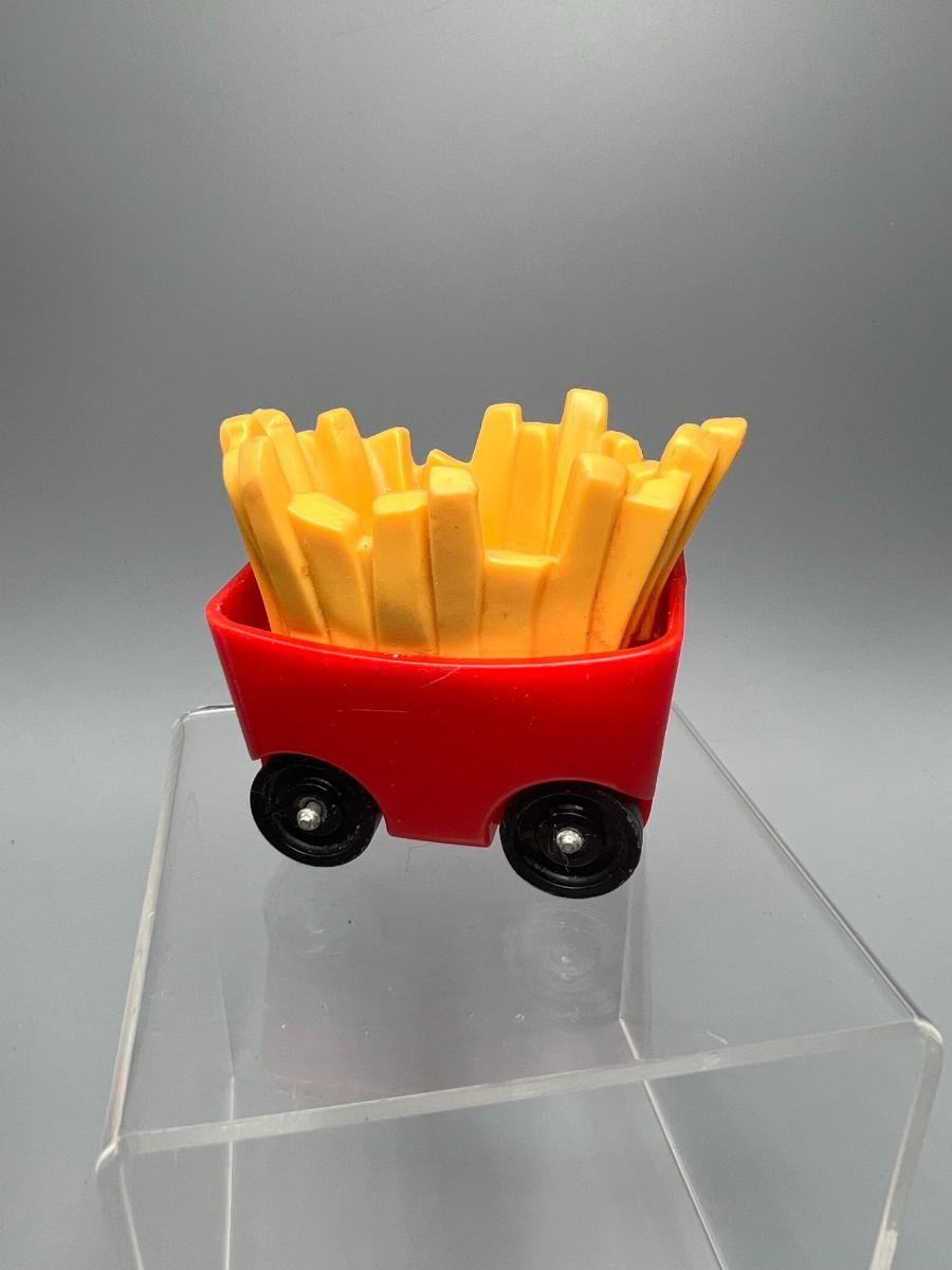 Retro 1990 Fisher Price Little People playset #2552 McDonald's Restaurant. Officially licensed set looks to be complete. Included with the base is the following Little People - Ronald McDonald, the Hamburgler, Light red mom with fancy eyes and blonde bun, a Yellow boy with black molded plastic hair, and an Orange girl with a light brown sculpted bob. Set came with a blue and white car, the Fry coaster, a Golden arches sign, and a trash bin. In good condition, has been played with. Little to no fade, stickers and decals are still good. Does not come with original box.