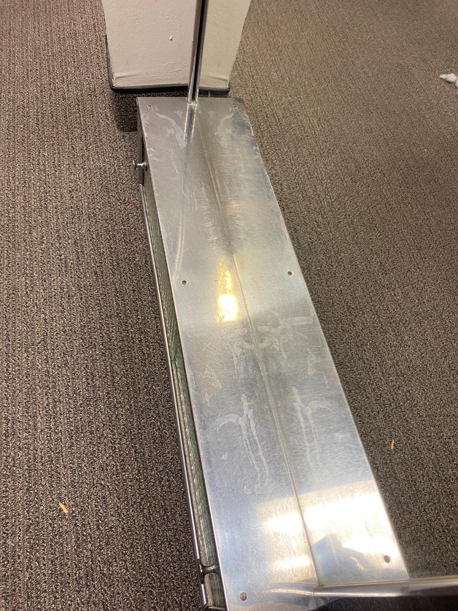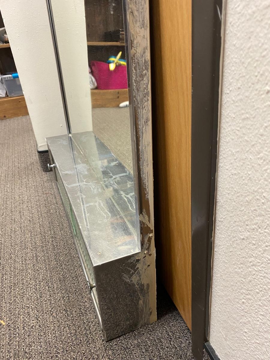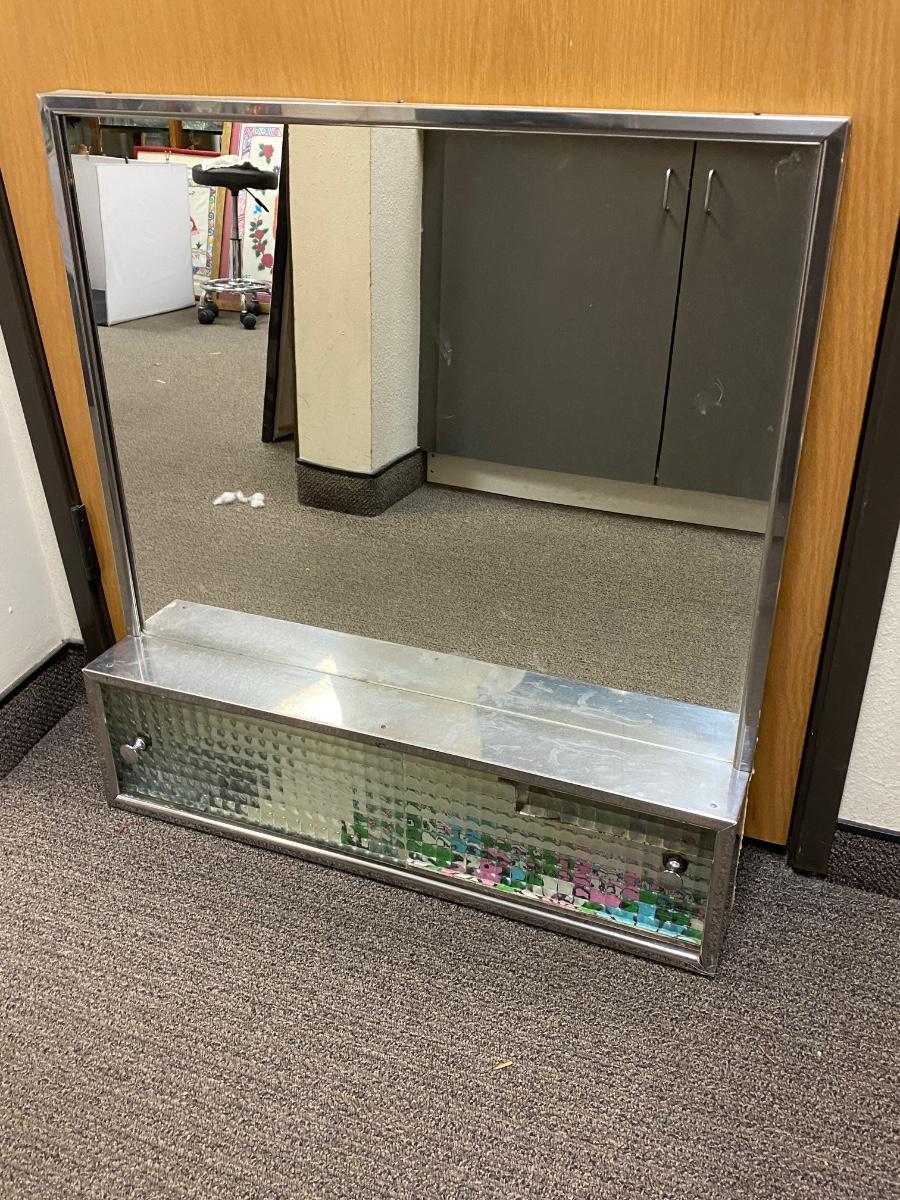 Retro bathroom vanity mirror with textured glass medicine cabinet bottom shelf. In good used vintage condition. Glass doors slide nice, can be removed easily for cleaning. Has a pair of brackets for the wall to hang fixture from. About 32"h x 30"w x 4.5"d at the bottom.