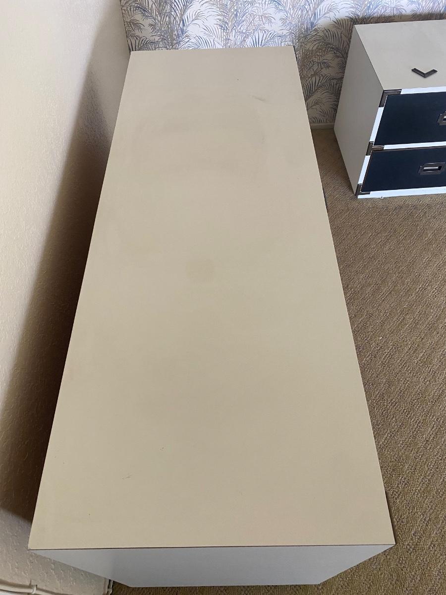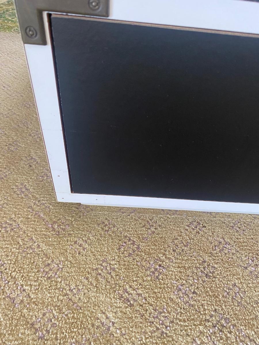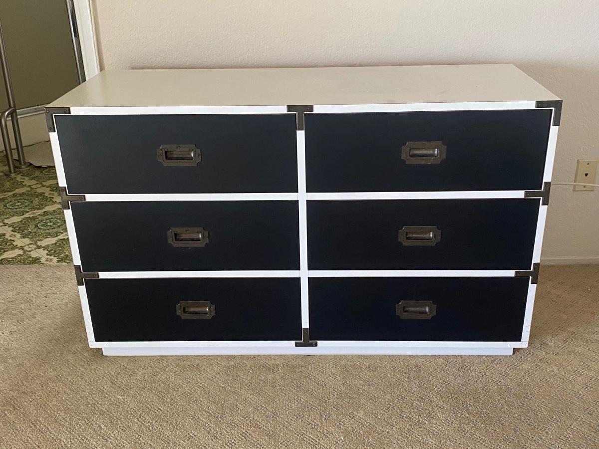 Vintage Retro Black & White Laminate Veneer Campaign Style 6 Drawer Dresser. White body with black drawers. Brass accents. The two bottom corner pieces need to be put back in place, but both are included. In otherwise good used condition. Approx. 4' length, 29" tall, and 18" deep. Great for dresser or funky buffet sideboard table.