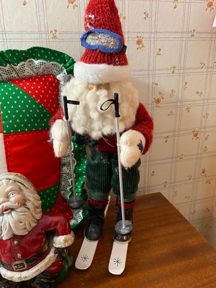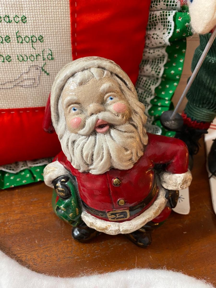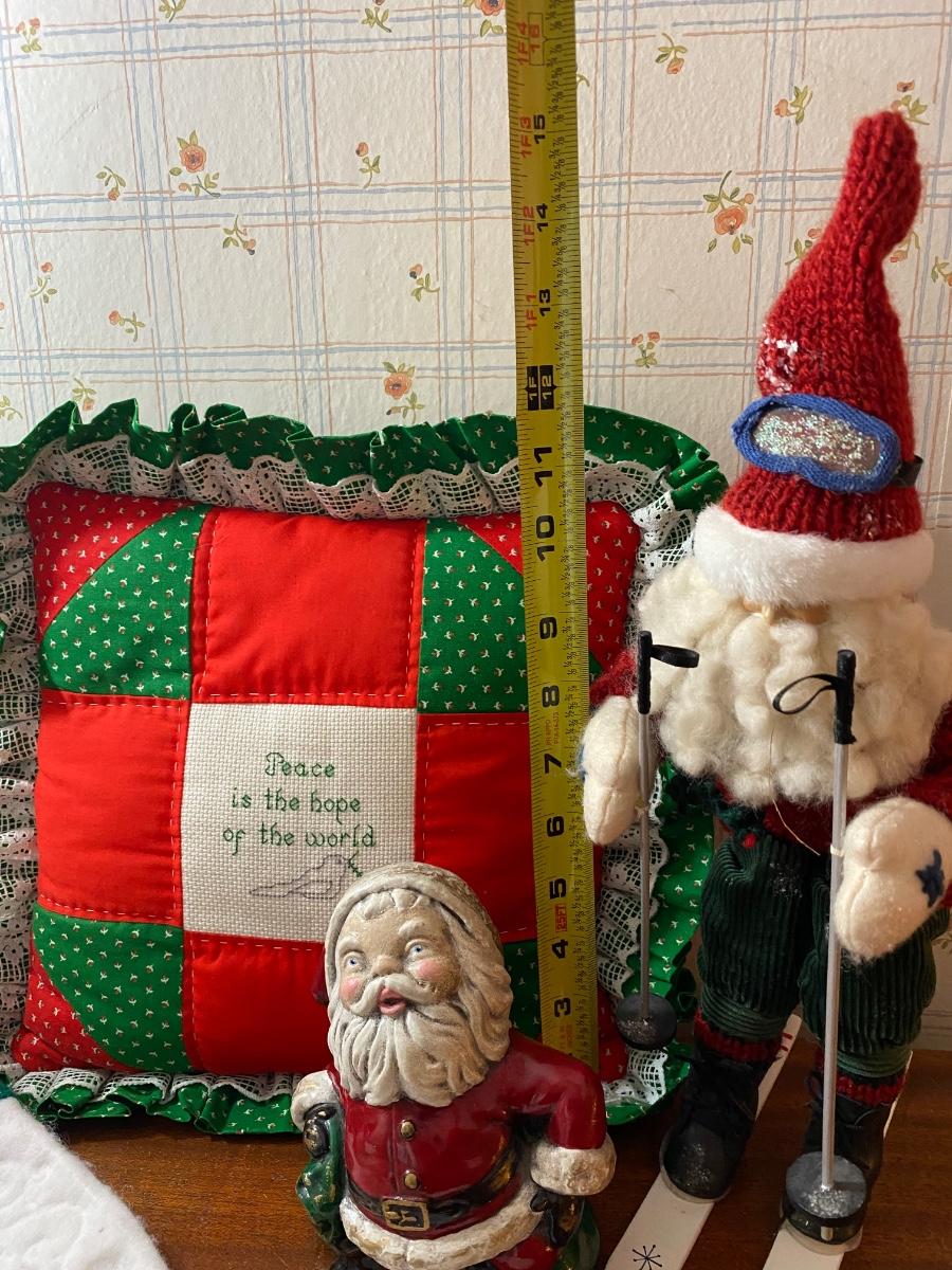 Vintage Retro Christmas Holiday Decor Lot - Pillow, Stocking, Santas. Good condition. The short squatty Santa is heavy like a doorstop.
