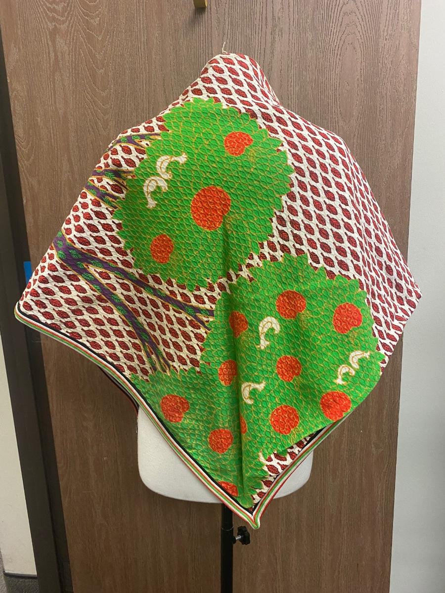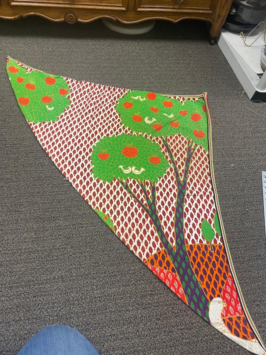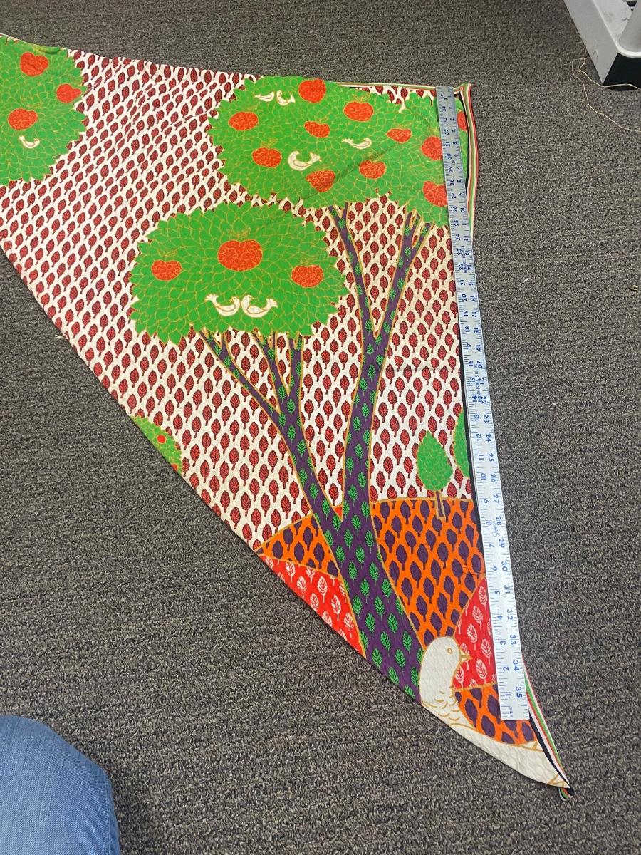 Cool retro shoulder wrap shawl. Interesting design pattern, colorful birds and apple trees. Looks like someone took a square patterned textile and folded it in half to make this. One might be able to remove the edging to make this into a wall hanging or something of that sort. See photos. May have faint discolor but no spots or holes noticed. About 3' size.