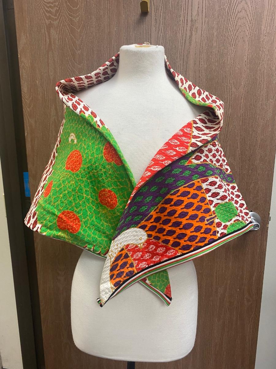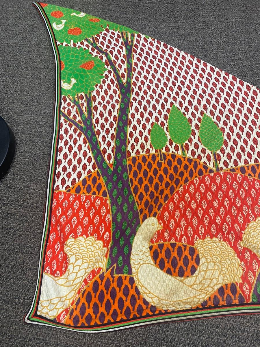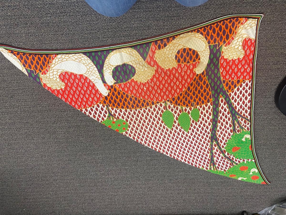 Cool retro shoulder wrap shawl. Interesting design pattern, colorful birds and apple trees. Looks like someone took a square patterned textile and folded it in half to make this. One might be able to remove the edging to make this into a wall hanging or something of that sort. See photos. May have faint discolor but no spots or holes noticed. About 3' size.