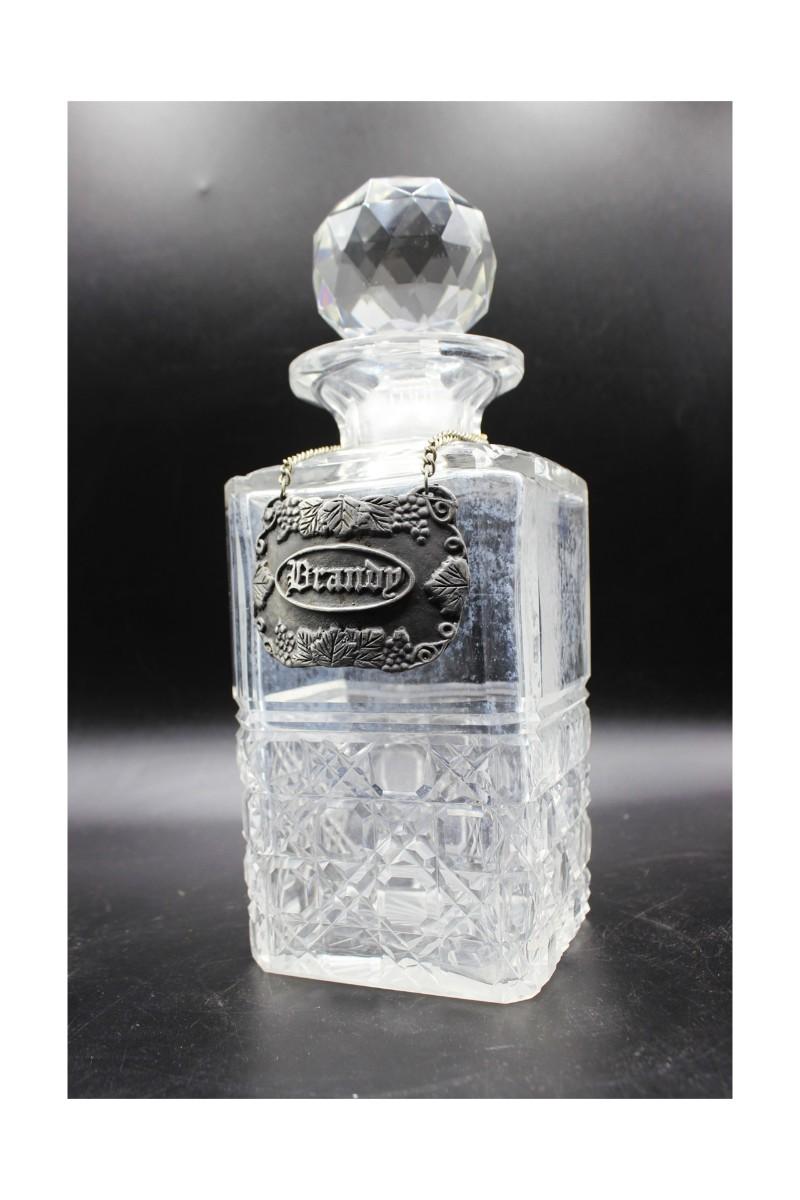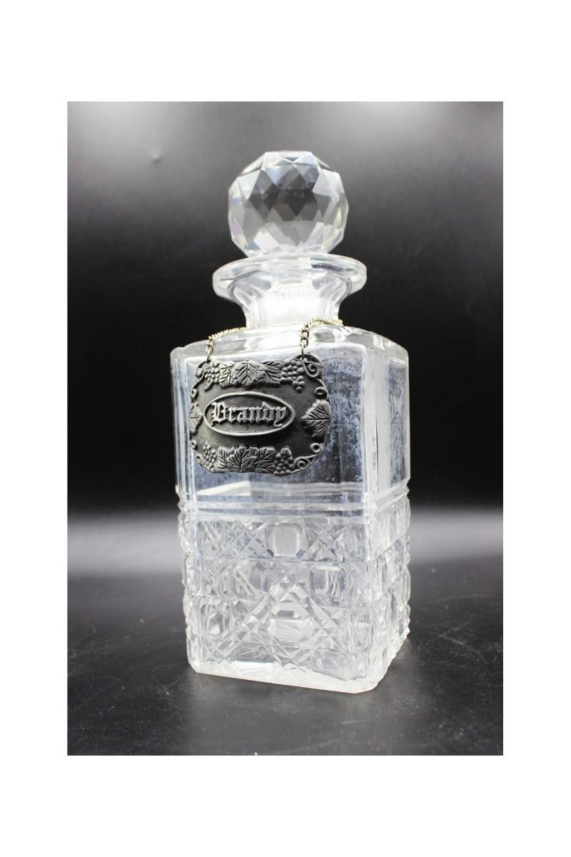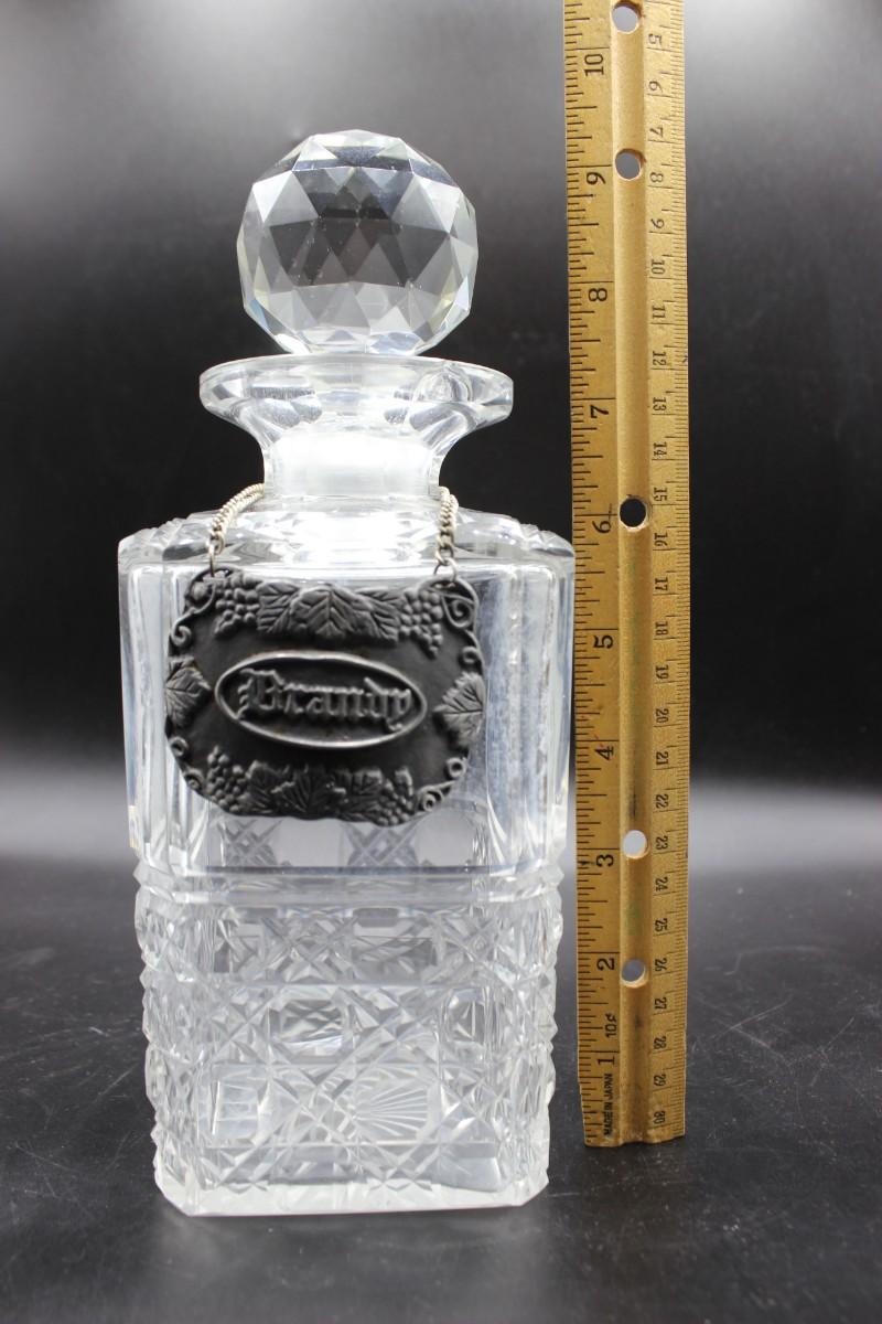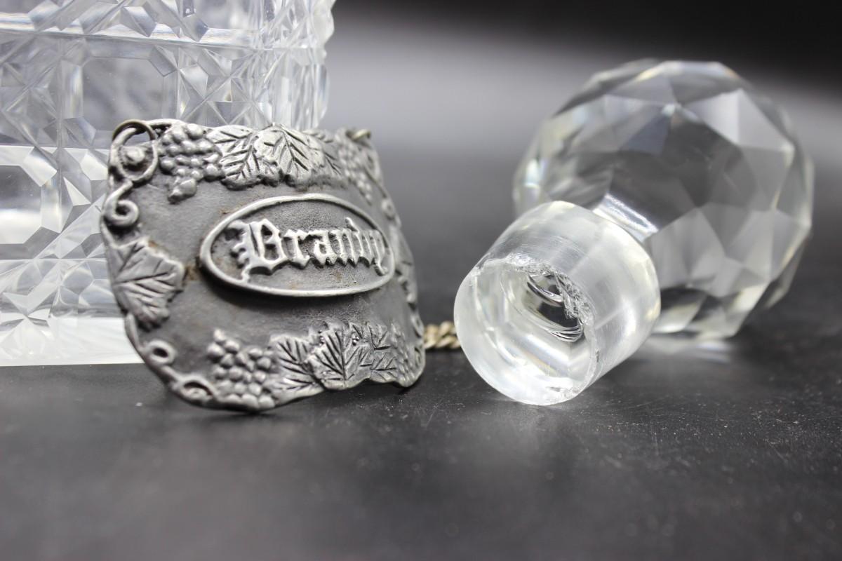 Vintage Diamond Etch Design Crystal Glass Brandy Liquor Decanter. Brandy tag is made of pewter. There are no significant chips or cracks to the piece and is in good vintage condition. Check pictures for more details and for sizing.