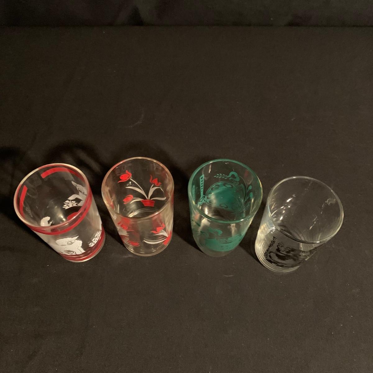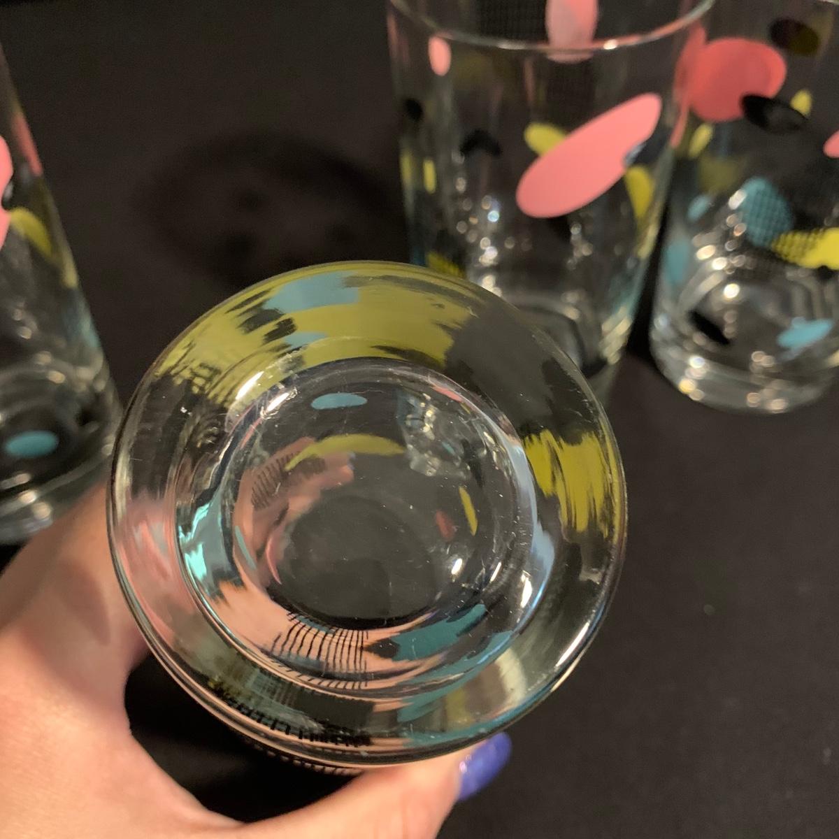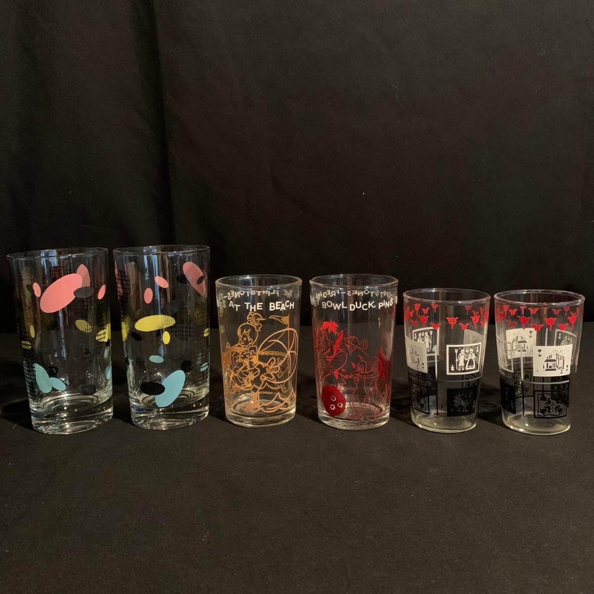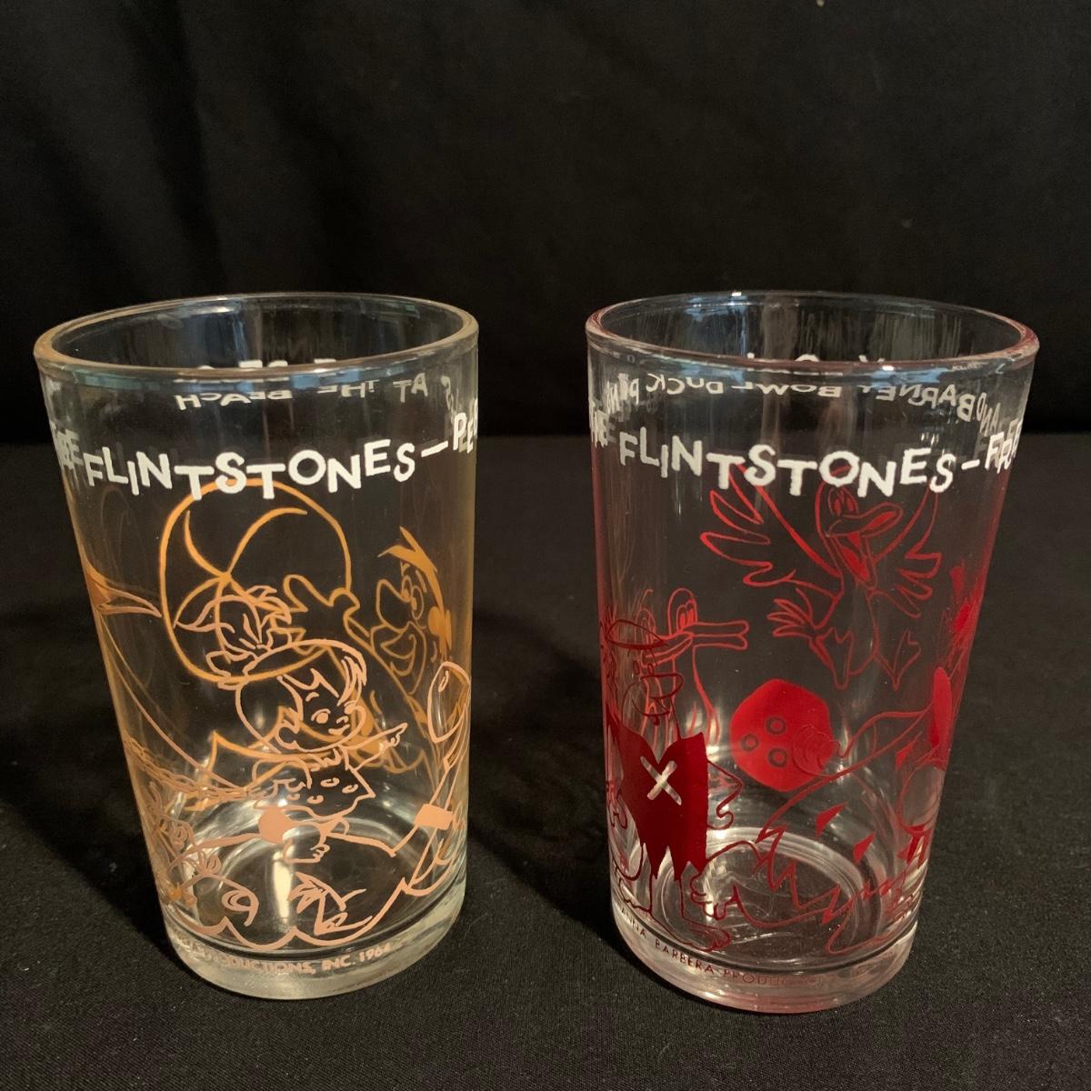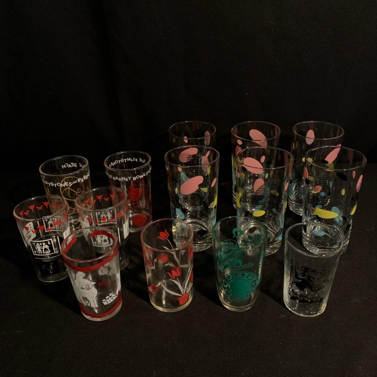 Fourteen glasses total. One set of six matching glasses with a retro pink, yellow, blue, and black design. A set of two Flinstones glasses. A set of two matching farmhouse-themed glasses. Four small unmatching glasses that fit in with the farm and floral theme. All items are glass and in good condition. The tallest glass is 5.25” tall and the smallest is 3.5” tall. Shipping available.