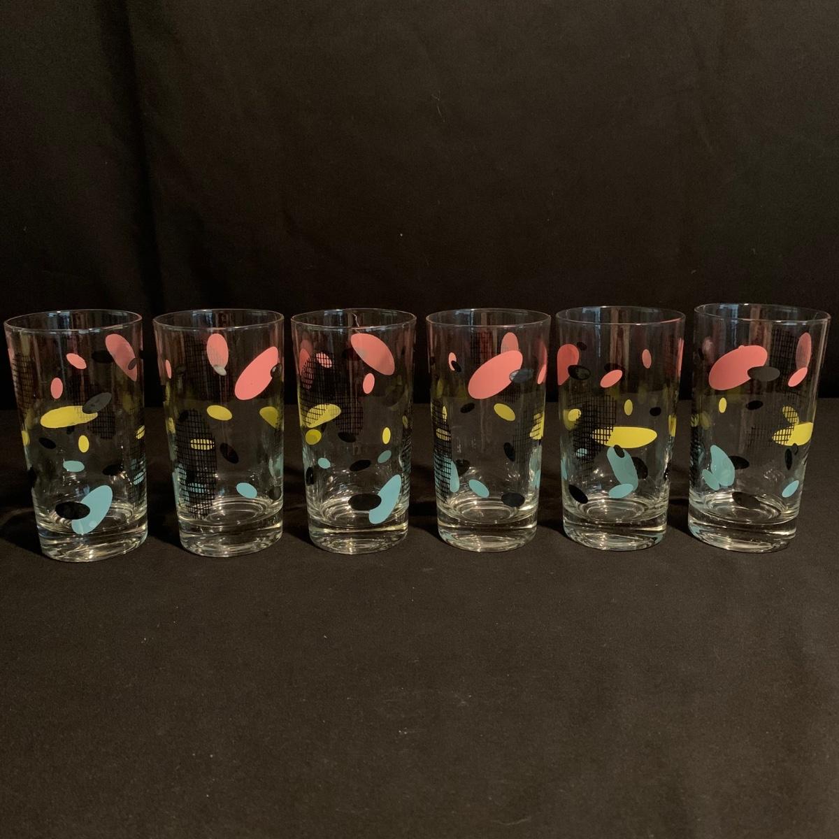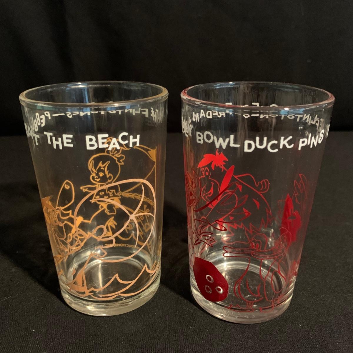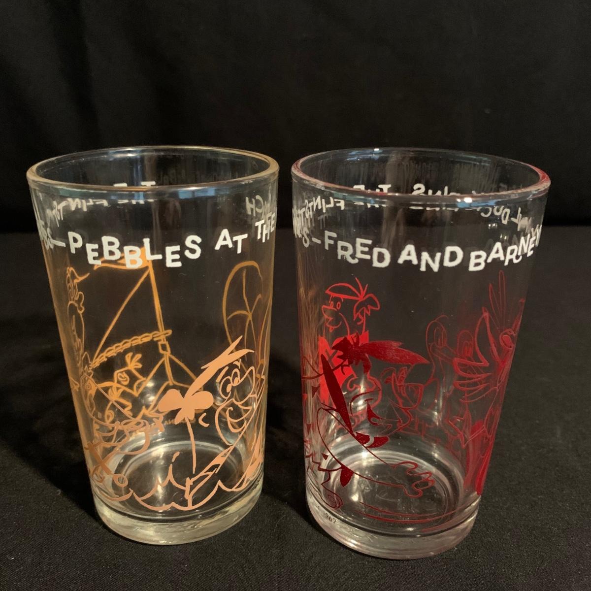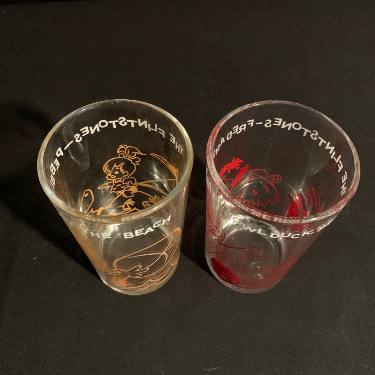 Fourteen glasses total. One set of six matching glasses with a retro pink, yellow, blue, and black design. A set of two Flinstones glasses. A set of two matching farmhouse-themed glasses. Four small unmatching glasses that fit in with the farm and floral theme. All items are glass and in good condition. The tallest glass is 5.25” tall and the smallest is 3.5” tall. Shipping available.