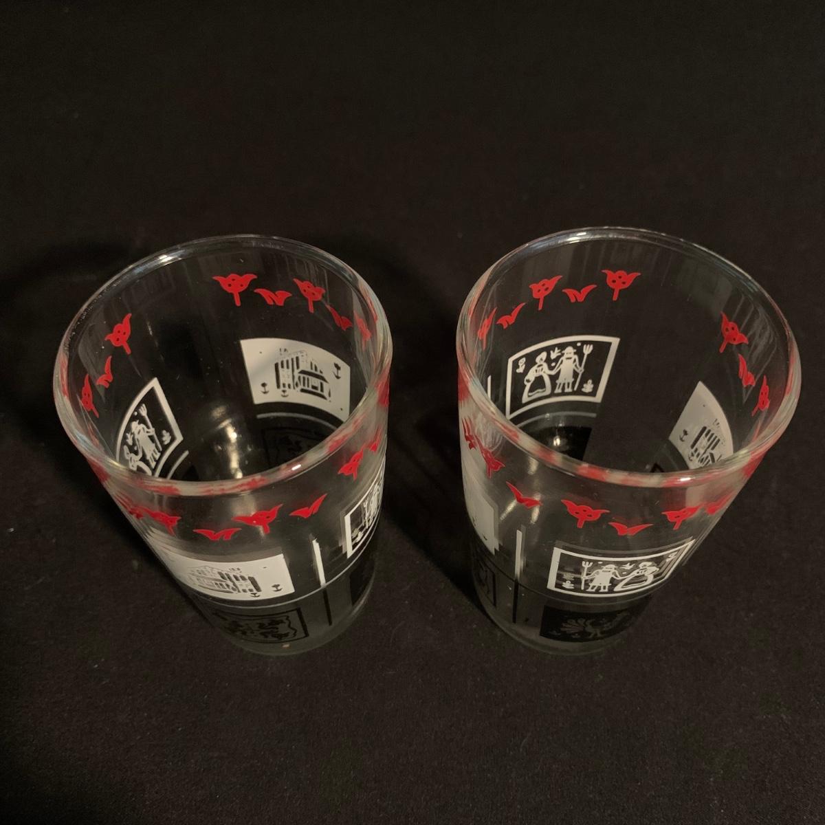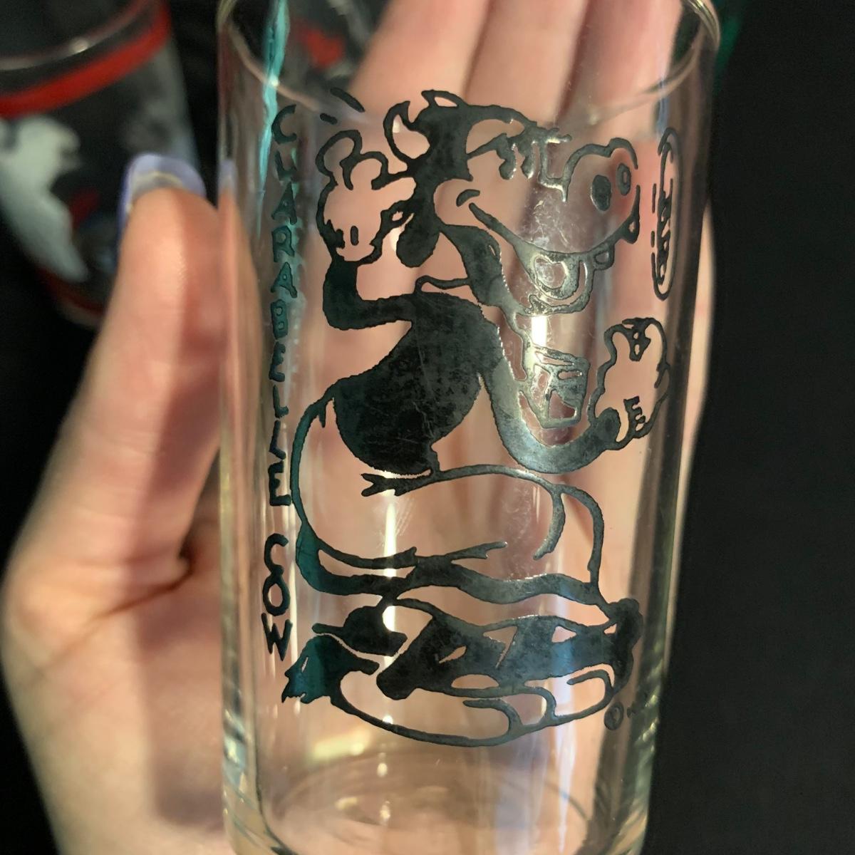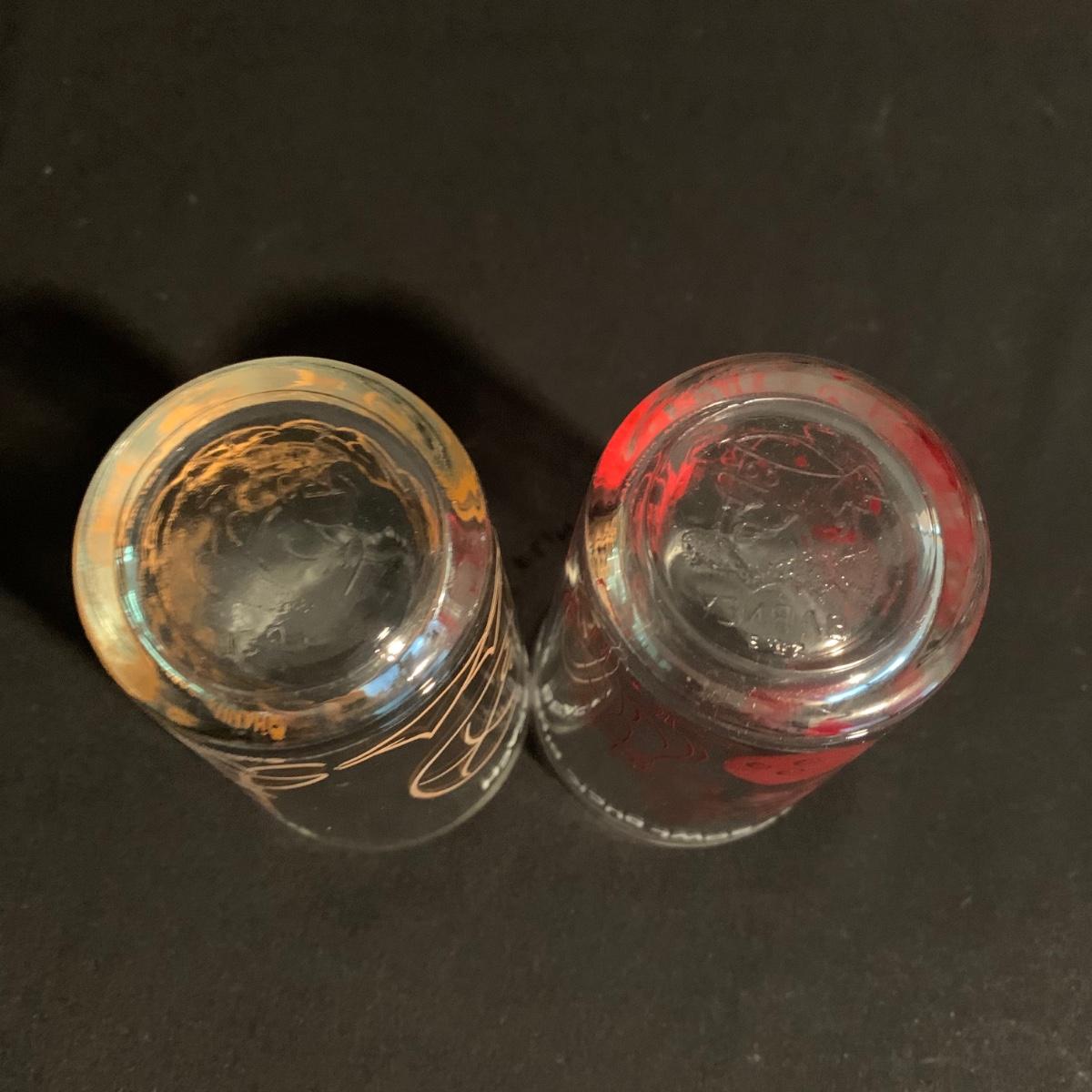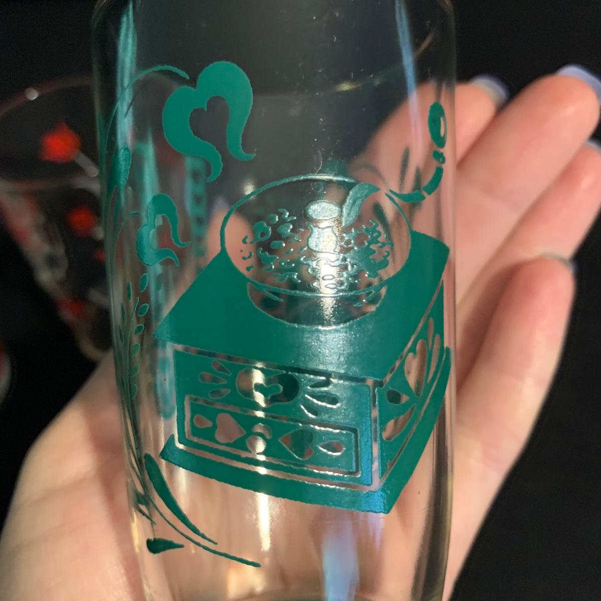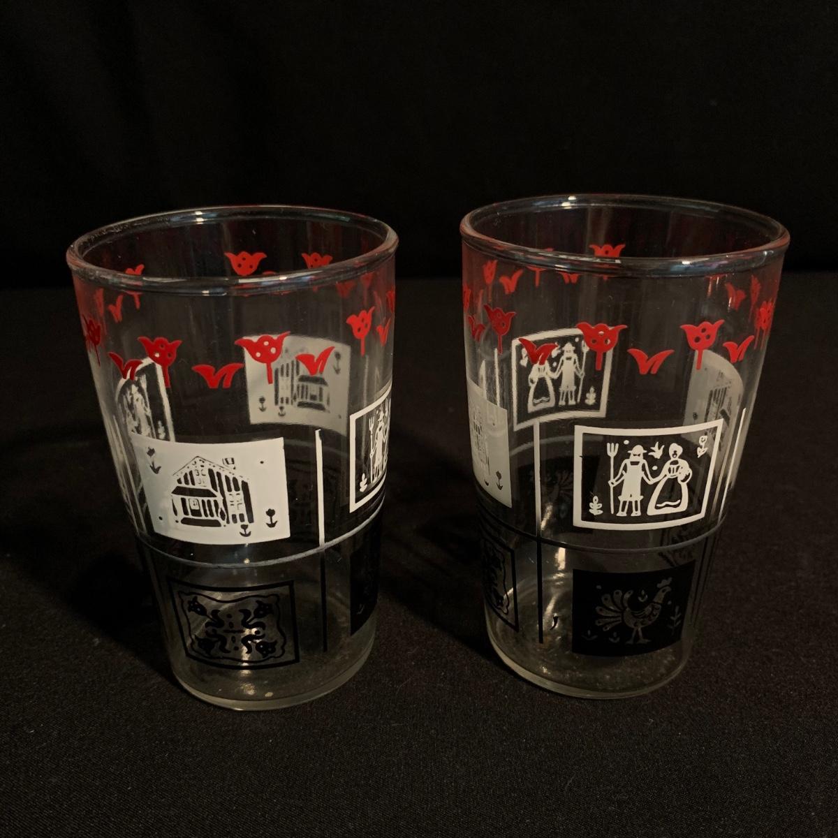 Fourteen glasses total. One set of six matching glasses with a retro pink, yellow, blue, and black design. A set of two Flinstones glasses. A set of two matching farmhouse-themed glasses. Four small unmatching glasses that fit in with the farm and floral theme. All items are glass and in good condition. The tallest glass is 5.25” tall and the smallest is 3.5” tall. Shipping available.