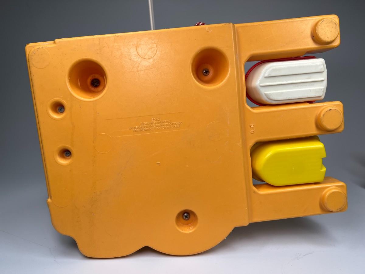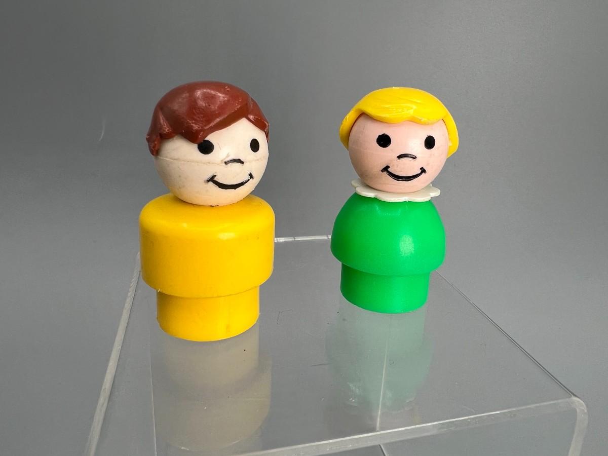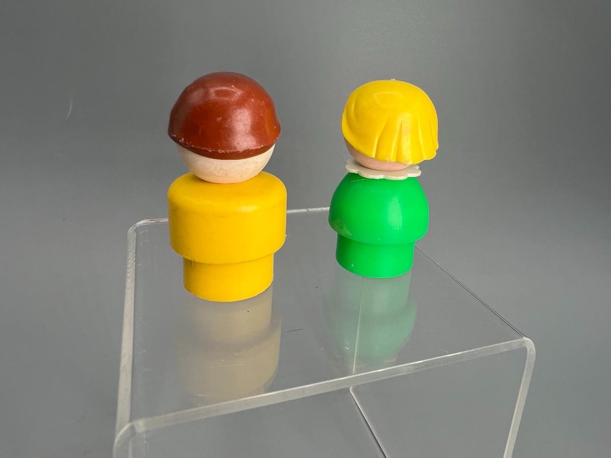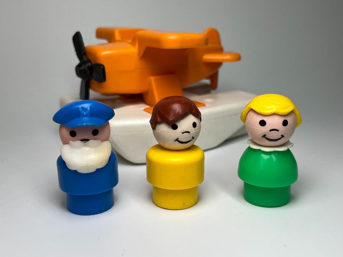 Retro Fisher Price Little People Floating Marina Playset #2582. Produced 1988 to 1990, this set is a first edition set as it came with the sea plane. Play set is almost complete, it is missing the life vest that originally came with it. Included with the Floating Marina base is the single seat plane (omitted in 1990), orange rowboat, and a red & white rowboat. Play set includes a short blue captain with a white beard & moustache and a blue cap, a green girl with a blonde sculpted bob, and a yellow boy with brown molded hair. All the Little People are plastic. In good previously played with condition. Some light wear. Does not come with original box.