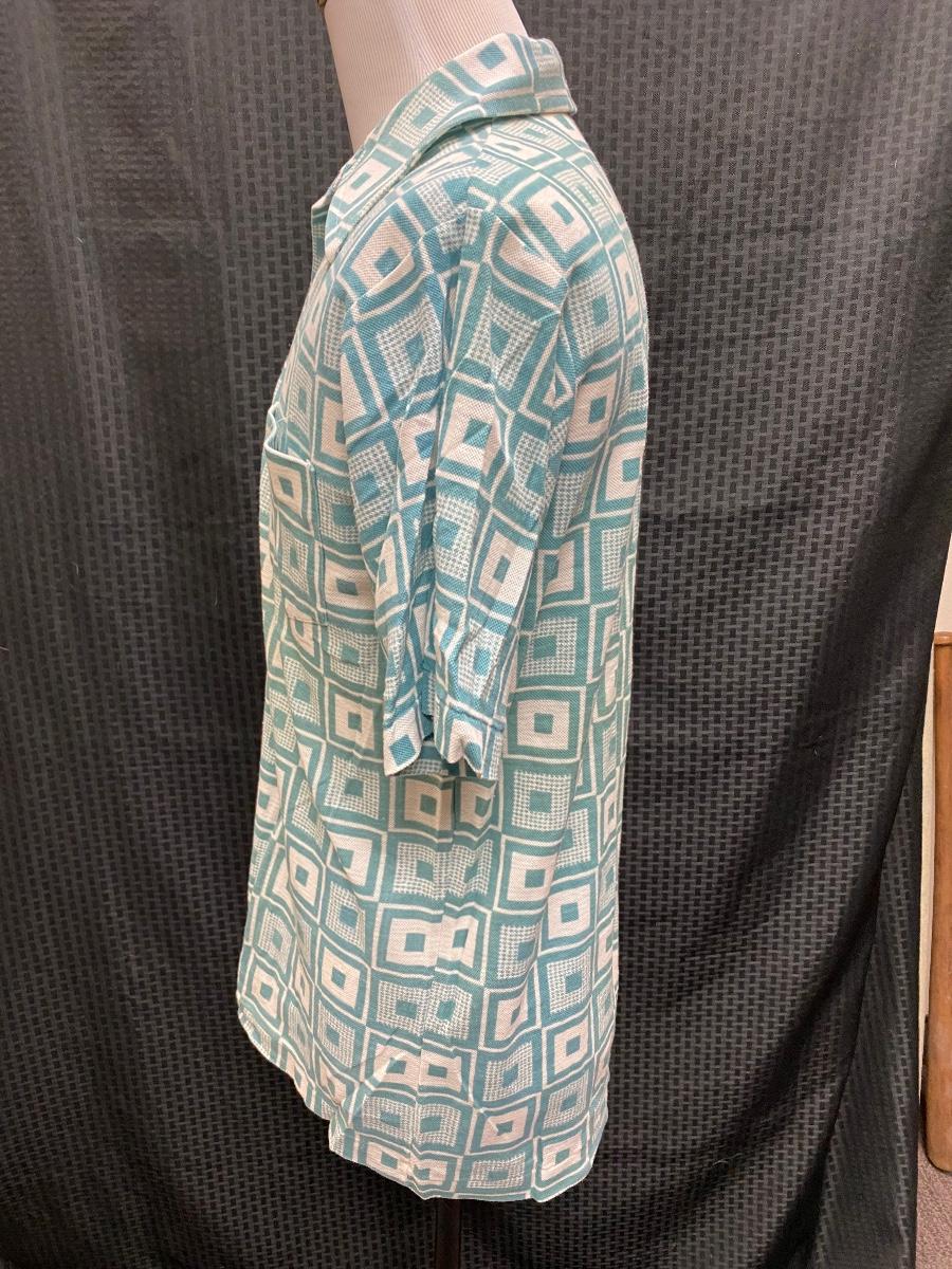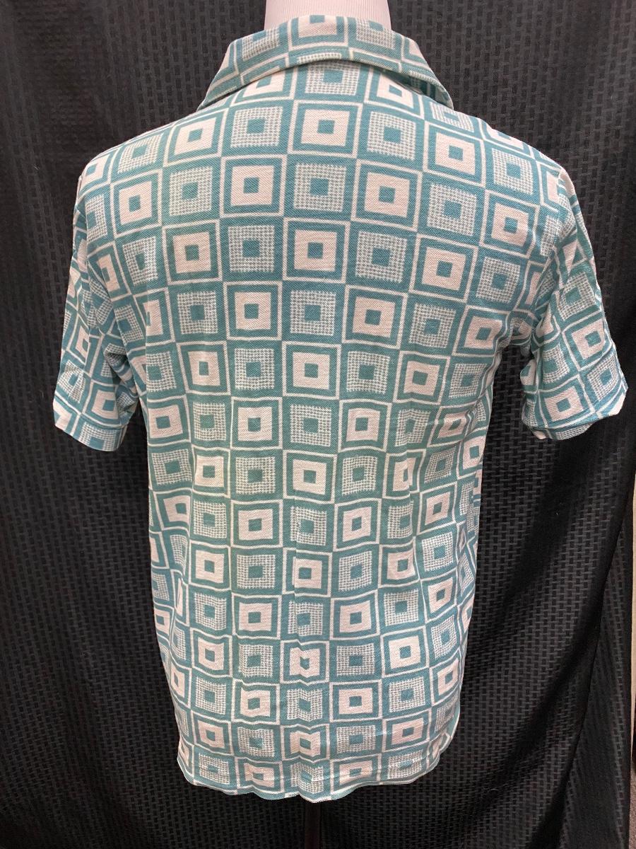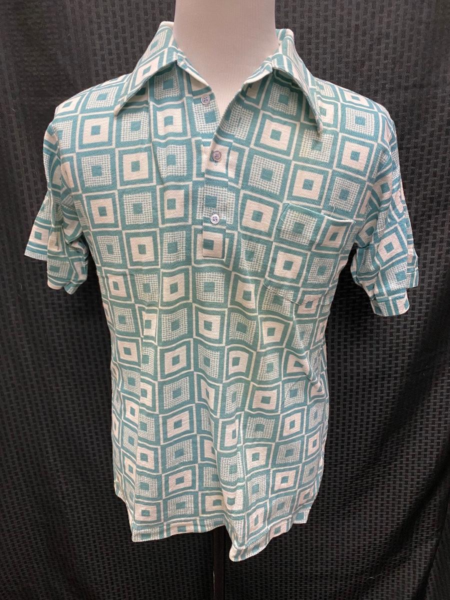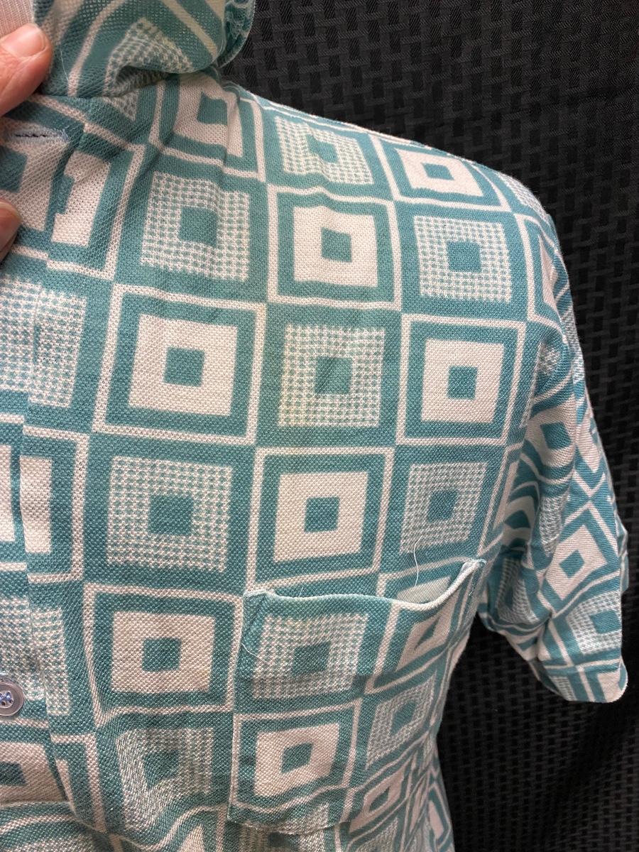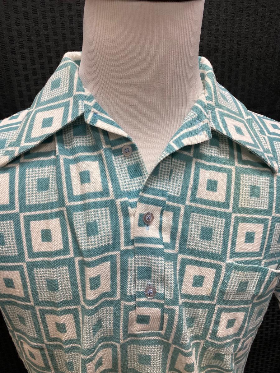 Funky retro geometric patterned men's shirt. Teal blue and white color, short sleeves, pointed collar. Does not button all the way down, only to mid chest level. Does have some light discolor from age and wear, but no major spots, stains, or holes. Size large.
