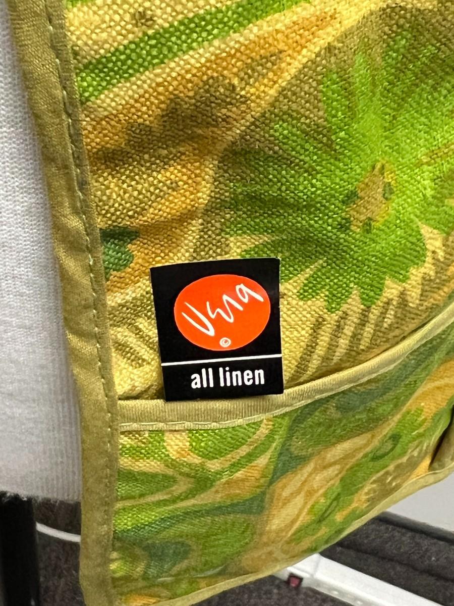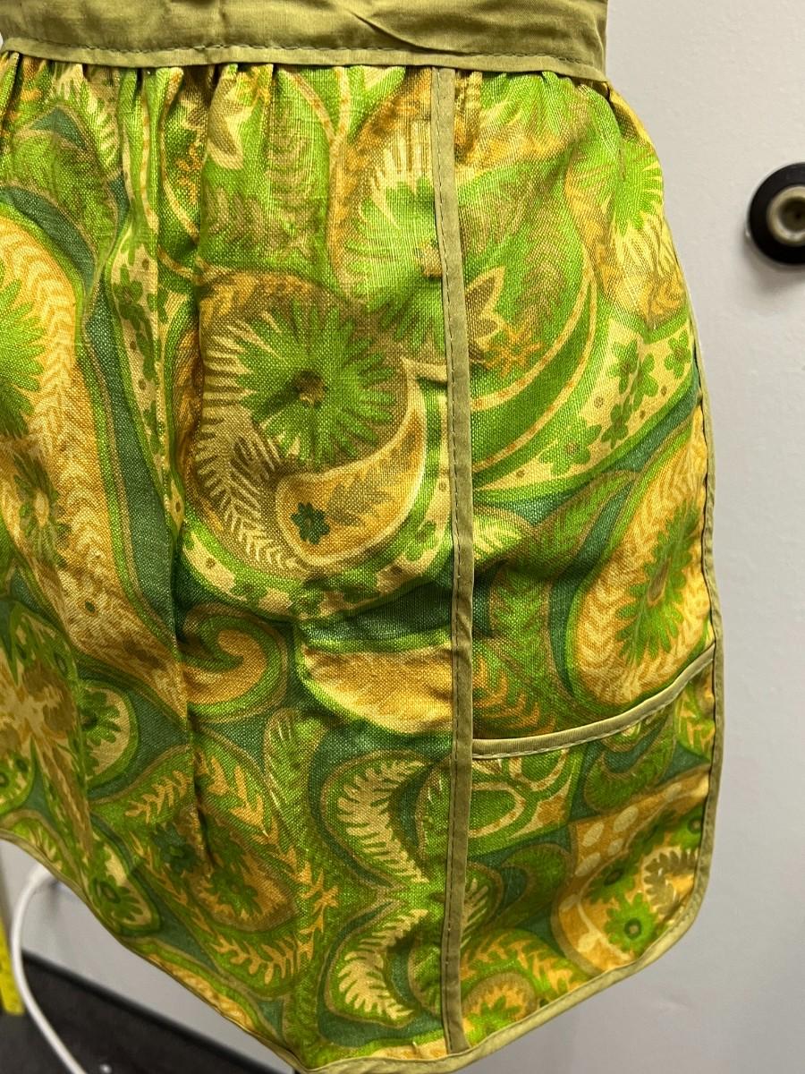 Vintage Retro Green & Yellow Paisley Pattern Linen Half Apron, there are no significant rips or tears to the apron and is in good condition. Check pictures for more details and for sizing.