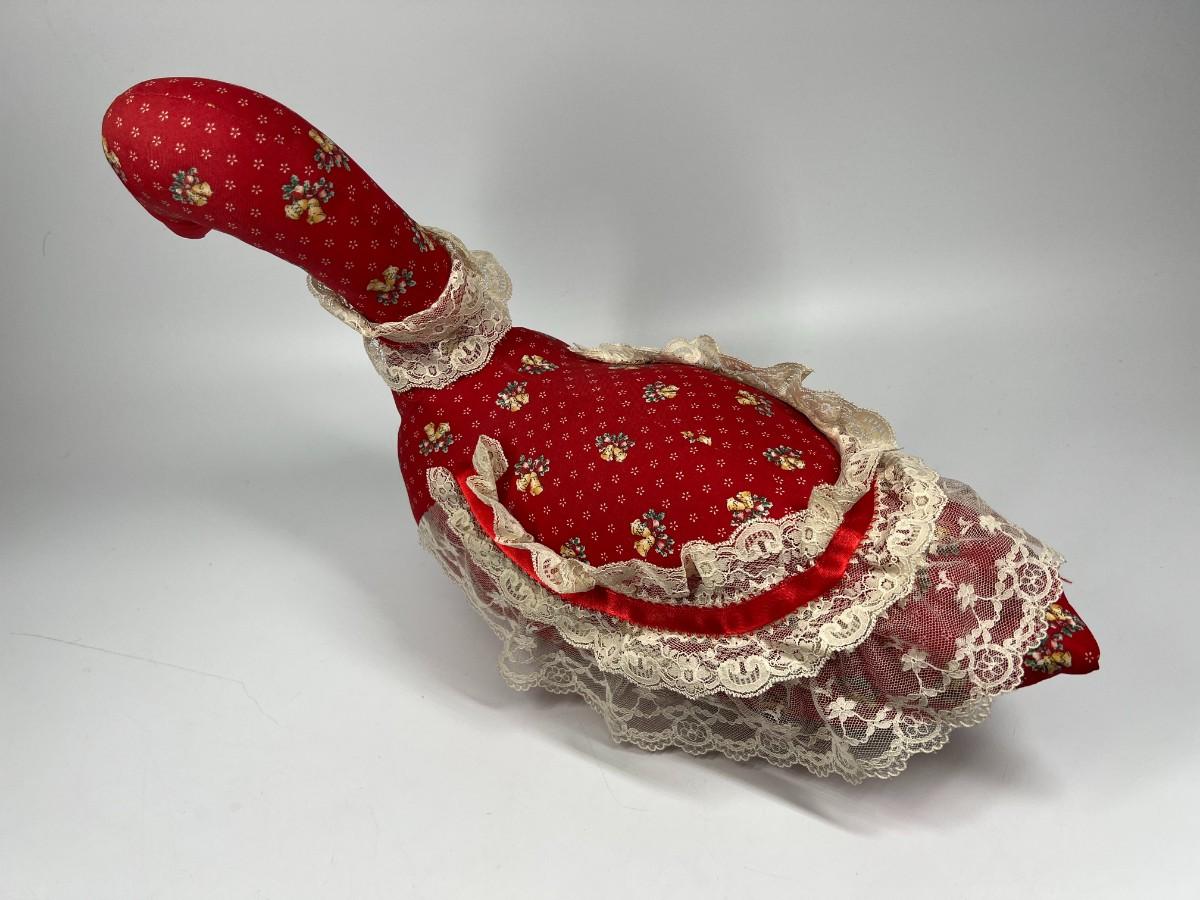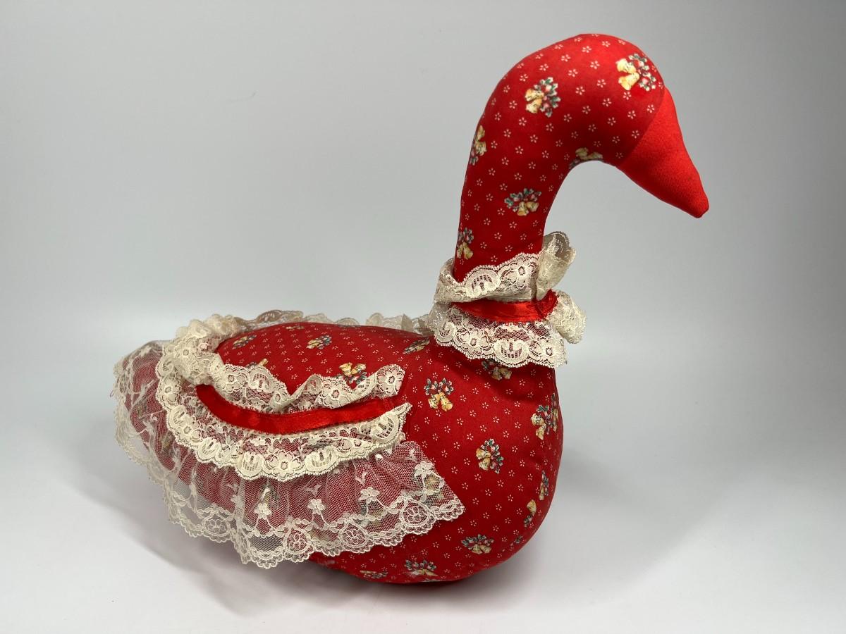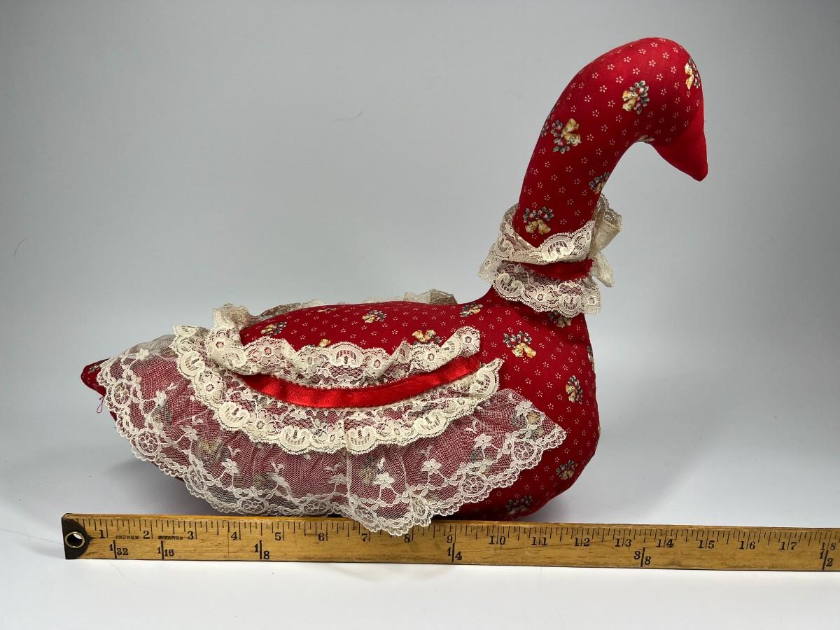 Retro holiday themed goose. Red fabric with lace trim. Good vintage condition.