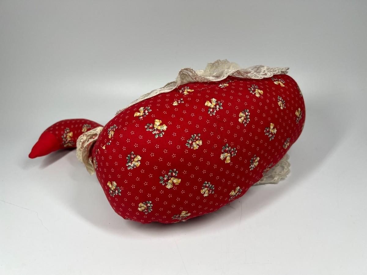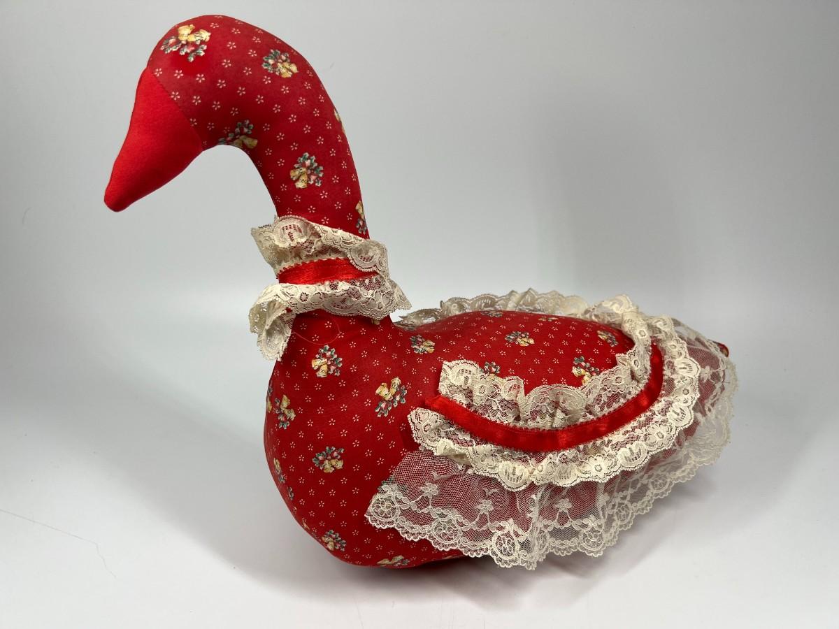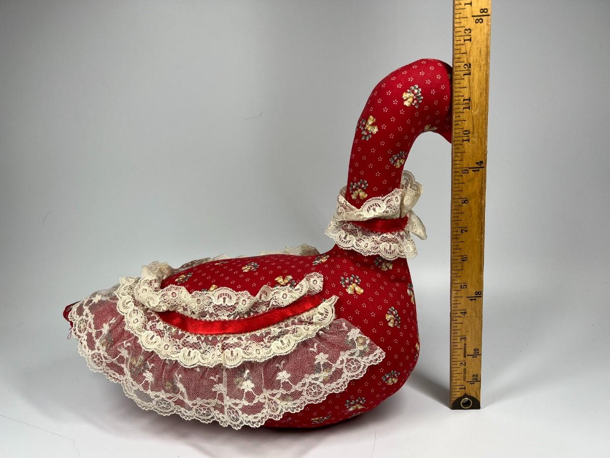 Retro holiday themed goose. Red fabric with lace trim. Good vintage condition.