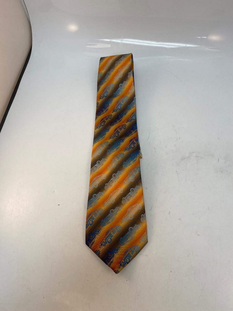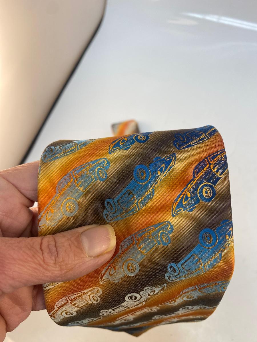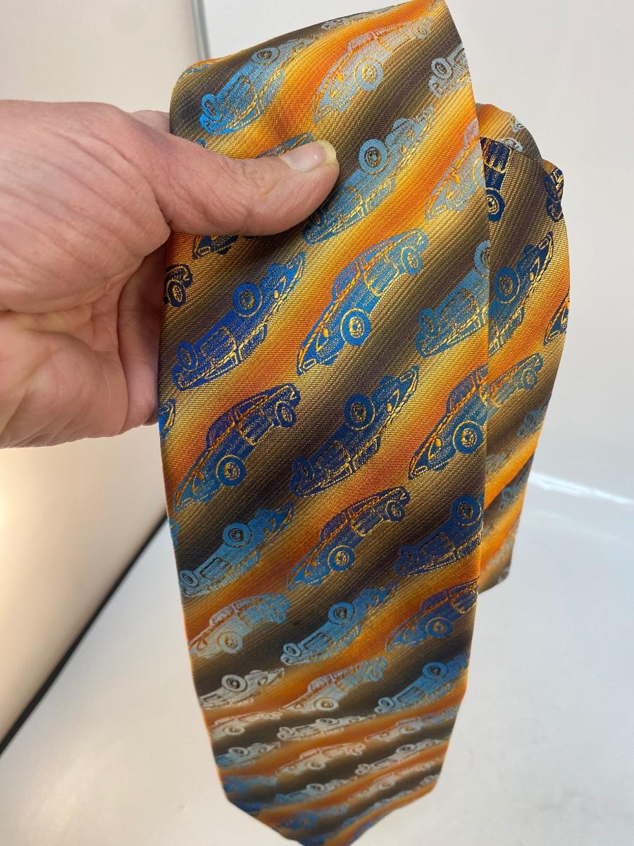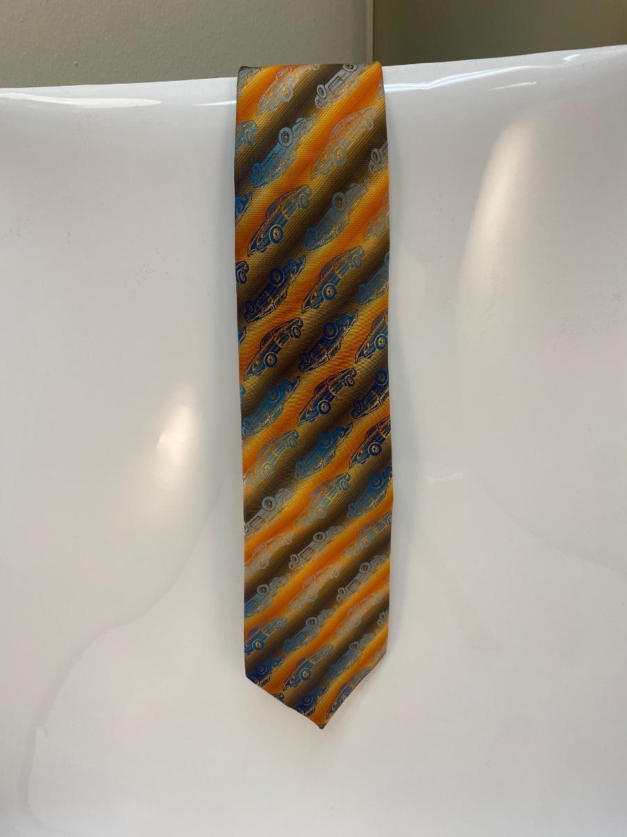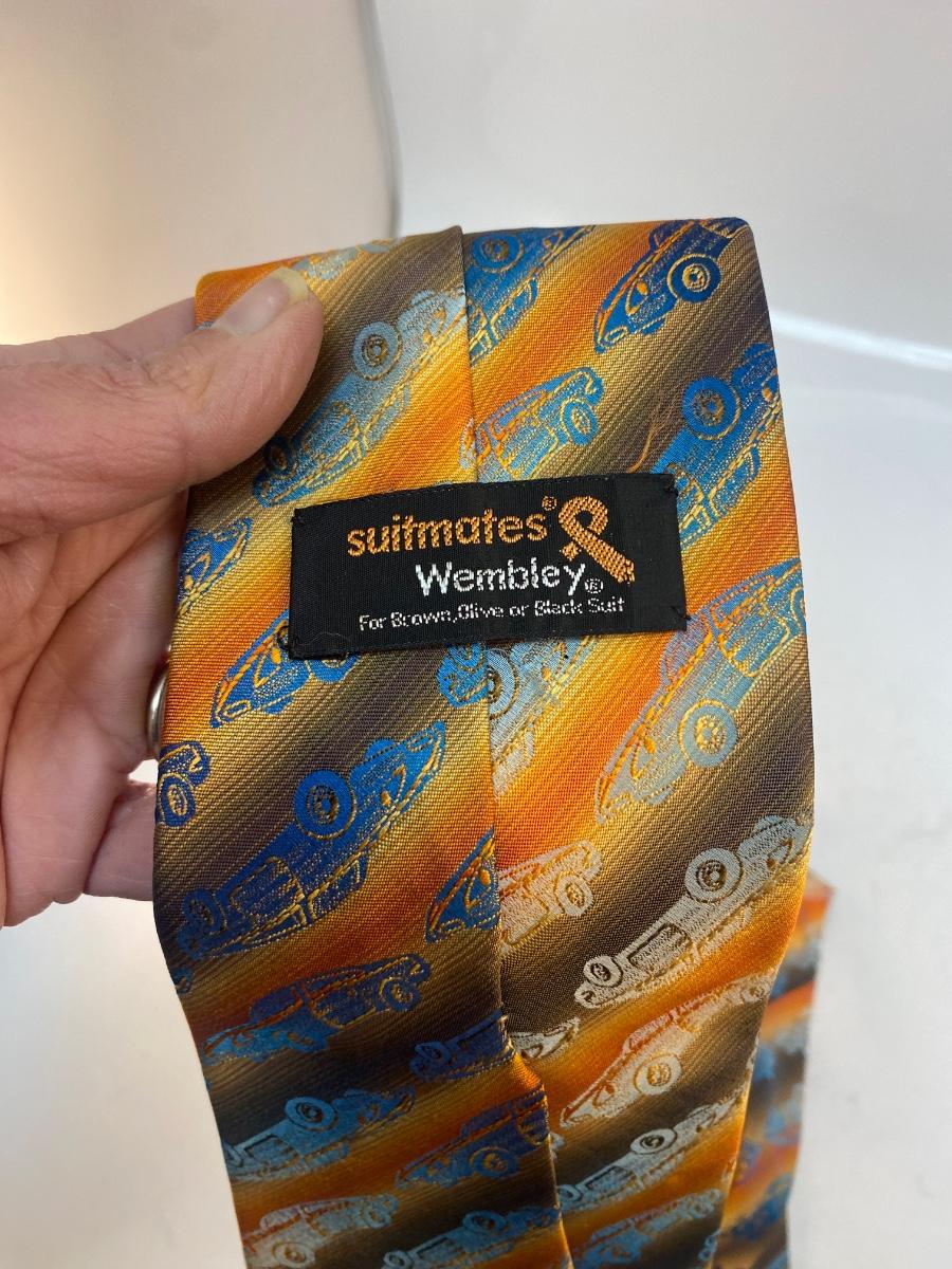 Vintage Retro Iridescent Blue Car Striped Necktie Automotive Enthusiast Fashion. In good condition. Brown, yellow, orange stripe with a iridescent blue car pattern. From Suitmates by Wembley.