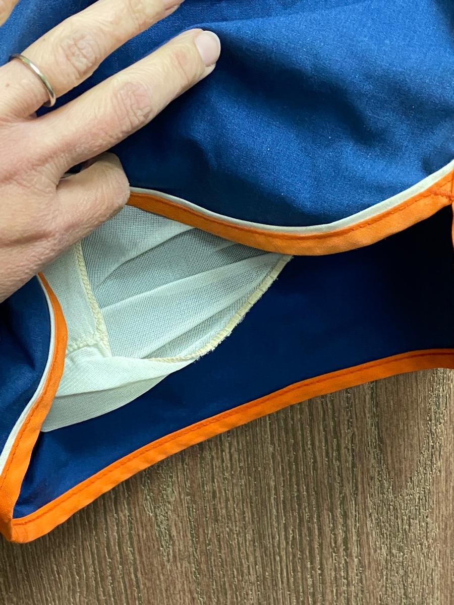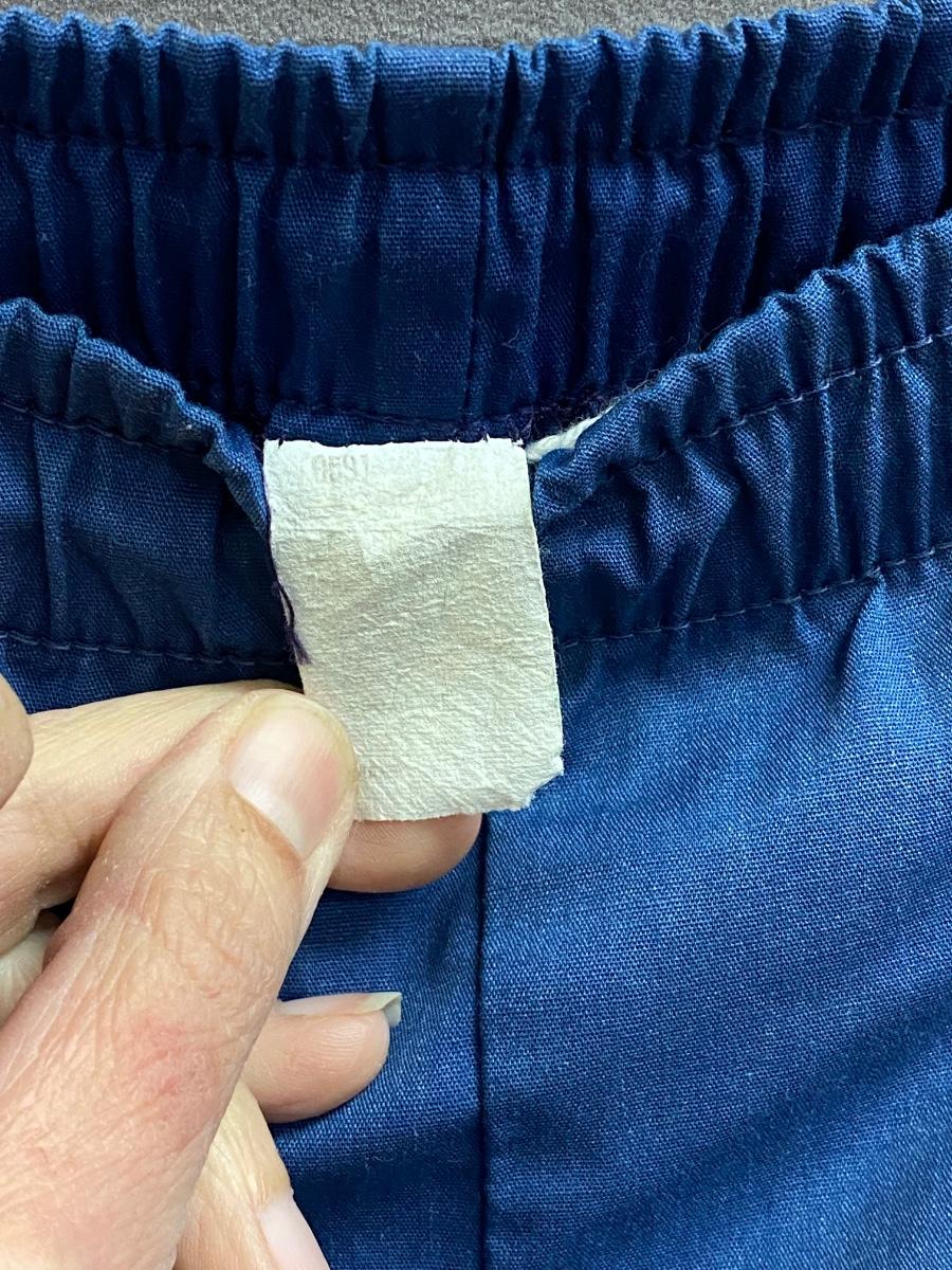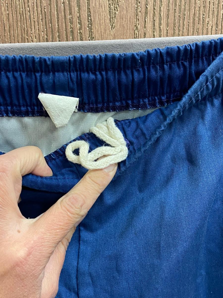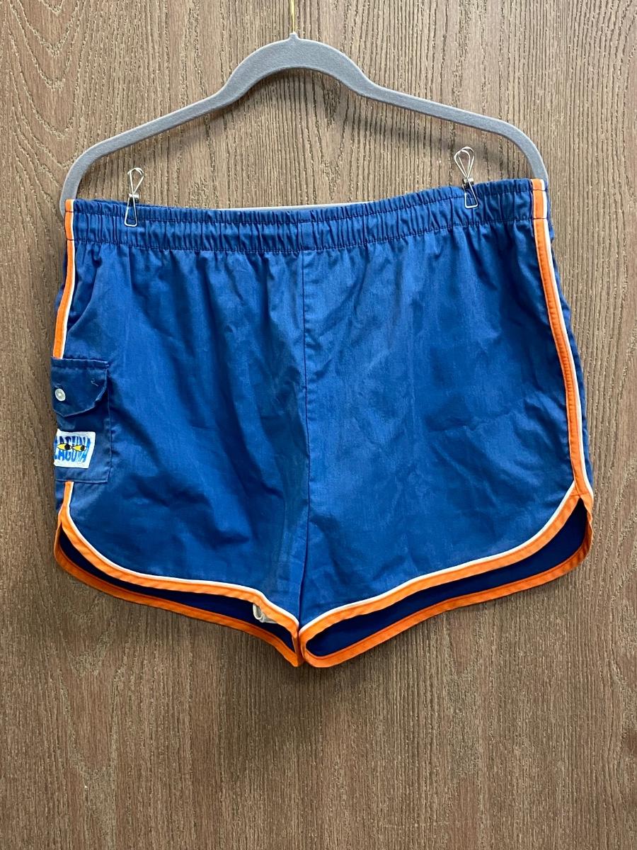 Retro blue & orange swim trunks from Laguna. Lined short shorts, elastic waist. Tag has faded, can't read size, maybe a medium. In good vintage condition.
