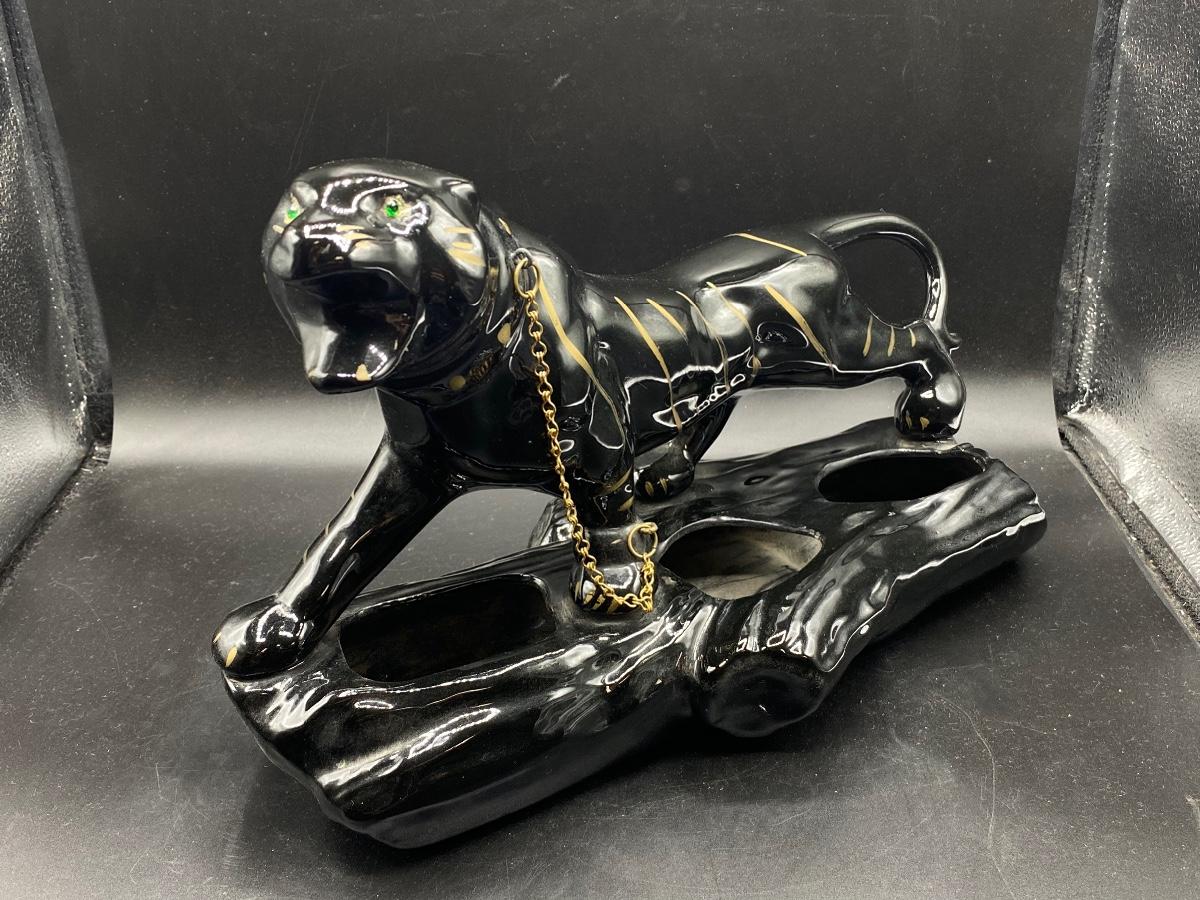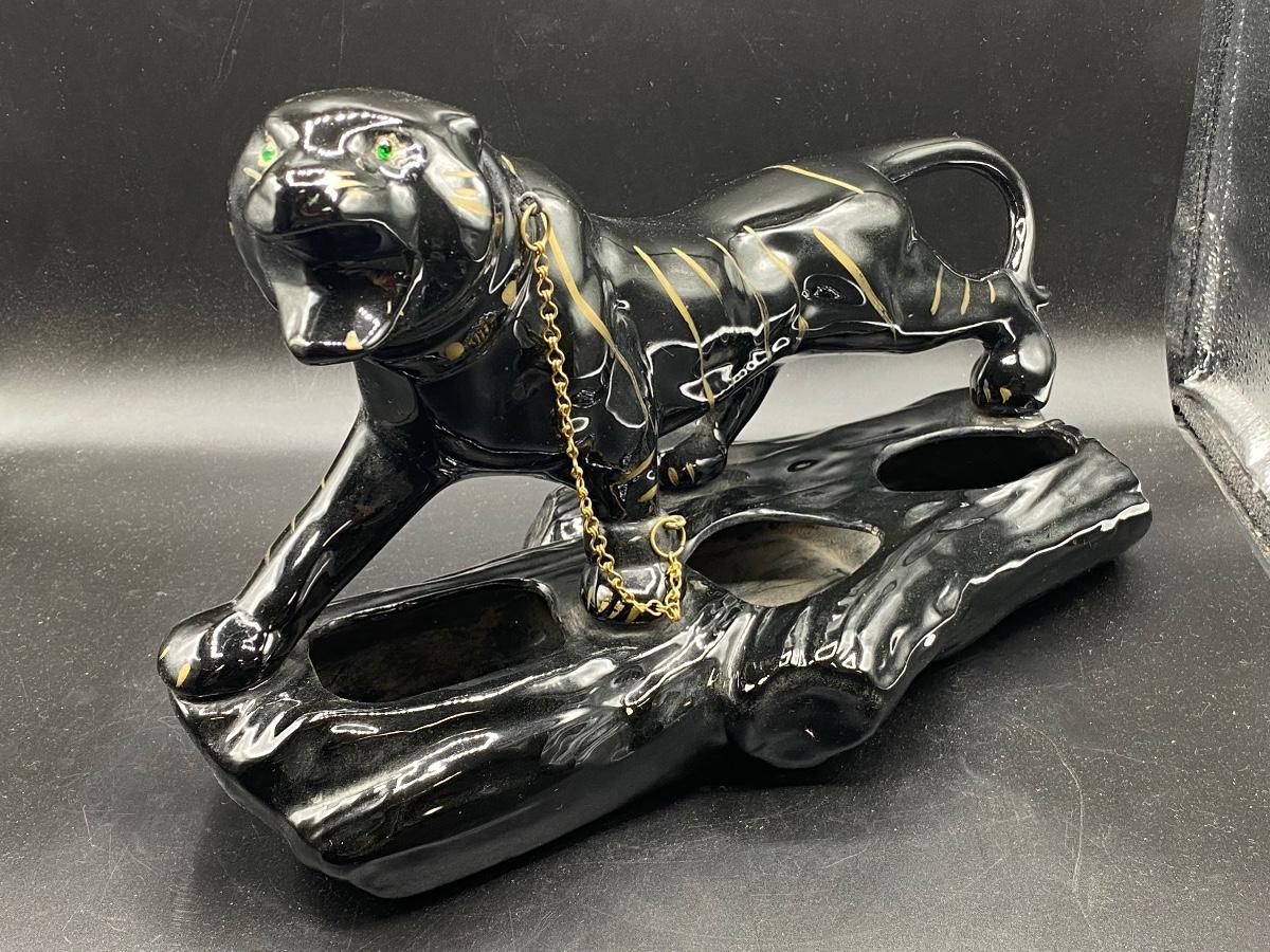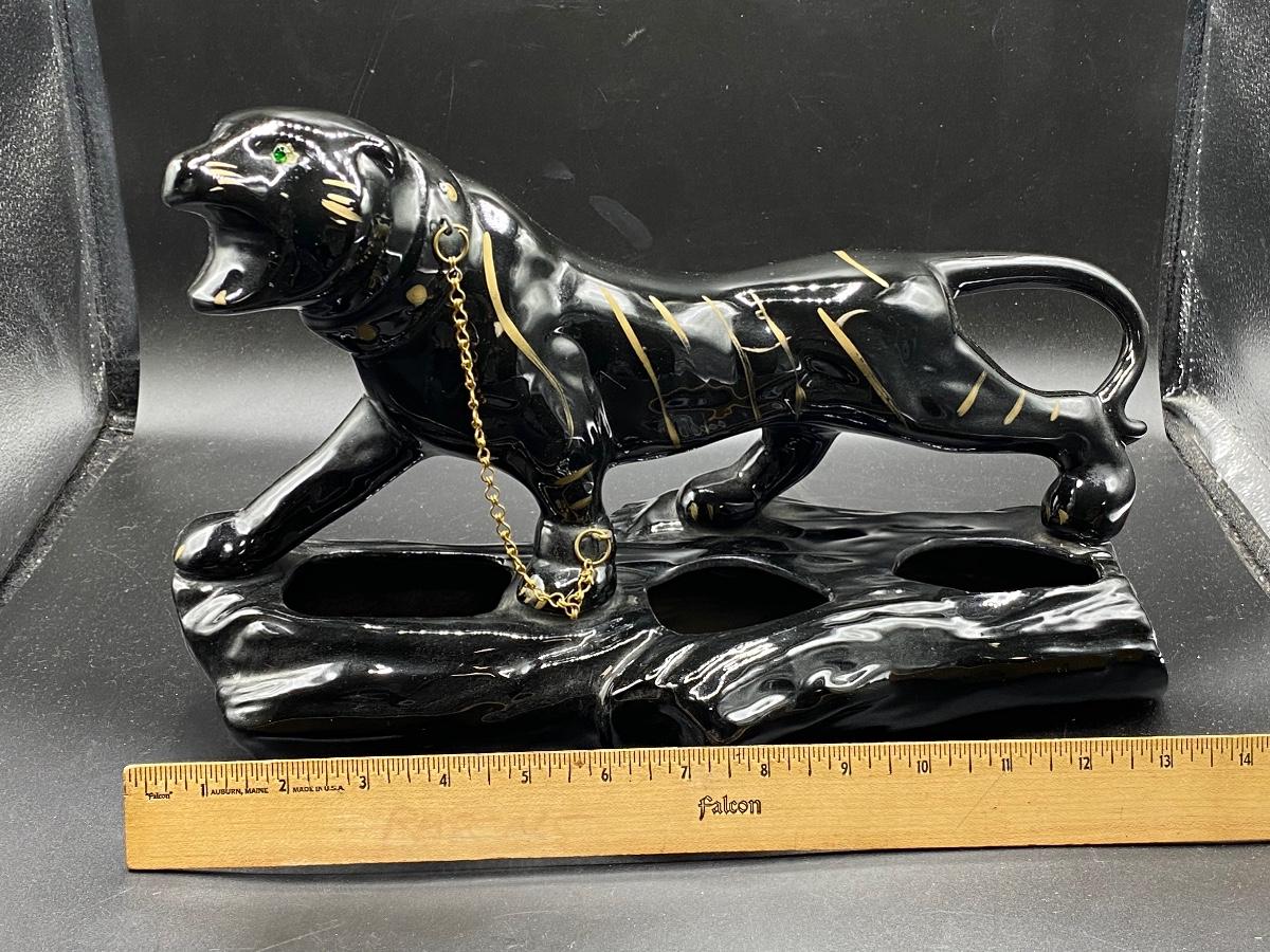 Retro Mid Century black & gold tiger planter figurine. Green rhinestone eyes and chain attached. Three planter holes. Displays great. No damage noticed. There is a mark on the bottom, looks like "SP". Over 12" size.