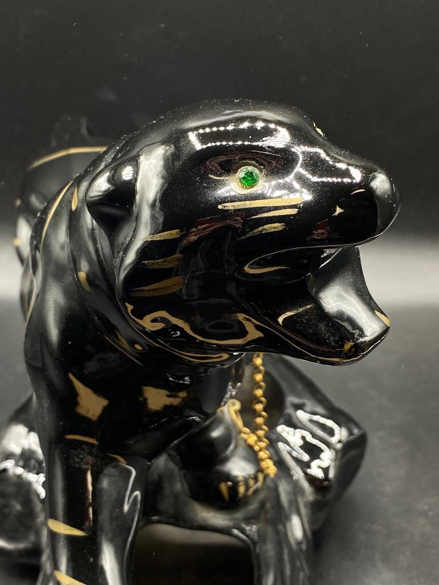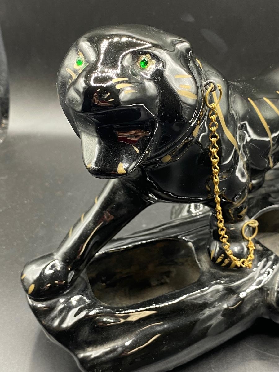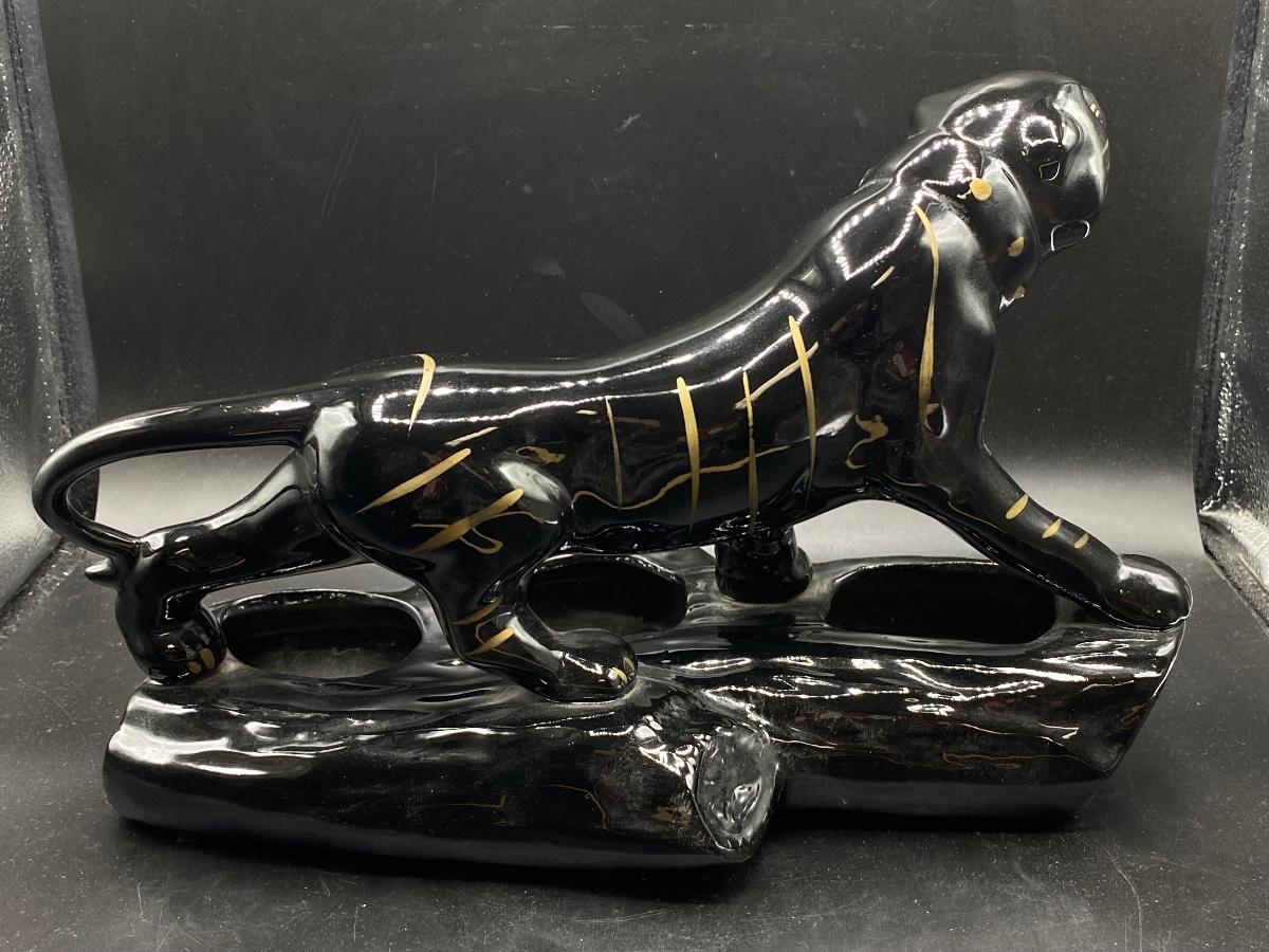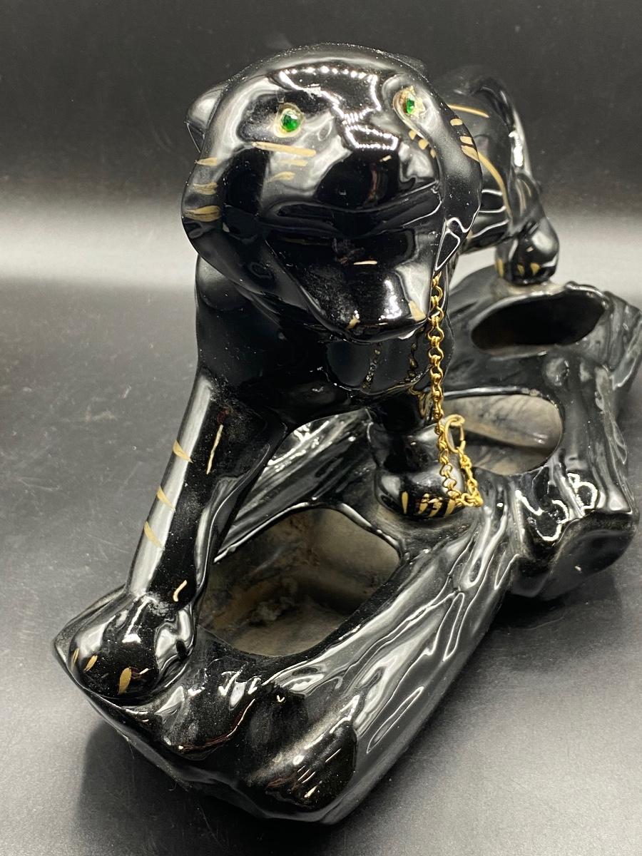 Retro Mid Century black & gold tiger planter figurine. Green rhinestone eyes and chain attached. Three planter holes. Displays great. No damage noticed. There is a mark on the bottom, looks like "SP". Over 12" size.