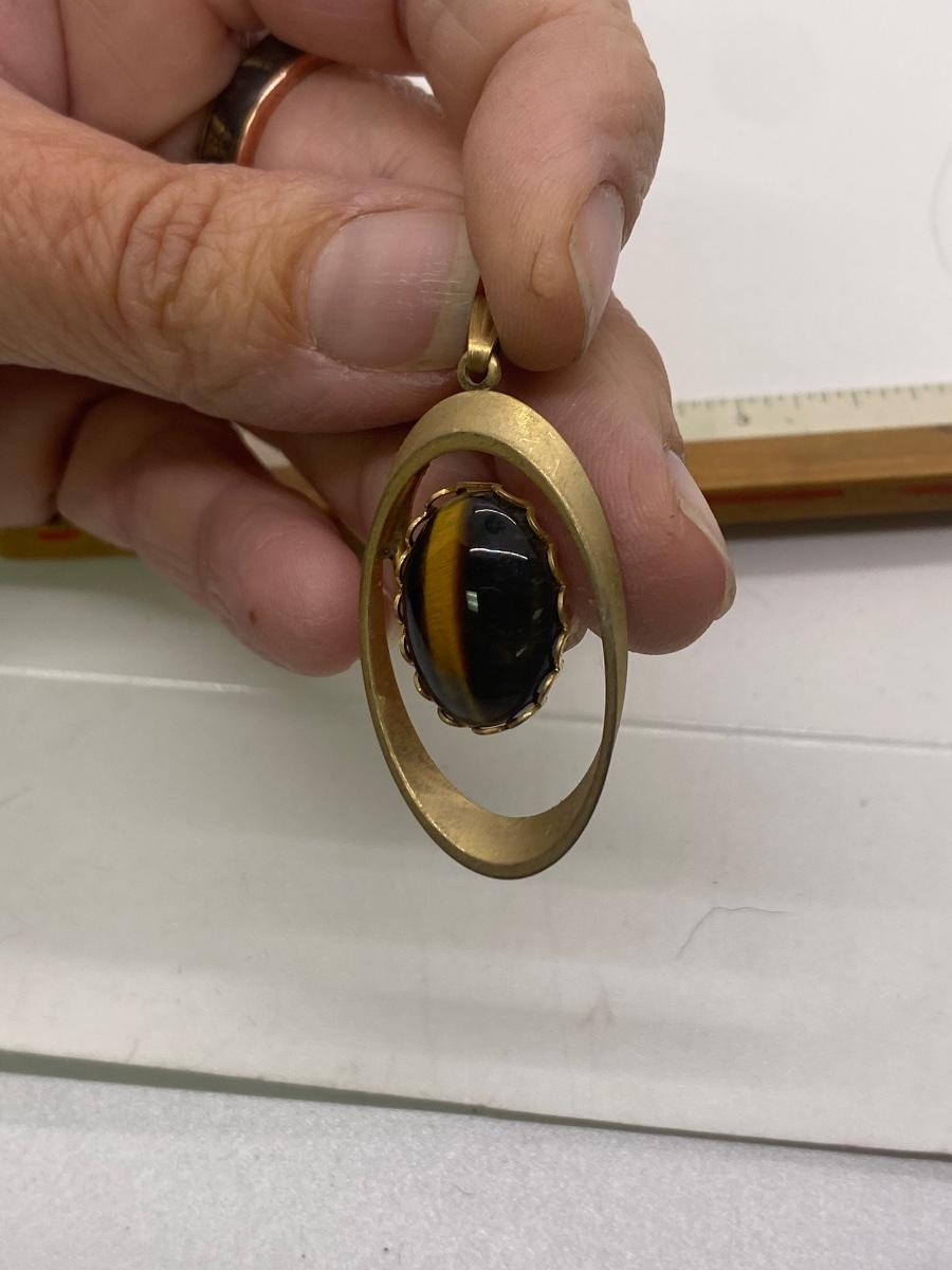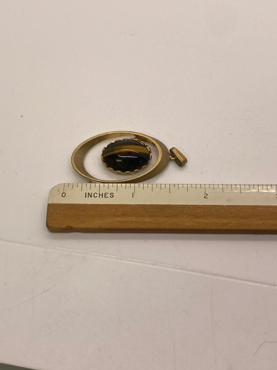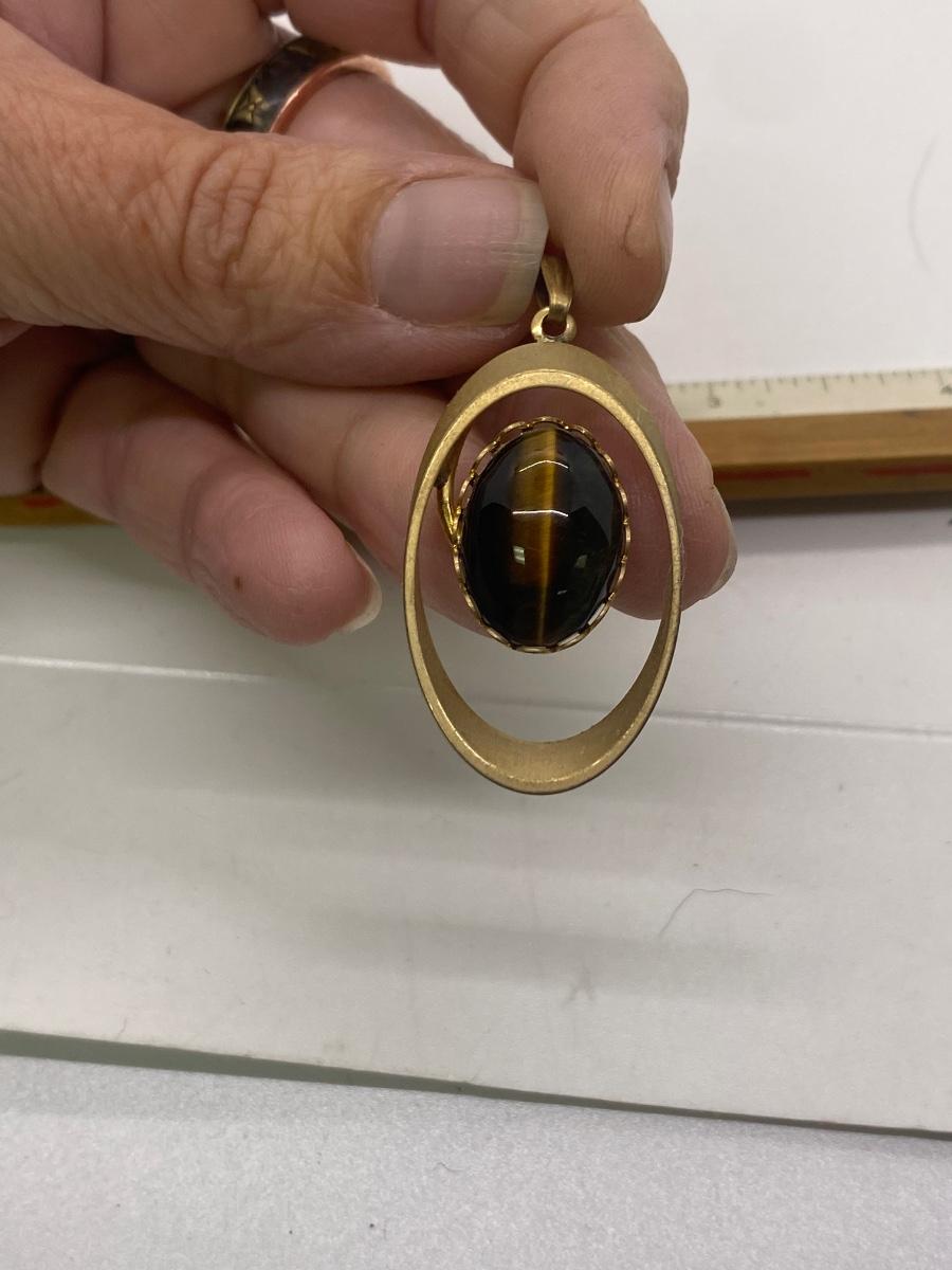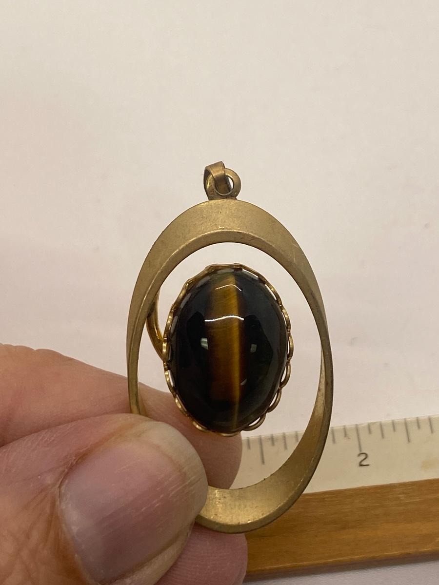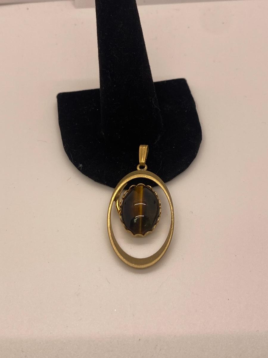Vintage Retro Mid Century Gold Tone Pendant with Tigers Eye Cabochon. Good condition. Unsigned.