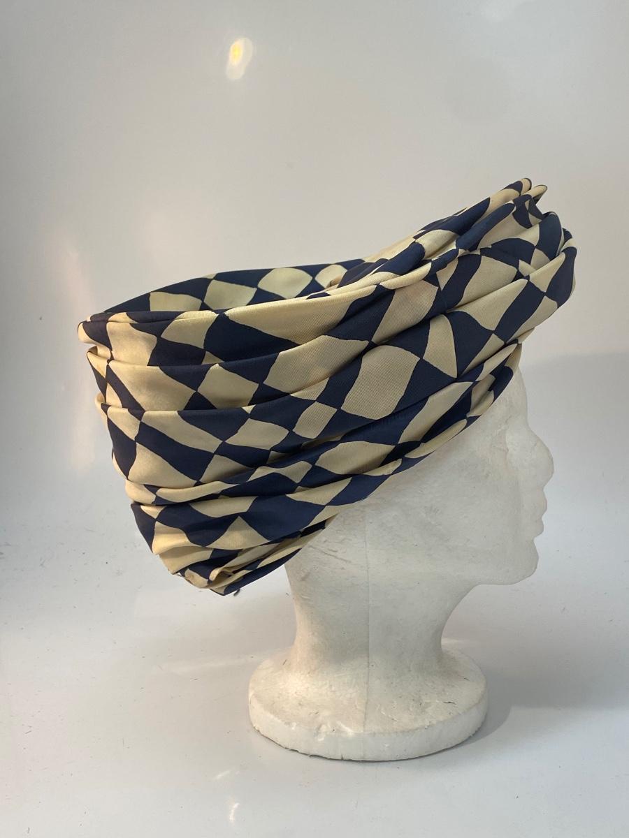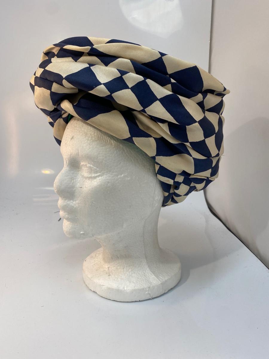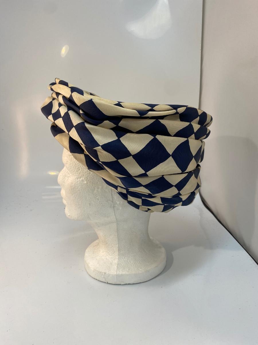 Vintage Retro Mod Blue and White Checkered Slouched Turban Style Hat