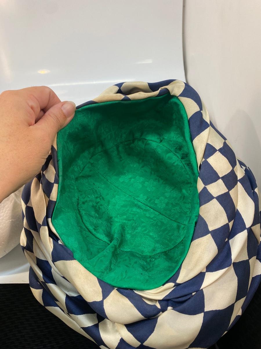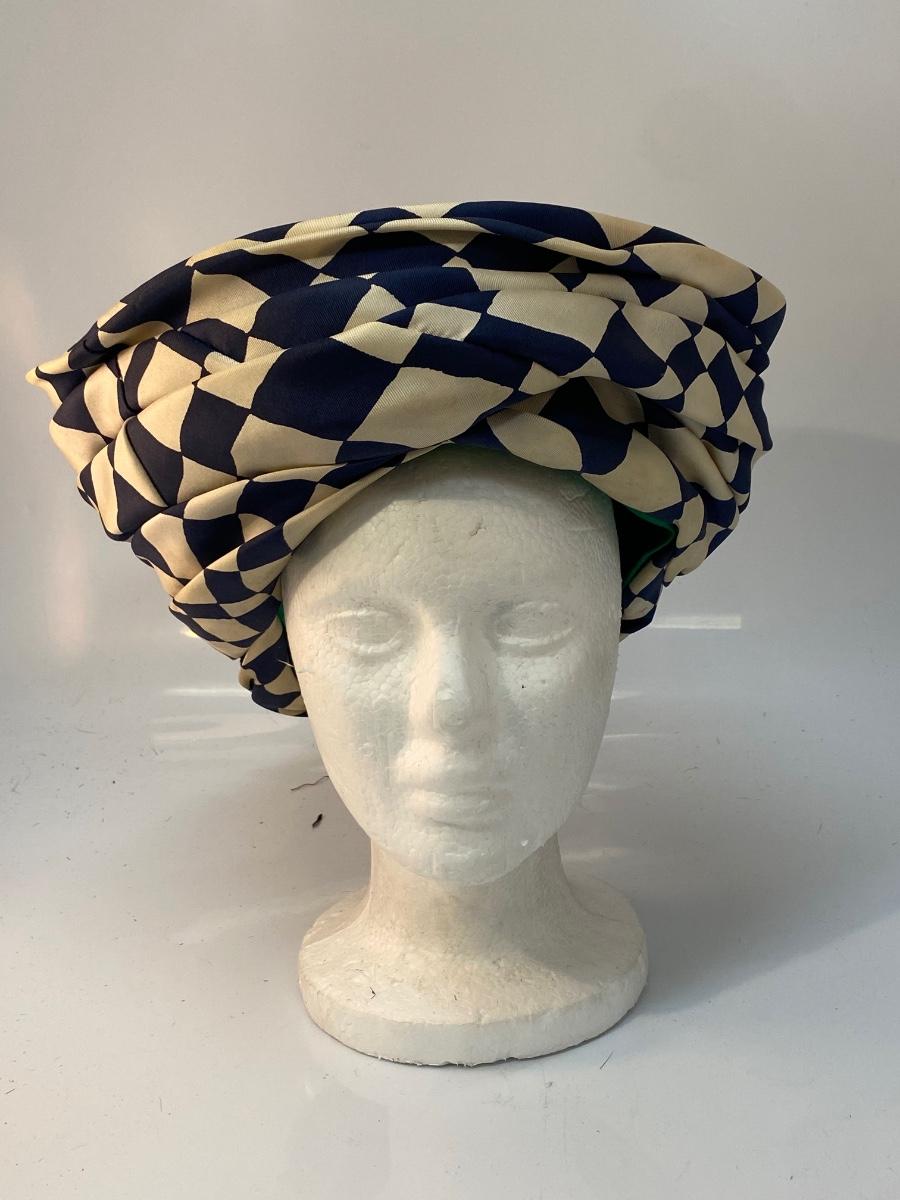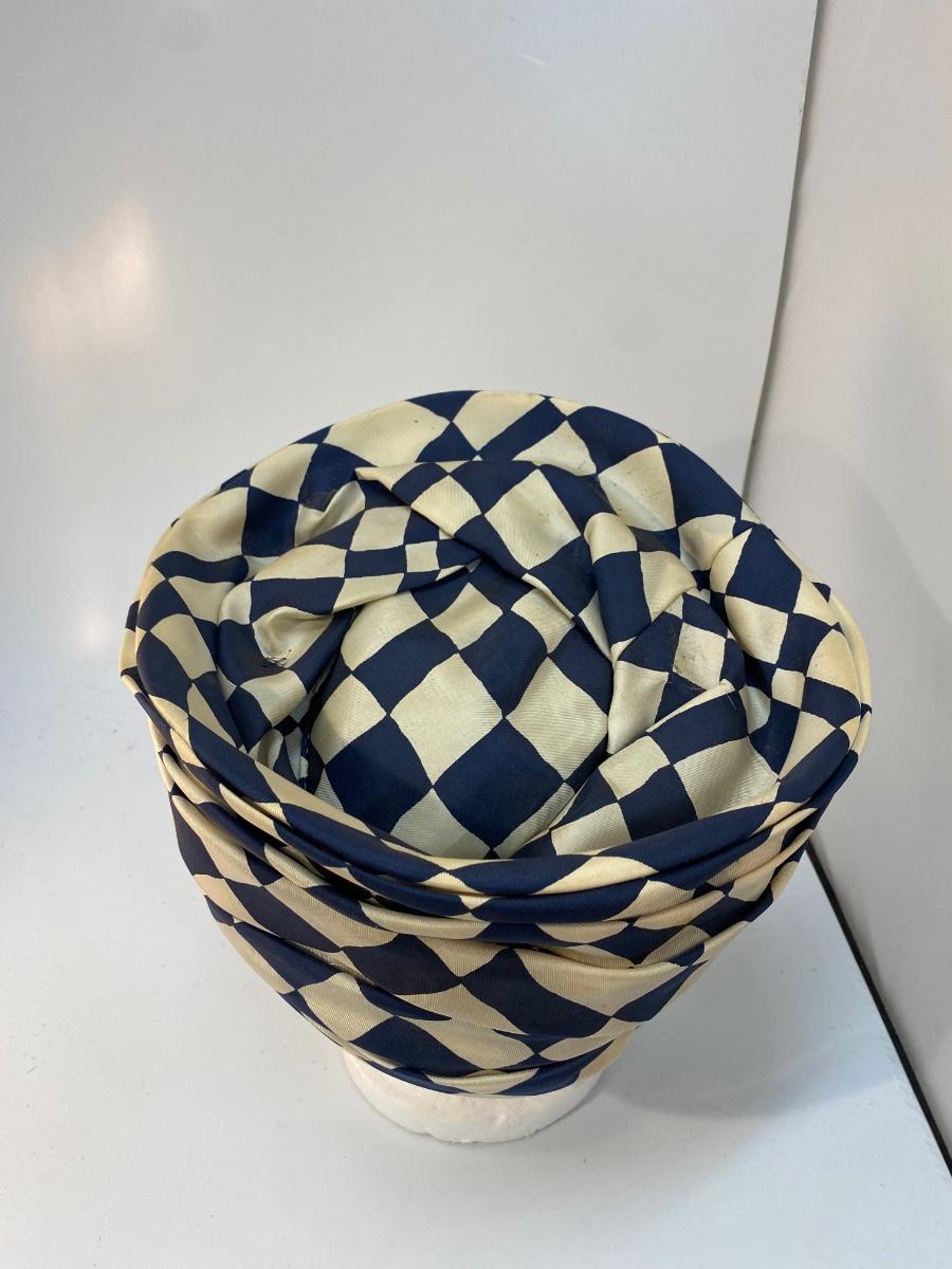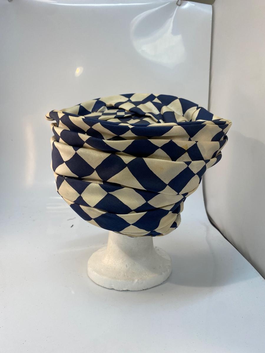 Vintage Retro Mod Blue and White Checkered Slouched Turban Style Hat. There is some slight discolor from age but in overall good condition.