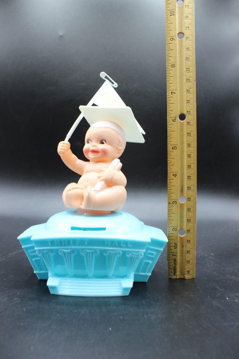 Vintage Retro Plastic Graduation Baby Thrift Hall Coin Bank, there is no significant damage to the plastic coin bank and is in good condition. Check pictures for more details and for sizing, there is already a $5 bill inside the coin bank.