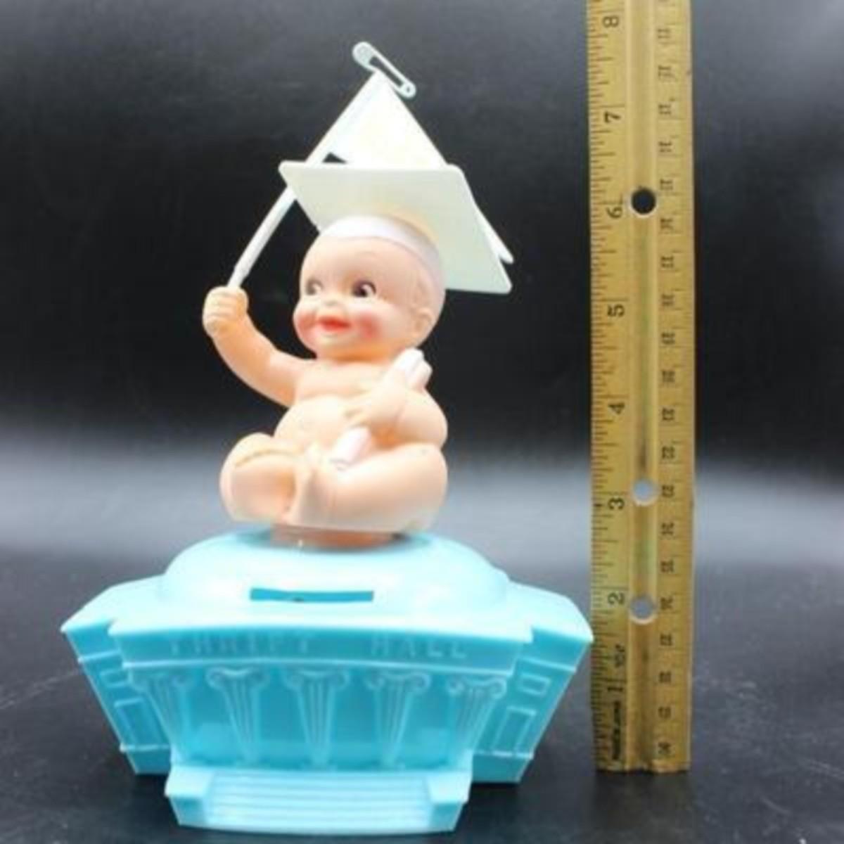 Vintage Retro Plastic Graduation Baby Thrift Hall Coin Bank, there is no significant damage to the plastic coin bank and is in good condition. Check pictures for more details and for sizing, there is already a $5 bill inside the coin bank.