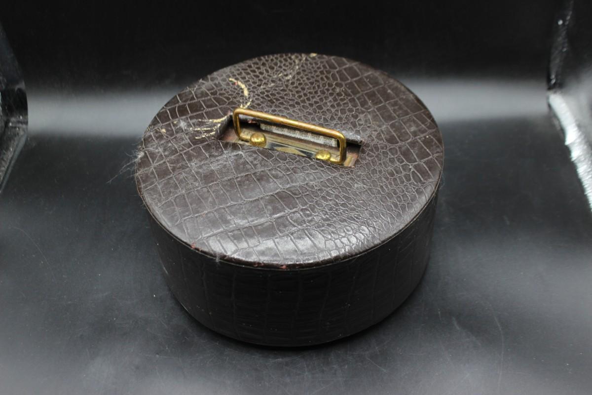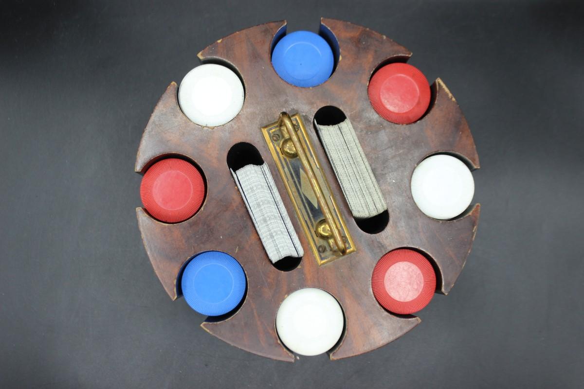 Retro poker night chip and card caddy. Good used vintage condition. Faux leather cover needs to be cleaned a little.
