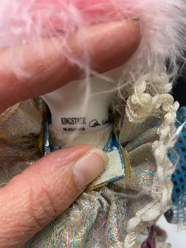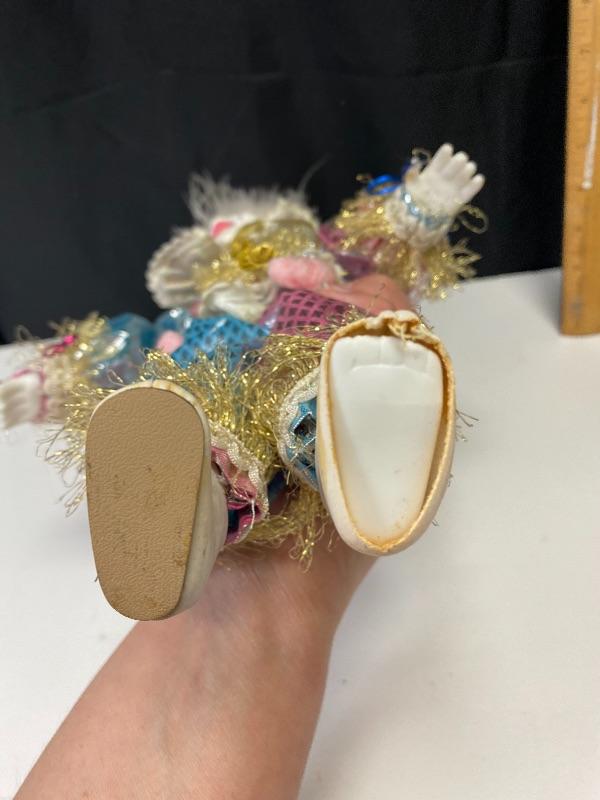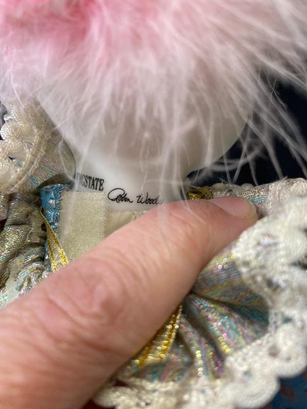 Retro 1980s 1990s Robin Woods pink and blue circus clown. Signed on back of neck. stands 17" at the top of hat. In good condition, a couple smudges. Bottom of one shoe is missing. Hat could be glued back down in spots.