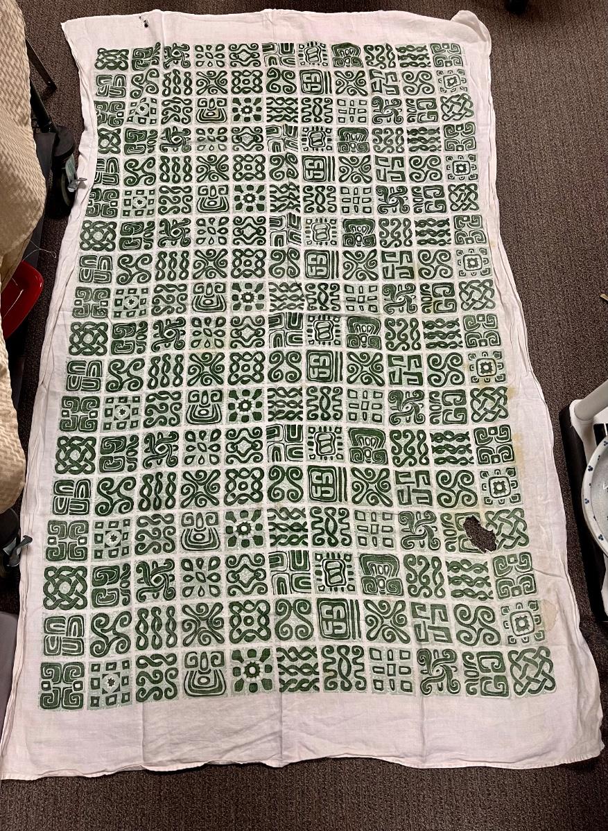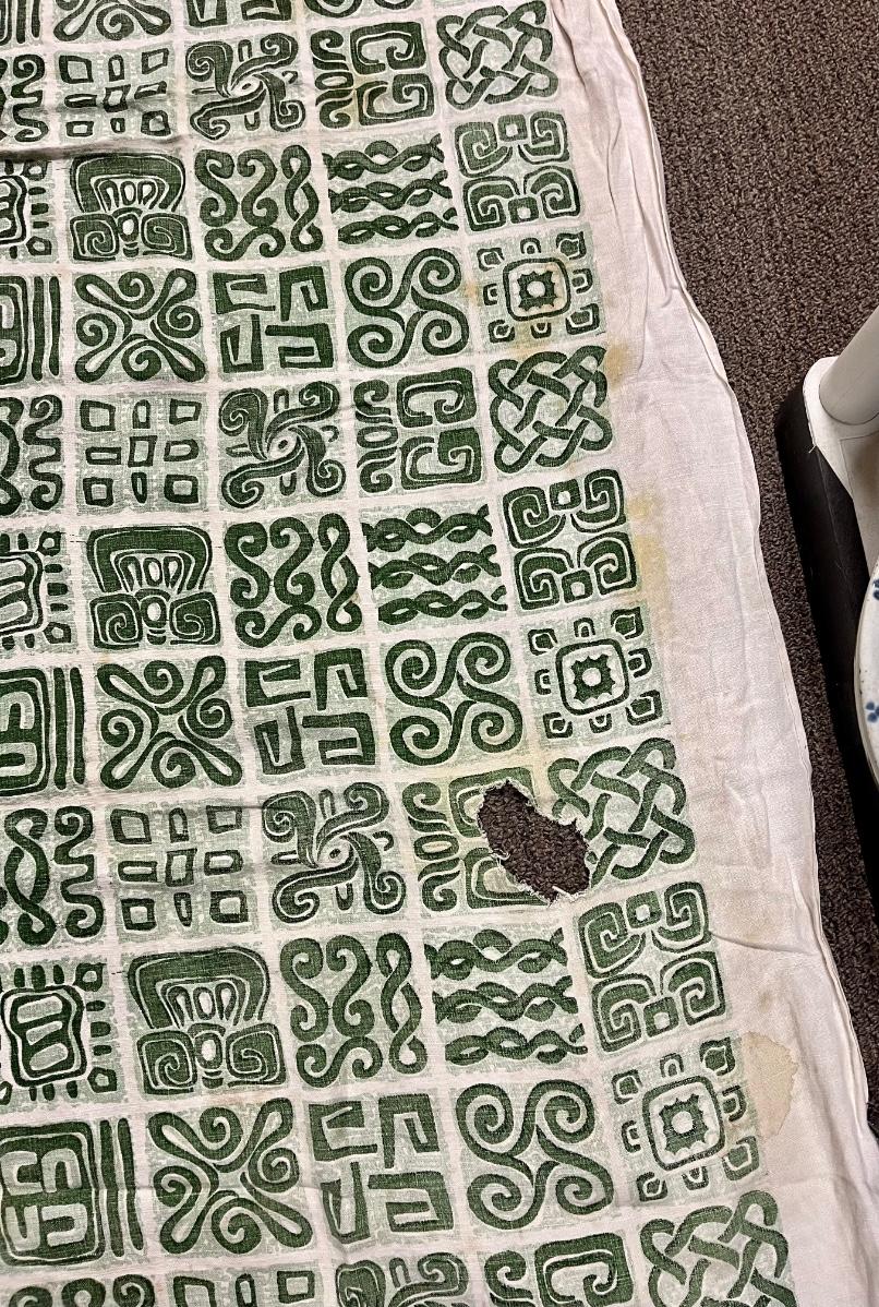 This was too cool to pass by. This tablecloth has seen better days, but we thought someone would be interested in repurposing it. Measures roughly 47” x 75”