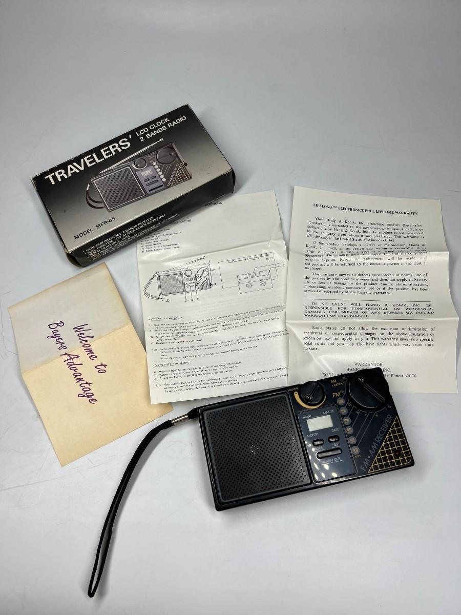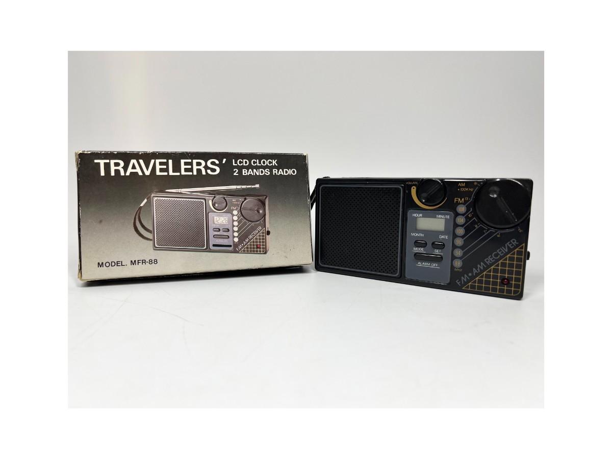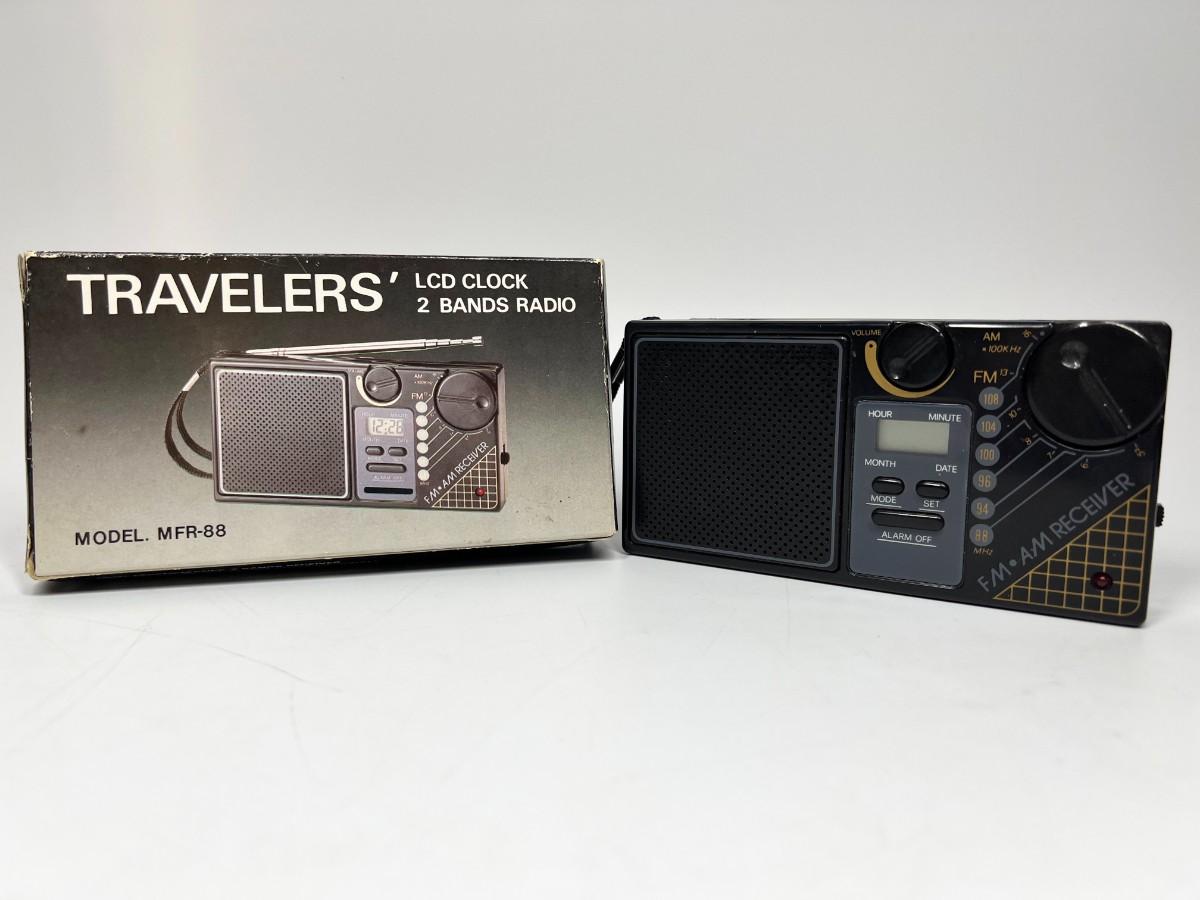 Retro Travelers' LCD Clock with 2 bands radio. Comes in original box. Battery operated. Untested.