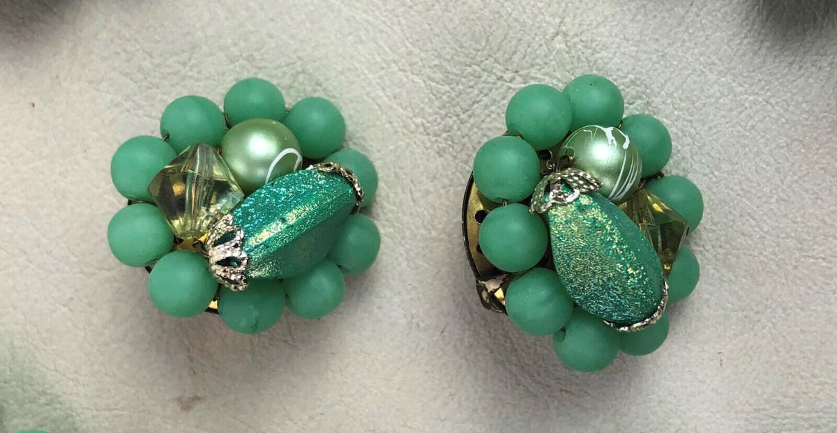 Adjusts from 15-17" on this vintage triple strand cocktail necklace from the Mid Century...Excellent condition on the necklace..several textures on the variety of plastic beads..includes matching clip-on earrings in this vintage estate set...some plate wear on inside of earrings...Unknown maker? Made in Japan circa 1950's