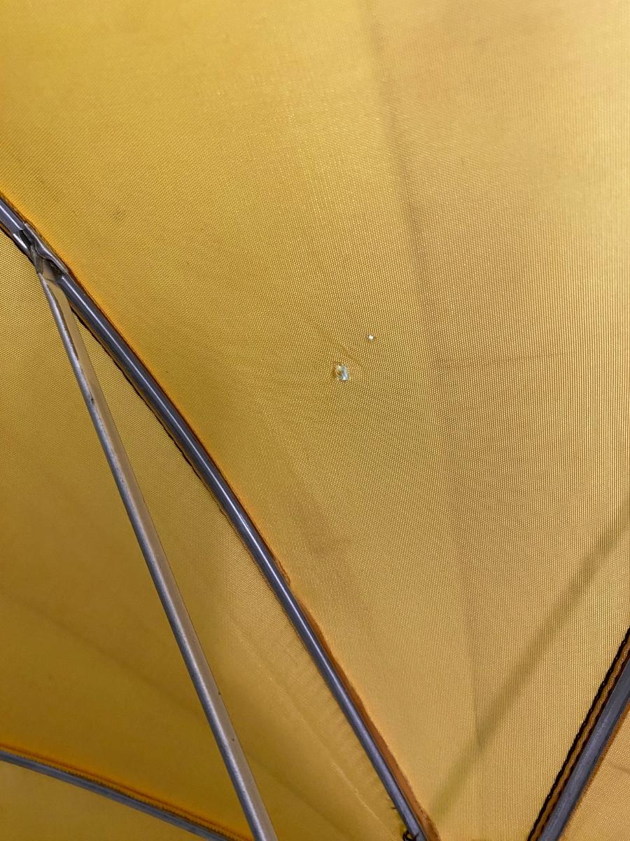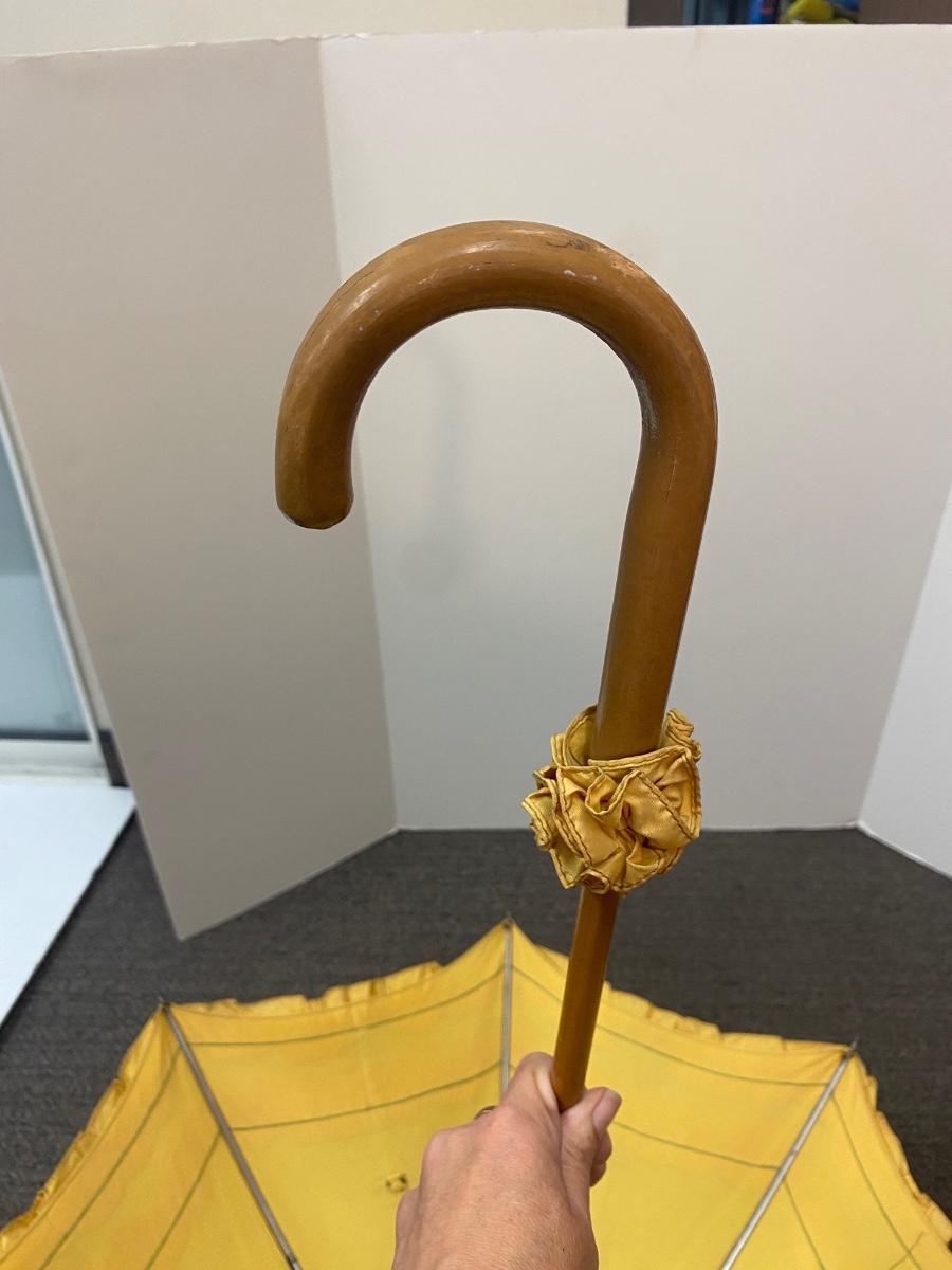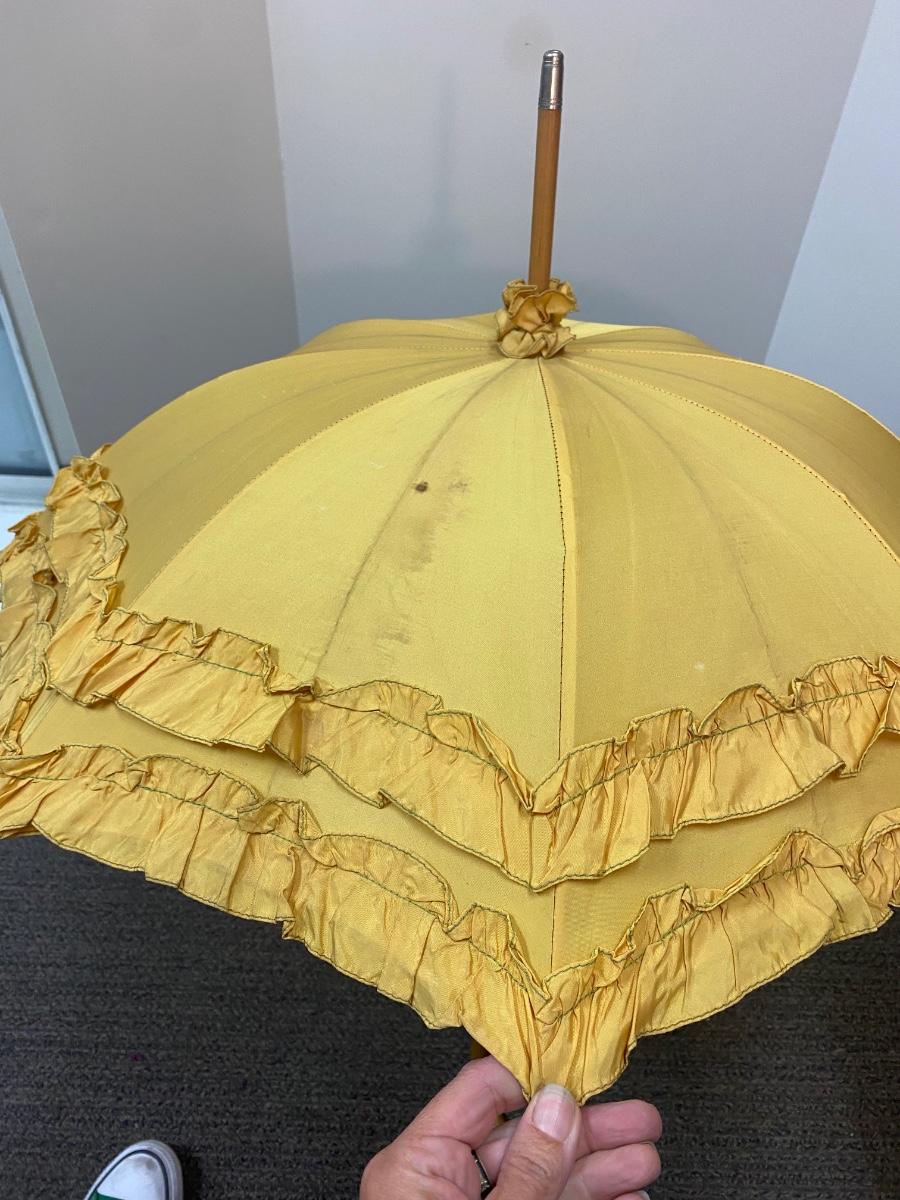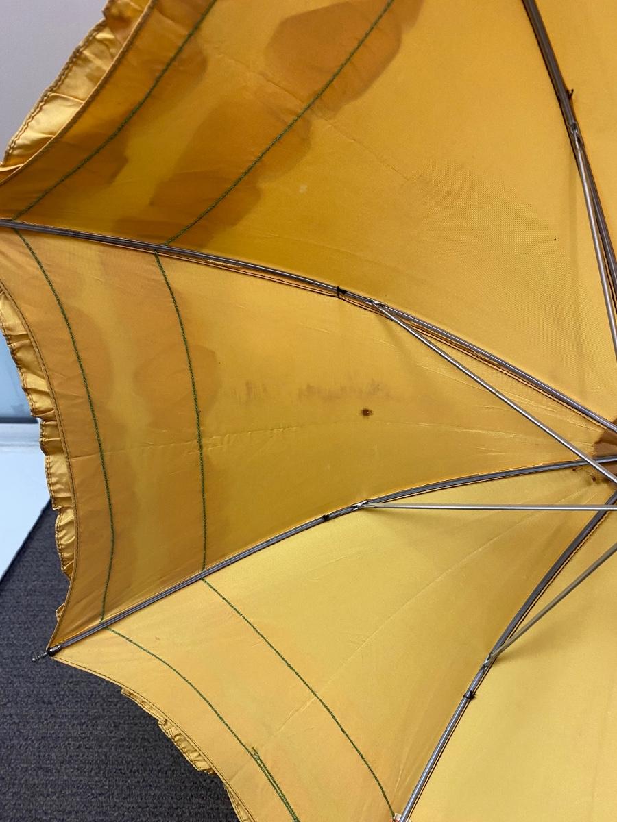 Vintage Retro Yellow Gold Ruffled Nylon Parasol Umbrella. Some discolor from age and a tiny hole. Opens and closes nicely.