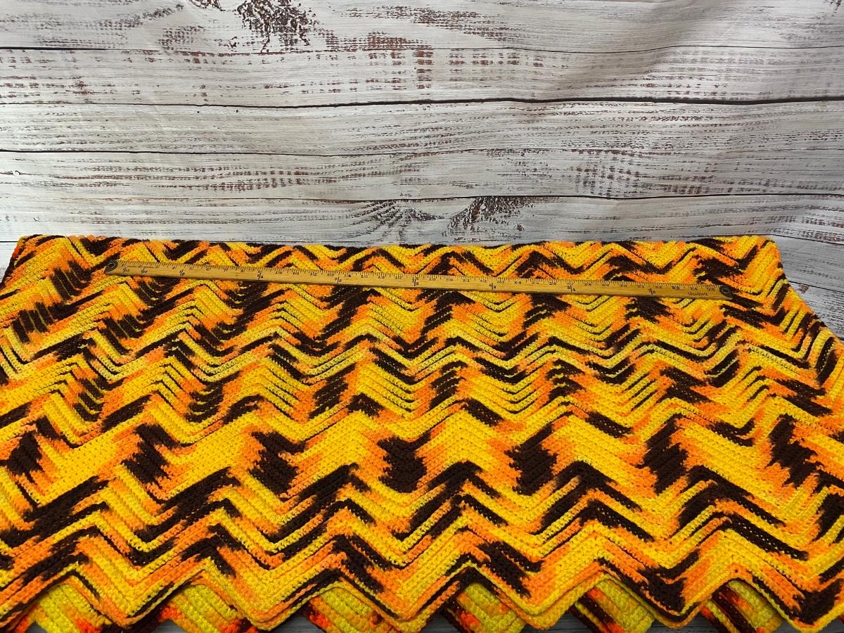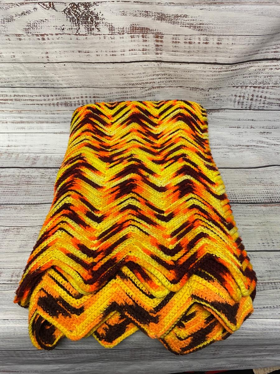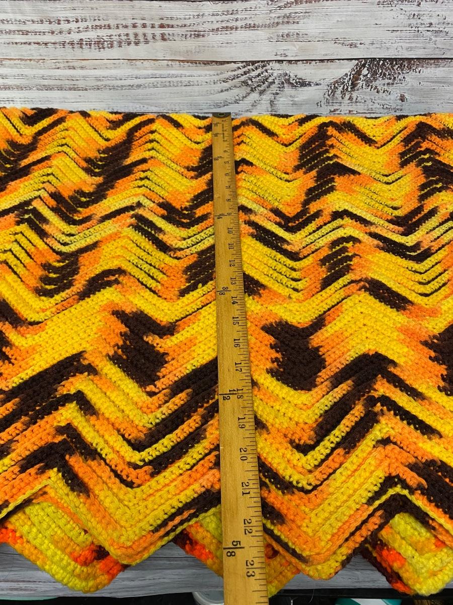 Vintage Retro Yellow Orange Brown Zig Zag Crochet Knitted Blanket