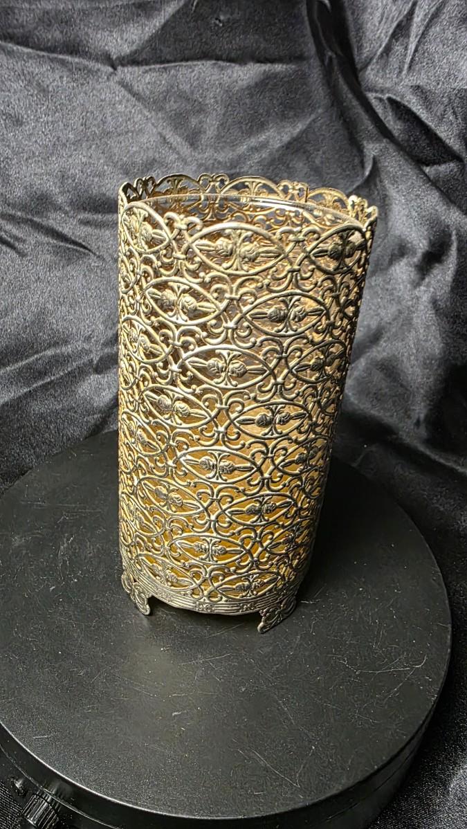 The original glass candle insert remains inside, bearing its Revlon “Intimate” label — a detail that confirms authenticity and preserves the piece’s collectible identity. The filigree frame features repeating scroll and floral motifs, a scalloped rim, and petite feet that elevate the form with subtle elegance. The overall effect is classic Hollywood Regency — ornamental, radiant, and unapologetically decorative.