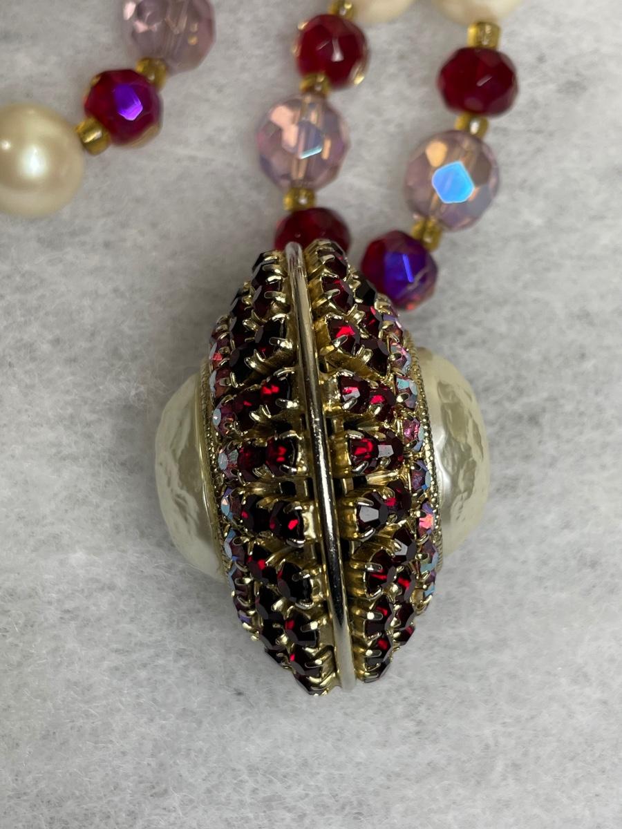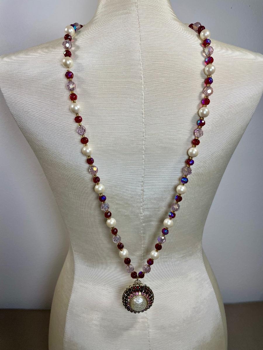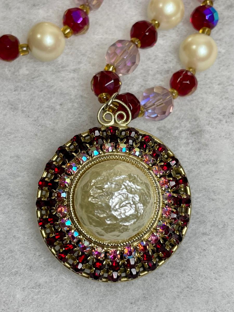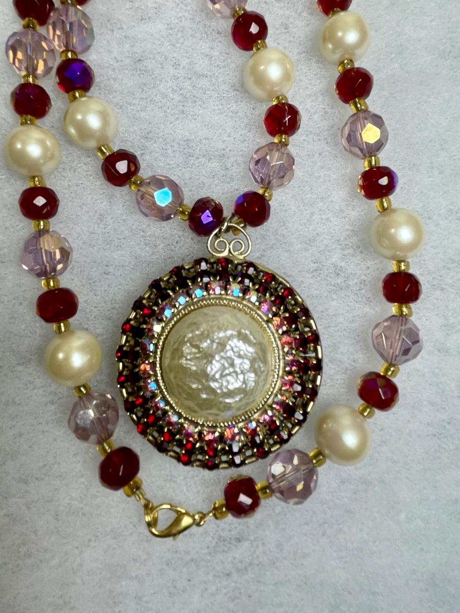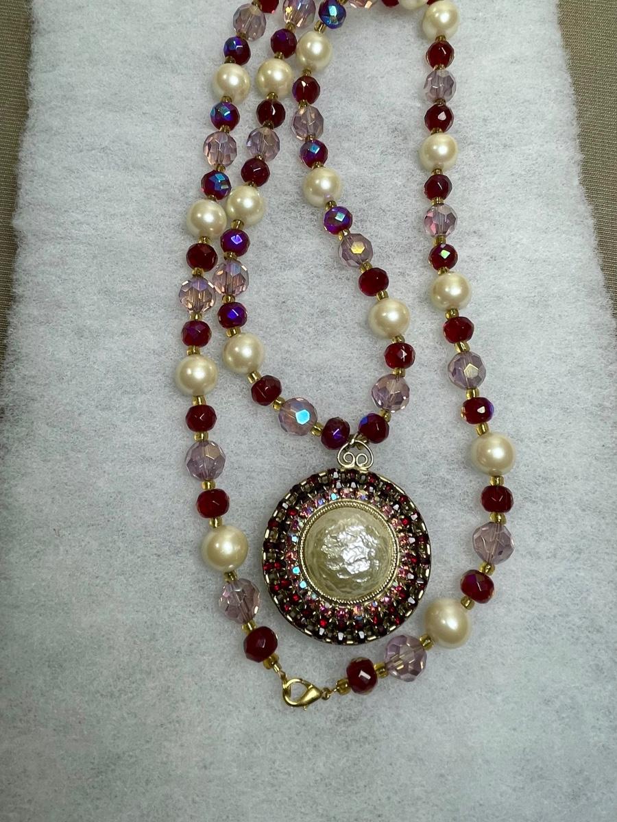 Vintage pendant added to restrung 40 inch beaded necklace with pink and red glass beads.