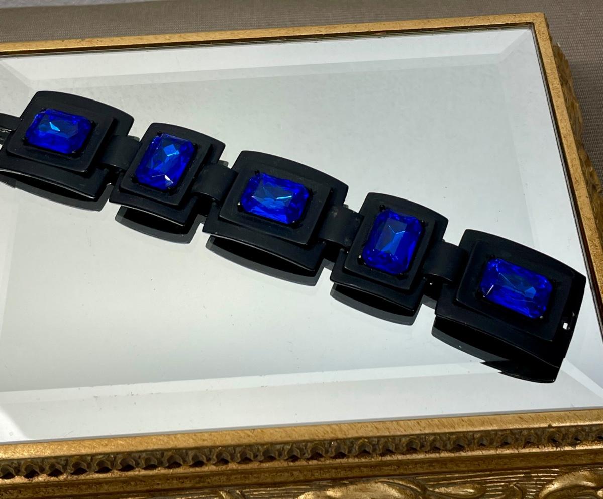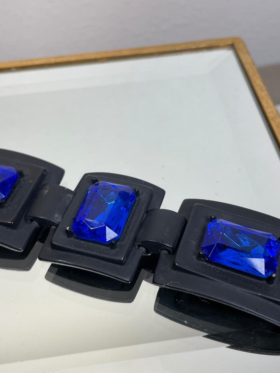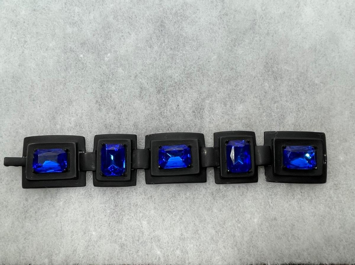 Huge blue rhinestones in matte black Japanned metal links. 7 inches long in excellent condition.