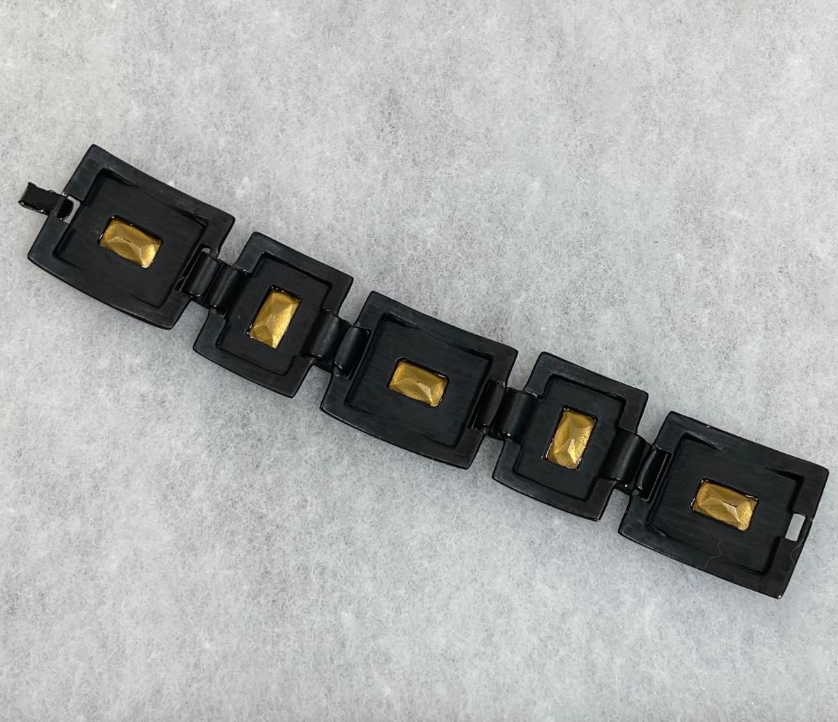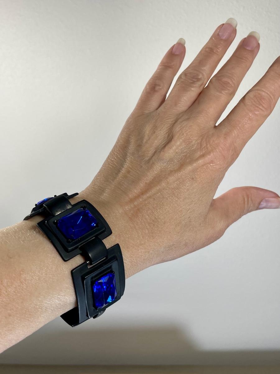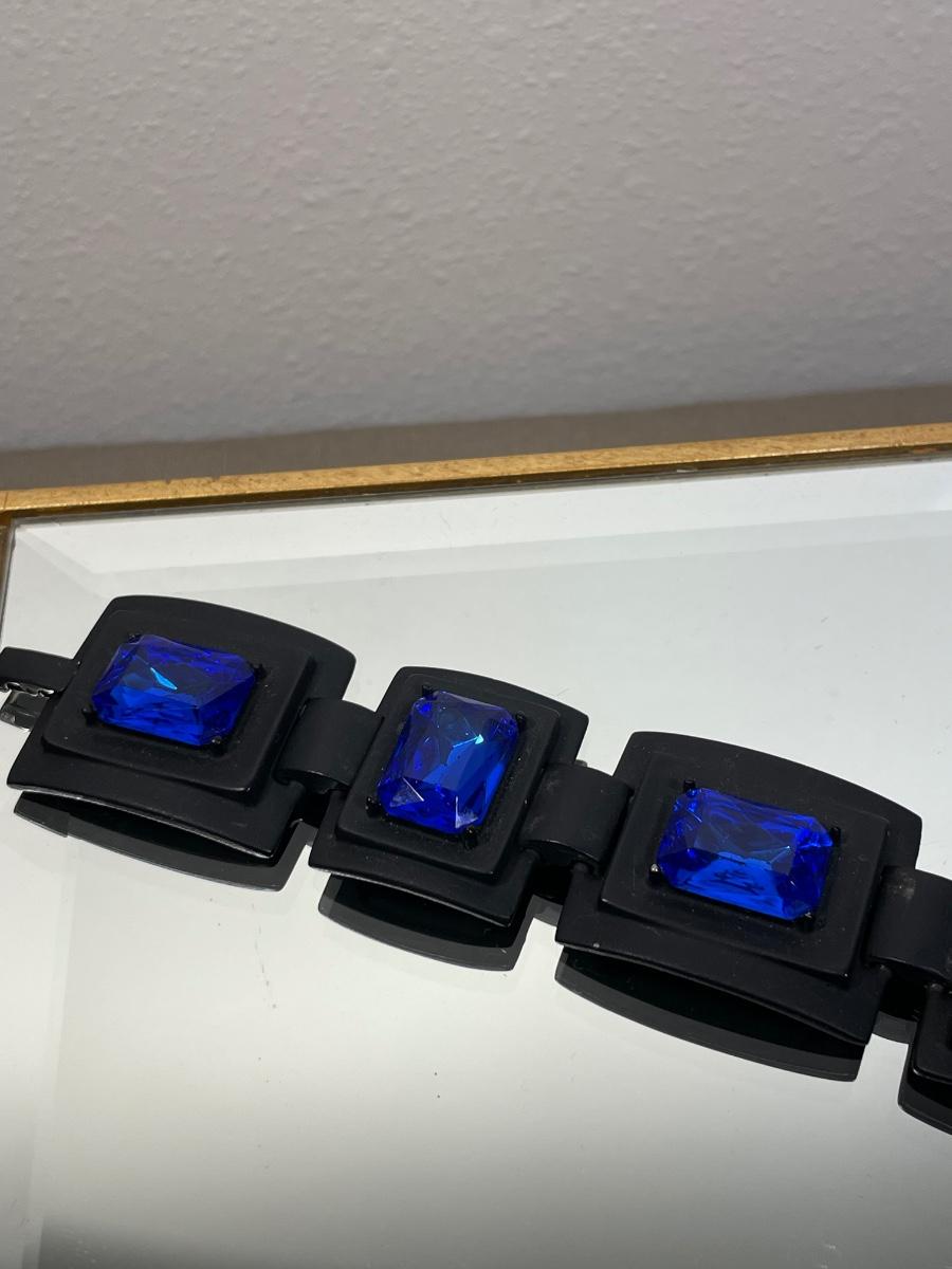 Huge blue rhinestones in matte black Japanned metal links. 7 inches long in excellent condition.