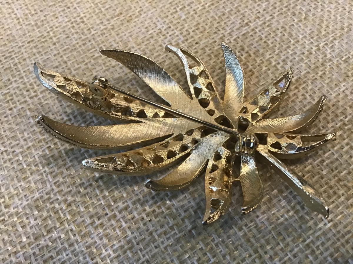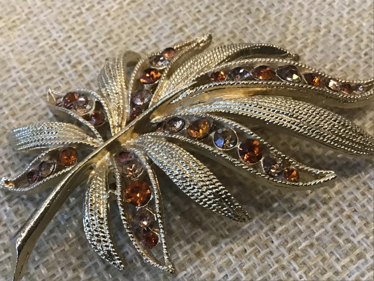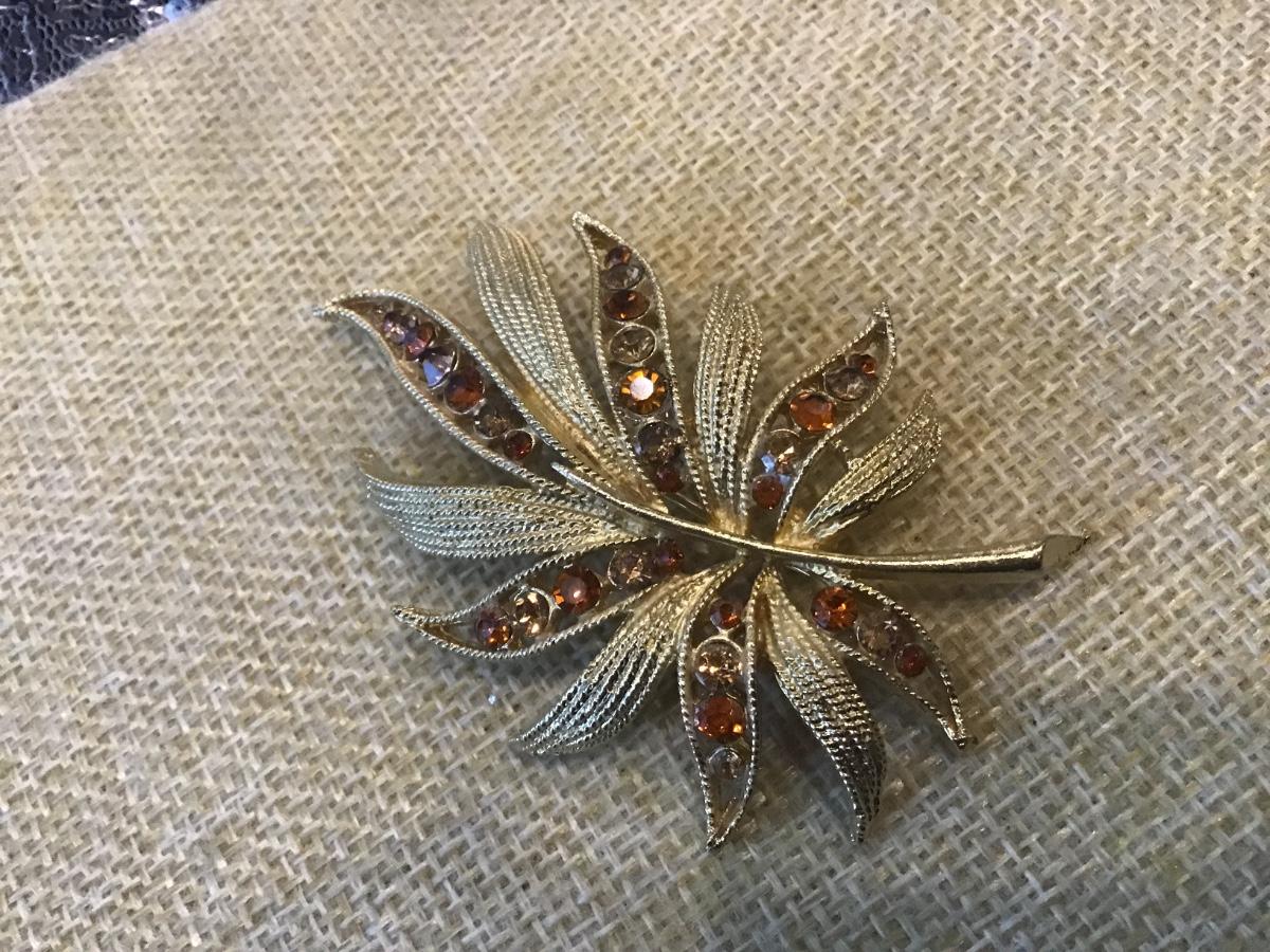 VINTAGE RHINESTONE BROOCH GOLD TONE WITH AMBER STONES