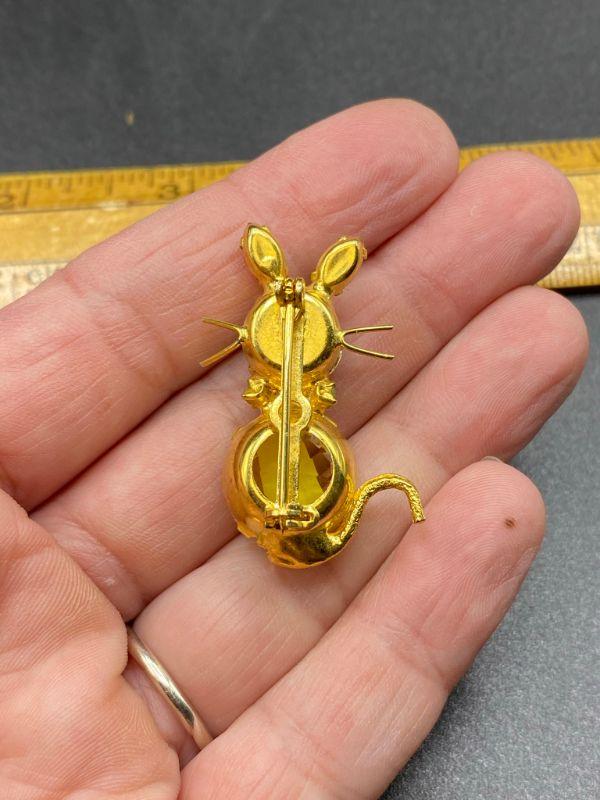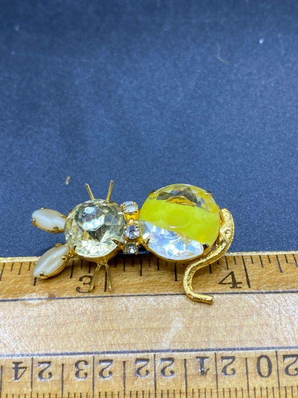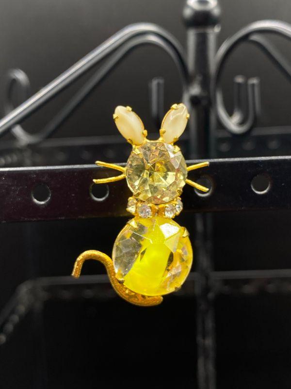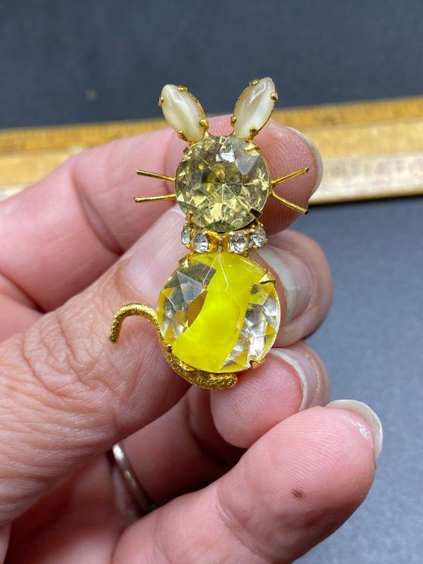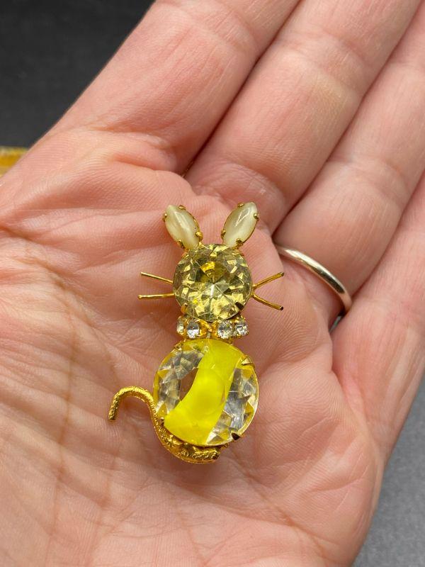 Vintage rhinestone cat pin. Gold tone setting with clear and yellow rhinestones. The body crystal has a yellow swirl through it. About 1.5" size.