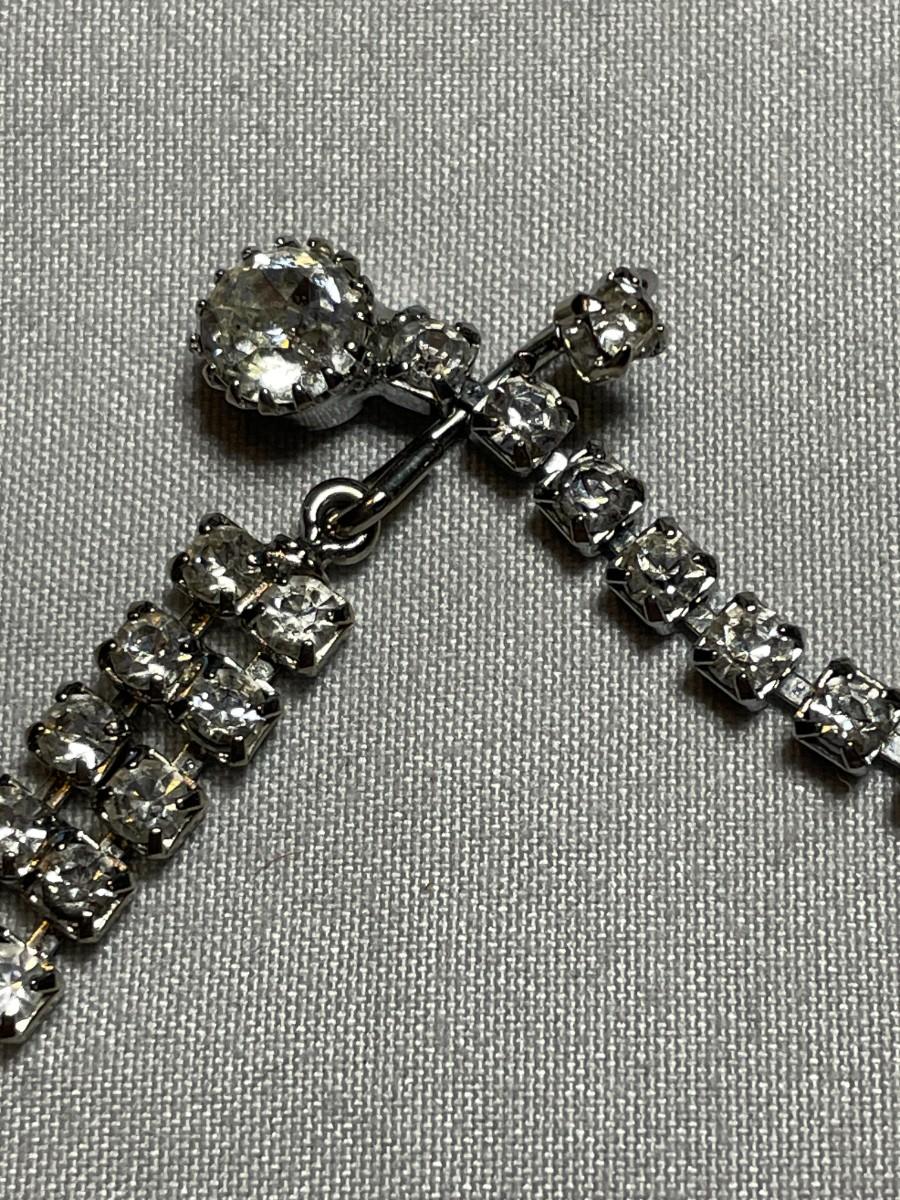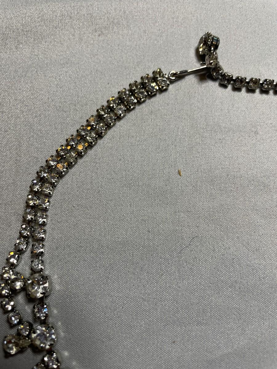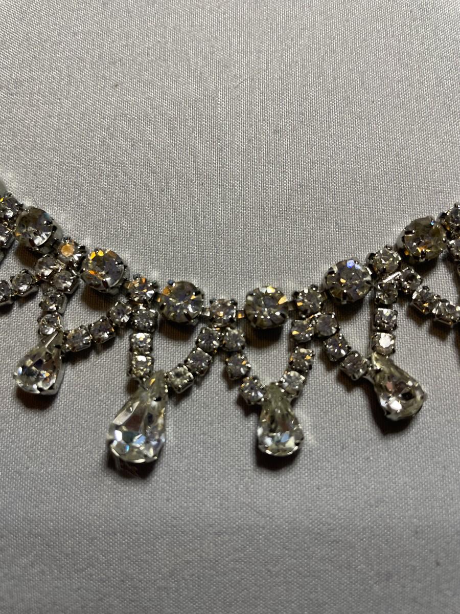 This sparkler is about 16 inches long and in excellent condition. It is made of a silver colored metal with pear shape and round faceted rhinestones.