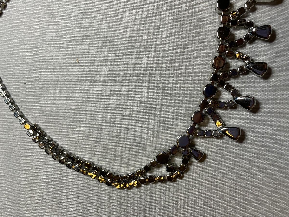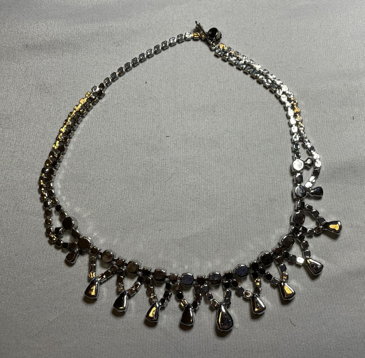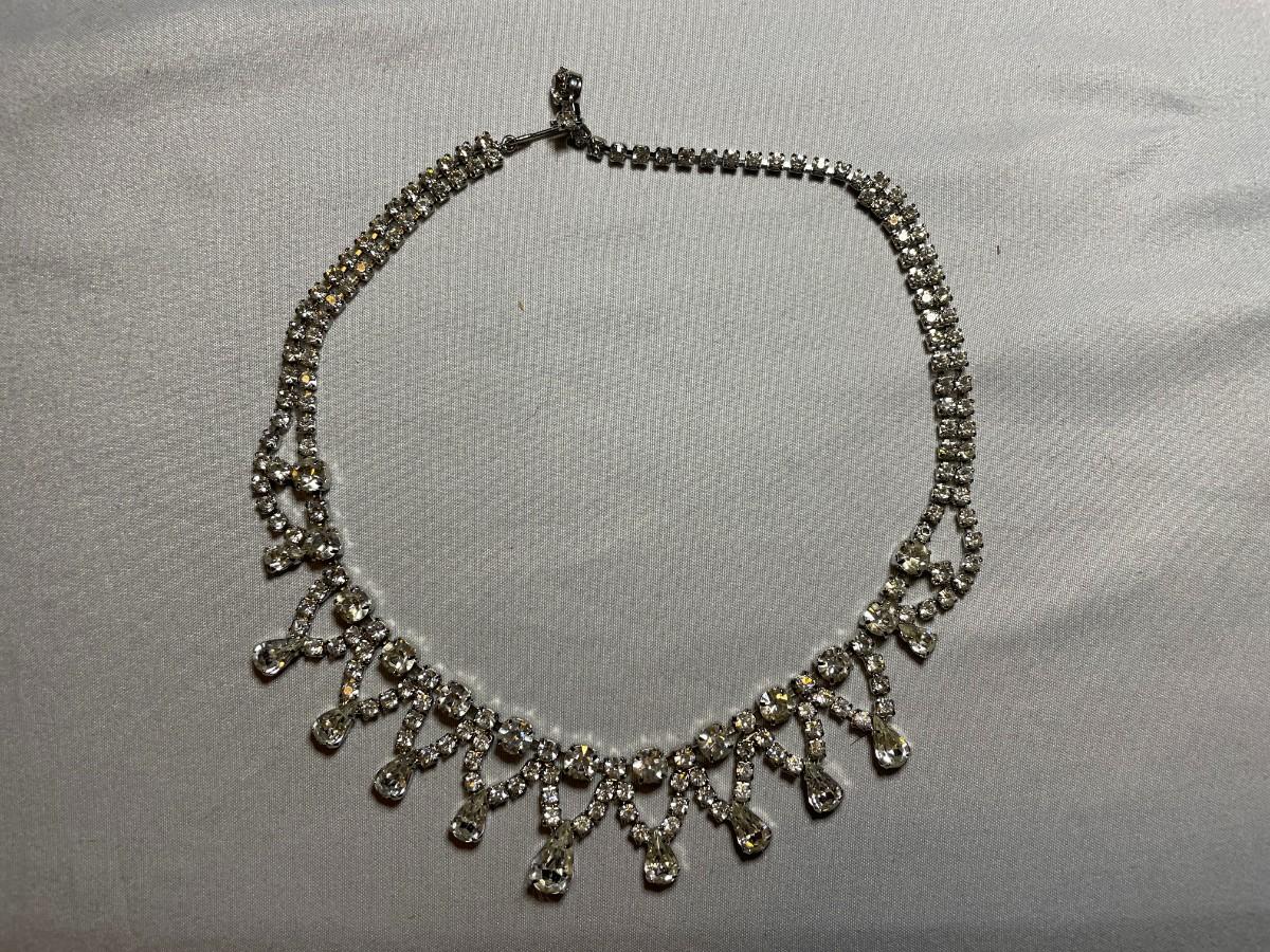 This sparkler is about 16 inches long and in excellent condition. It is made of a silver colored metal with pear shape and round faceted rhinestones.