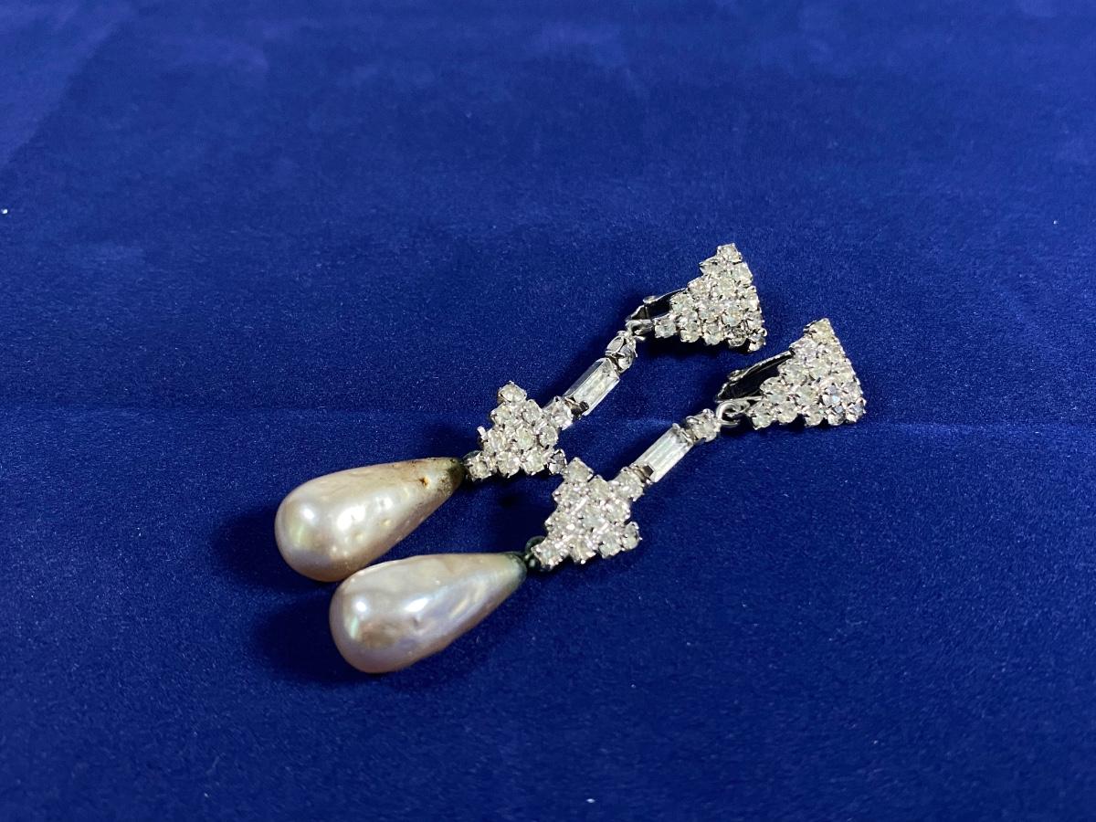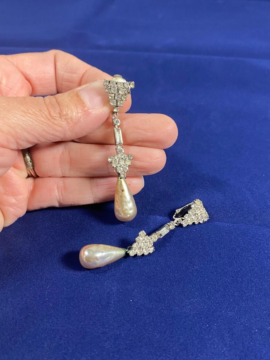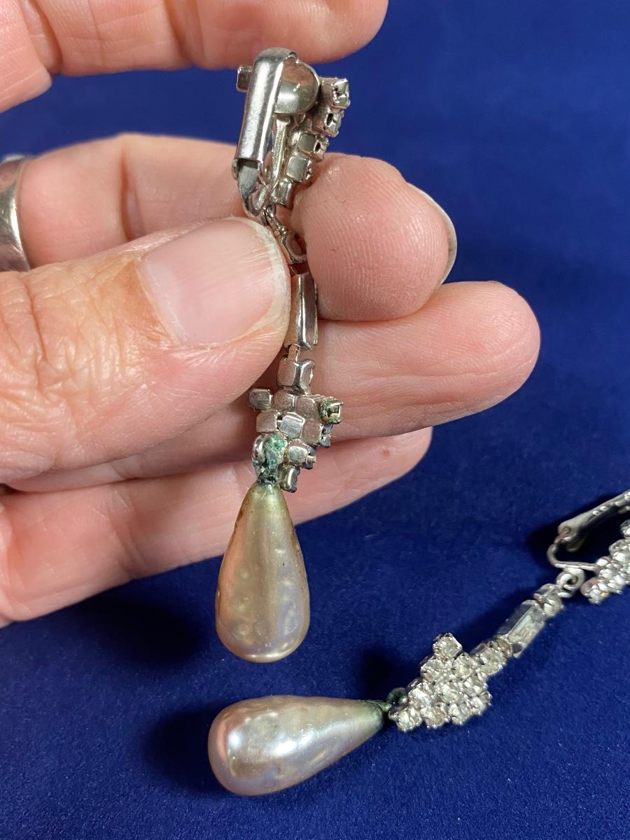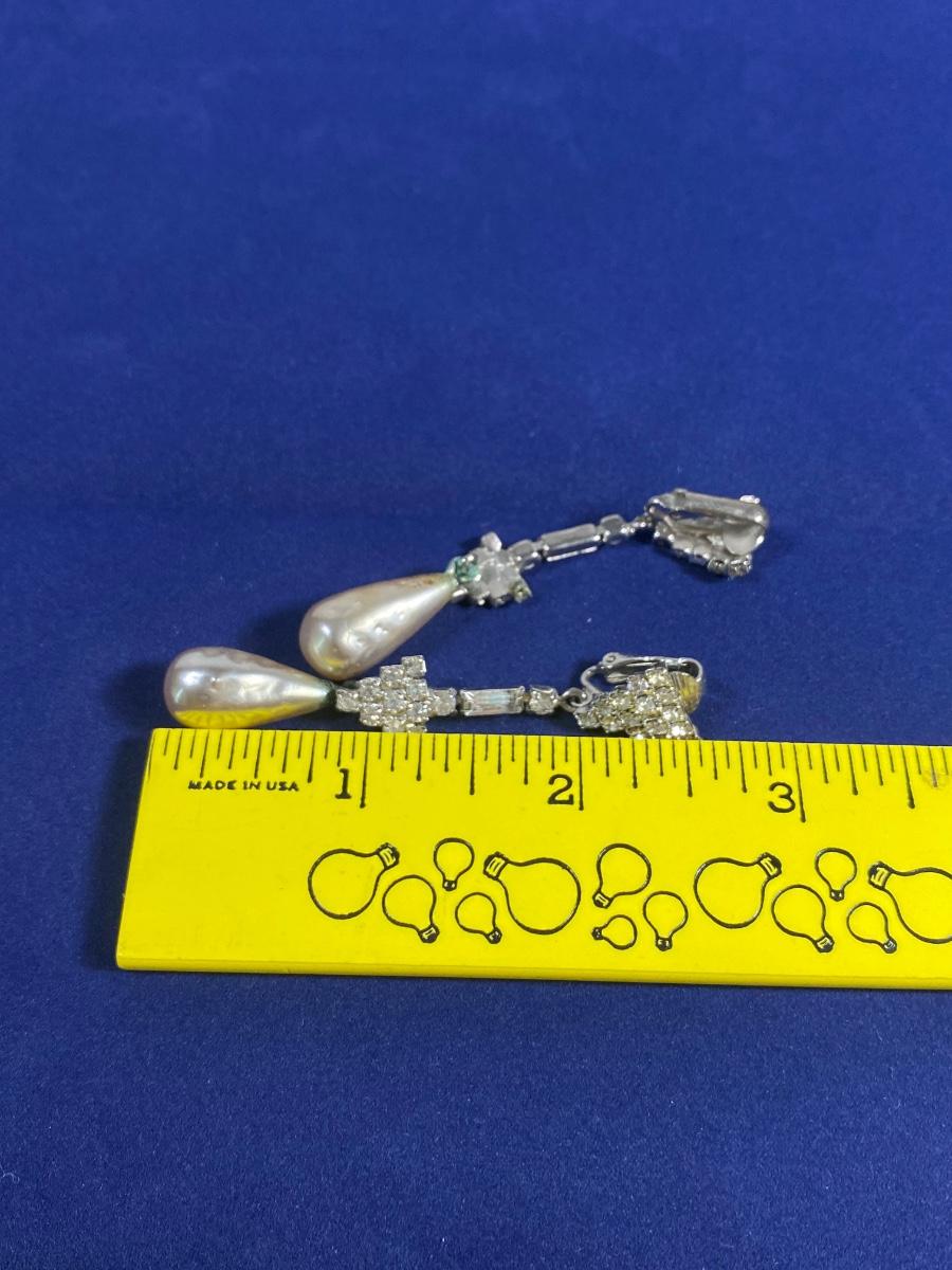 Vintage Rhinestone Clip On Tear Drop Pearl End. In good vintage condition. Some light signs of age. About 2.5" length. Unbranded.