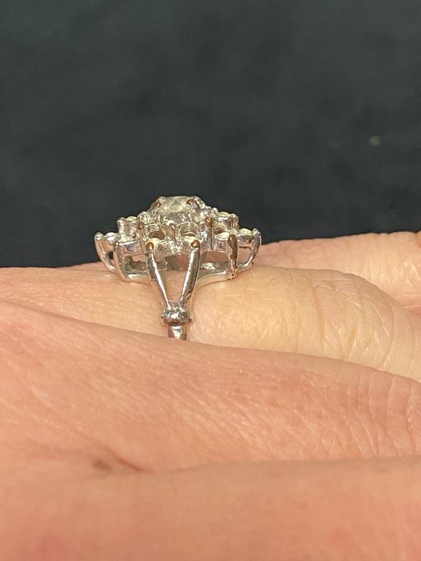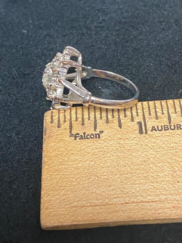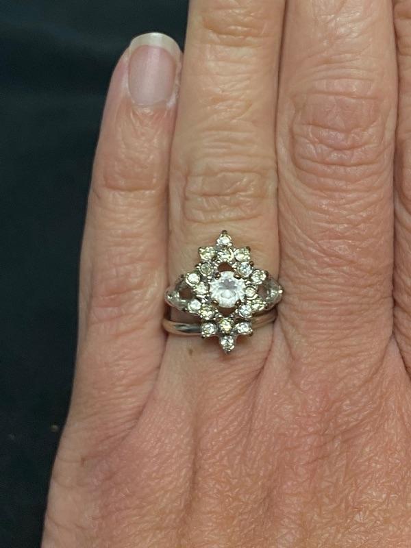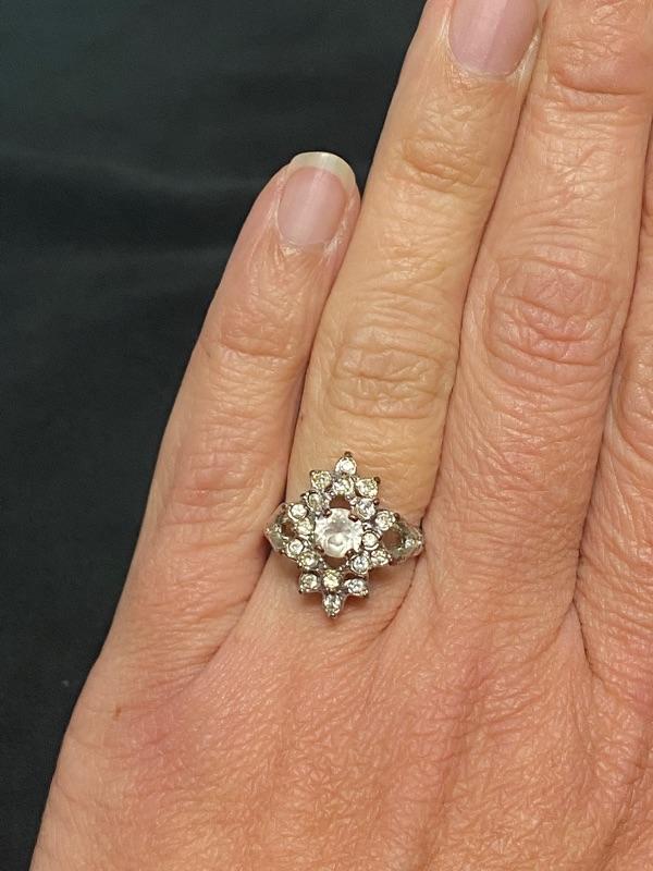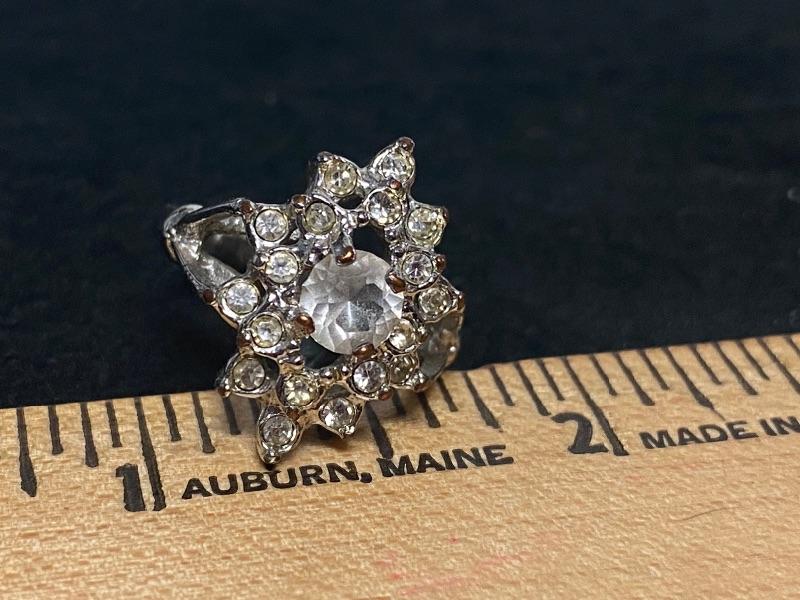 Vintage rhinestone cluster ring. Silvertone setting with clear stones. Metal does show some wear along edges. Size 6.